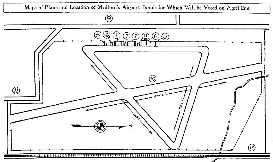airport improvements.ON MEDFORD PORT PLANS He was here today for conferences with federal officials concerning the WPA grant for air facility improvement at Medford. "The 1937 model transports will have 150-foot wingspan, and the enlargement program is necessary," Mayor Porter said. "Medford plans to be ready for the improved airliners. A complete floodlighting and spotlighting system will be installed in accord with the most modern airport practice if the improvements are authorized." Medford proposes to lengthen the main runway from 3600 feet to 5500 feet and widen it to 200 feet. A good pear year helped Medford this year, said A. H. Banwell, secretary of the Jackson County chamber of commerce, who was with Mayor Porter. Medford Mail Tribune, December 22, 1935, page 3 BEACON HILL IS FINALLY SCALED