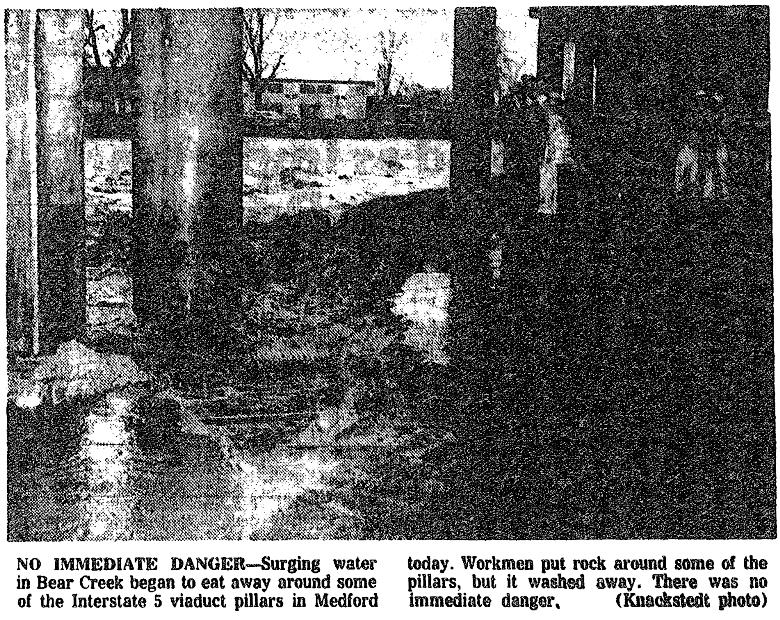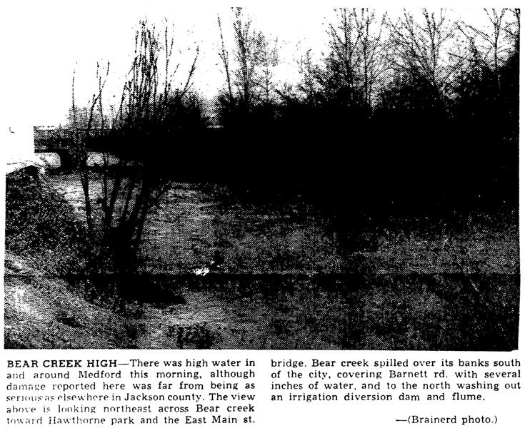City crews were at the site this morning in preparation to dumping riprap into the five-foot-wide hole. The concrete bridge, including sidewalks, remains secure, Vernon Thorpe, city public works director, stressed. The soil at the east end of the bridge washed out, leaving the asphalt surfacing, which had to be cut out by crews this morning. Riprap of one-ton rocks was being placed under the Main Street bridge today as a precautionary measure to protect two 12-inch water mains in the area. One runs parallel to Main Street and the other to Bear Creek, according to Bob Lee, city water department manager. The rock is being brought from Roxy Ann, Lee said. Thorpe said this morning that water on Stewart Avenue between King Street and Oakdale Avenue reached a critical point early this morning, but was picked up by nearby catch basins before flooding became a problem. Water in the Mace Road area Tuesday originated west of the railroad tracks, Thorpe said. Some sandbagging of homes in the McAndrews Road and Corona Avenue area was reported this area. Excerpt, Medford Mail Tribune, December 22, 1964, page 11 ![]() Medford Mail Tribune, December