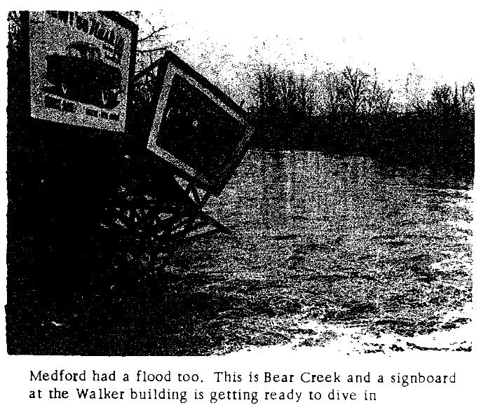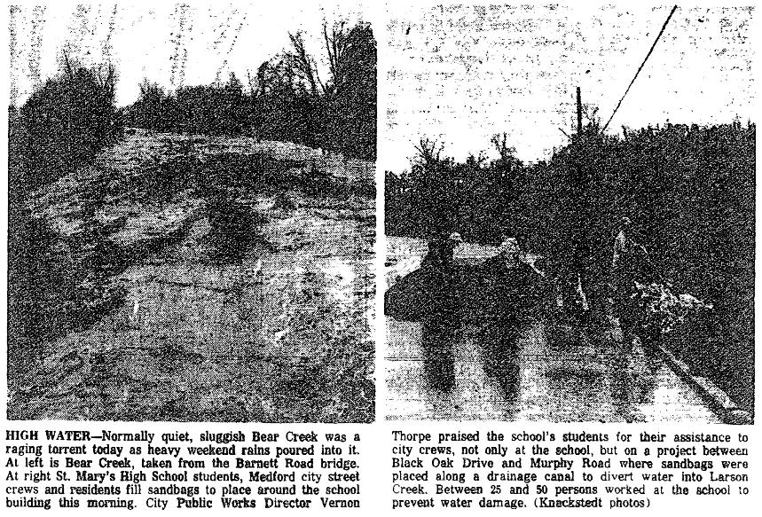 The greatest threat in the Medford area was to St. Mary's High School, where Larson Creek overflowed its banks. Fed by the runoff from the neighboring hills, the stream left the Ellendale Drive bridge under water and slushed through the front door of the school. Immediate action by the city public works department, the Rev. John J. Keane, principal of the school, and students was believed to have the situation under control, Vernon Thorpe, city engineer, reported. Sandbags were placed at all strategic points, and drainage ditches were being dug to carry off the surplus water. Lazy Creek was flooding at Highland Drive and Crestbook Road. City crews and county crews started work at an early hour this morning to combat the onslaught of the storm, which brought .65 inches of rain to Medford during the 24 hours ending at 10 o'clock. The rainfall for the 48 hours was 1.85 inches. The North Mountain Avenue bridge over Bear Creek has been closed because of the flood threat. County Engineer Robert Carstensen listed heavy flooding on Myer Creek, north of Ashland, and on Butler Creek. Bear Creek, he said, was reaching the threatening stage at Valley View Bridge. Excerpted, Medford Mail Tribune, December 21, 1964, page 1 ![]() Medford Mail Tribune, December