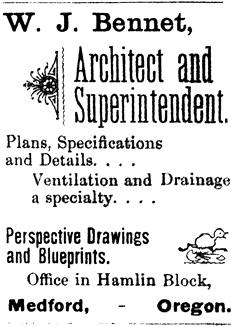 July 31, 1893 through February 28, 1895Architect and Draughtsman. Office Up stairs in Abraham’s building. Plans, specifications and details furnished on application. ROSEBURG, OREGON (There's a gap in the Roseburg papers previous to July 31, 1893, so it's unknown when Bennet's ad began its run--or when Bennet arrives in Roseburg. At some point, the ad changes to read "Office: In the county surveyor’s office.") Architect W. J. Bennet is building a neat dwelling house on the heights in Flint's addition. Roseburg Review, July 31, 1893, page 3 W.
