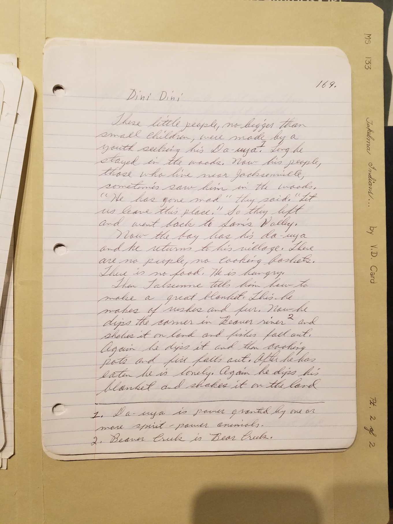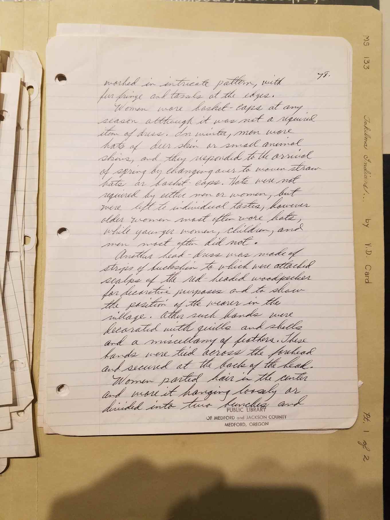went back to Sams Valley. Now the boy has his da-uya and he returns to his village. There are no people, no cooking baskets. There is no food. He is hungry. The Talsunne tells him how to make a great blanket. This he makes of rushes and fur. Now he dips the corner in Beaver river [Beaver Creek is Bear Creek.] and shakes it on land and fishes fall out. Again he dips it and then cooking pots and fire falls out. After he has eaten he is lonely. Again he dips his blanket and shares it on the land [Page 170] and little people fall out. Thus were Dini Dini brought forth. Now far off in Sams Valley the people see his fire smoke. "He is not dead. He is not mad. No mad man catches fish and cooks them," his mother speaks. Then his people go back to their village and he is no longer lonely. All the Dini Dini are afraid of his people and so they hid in the forest.