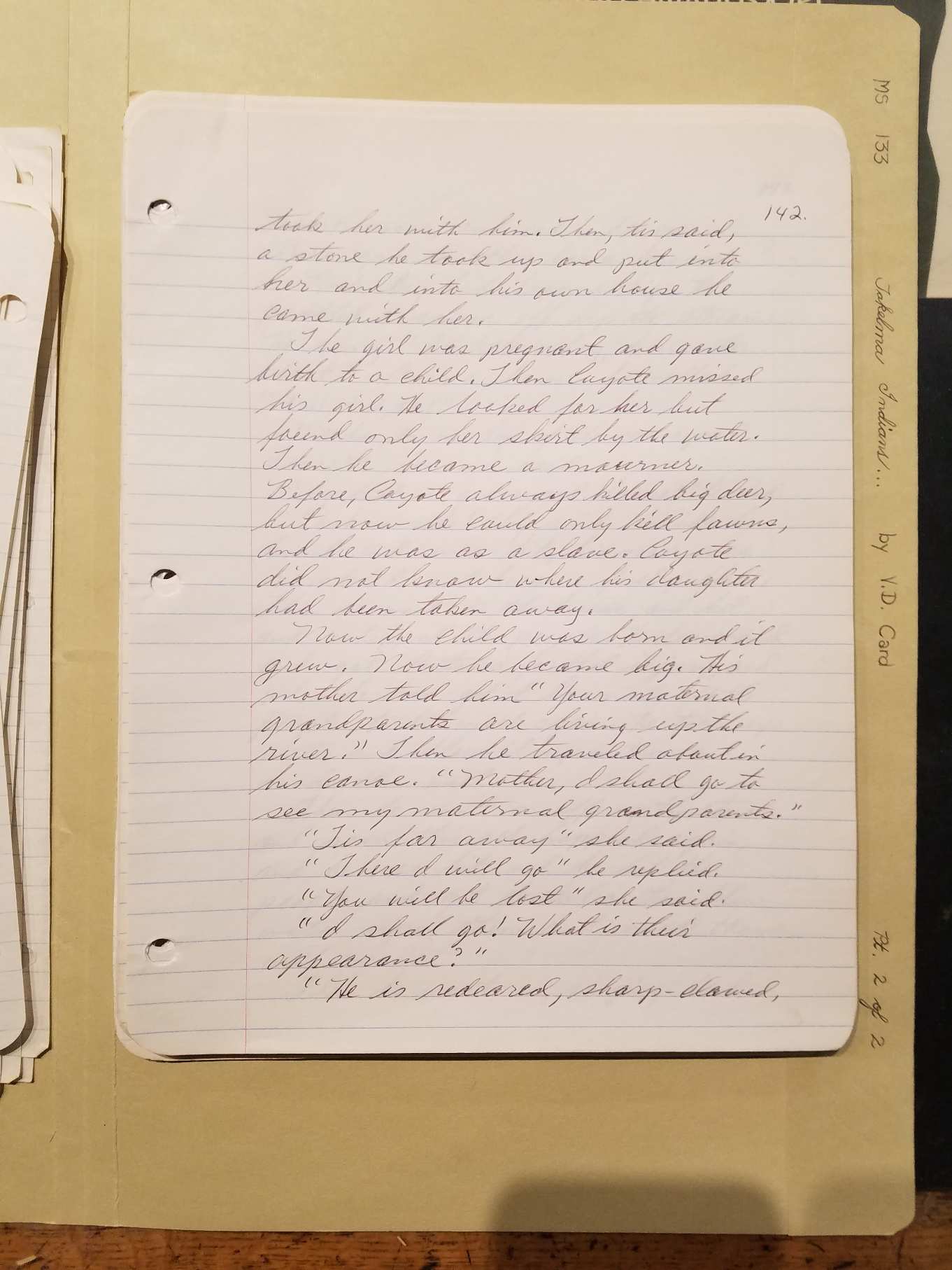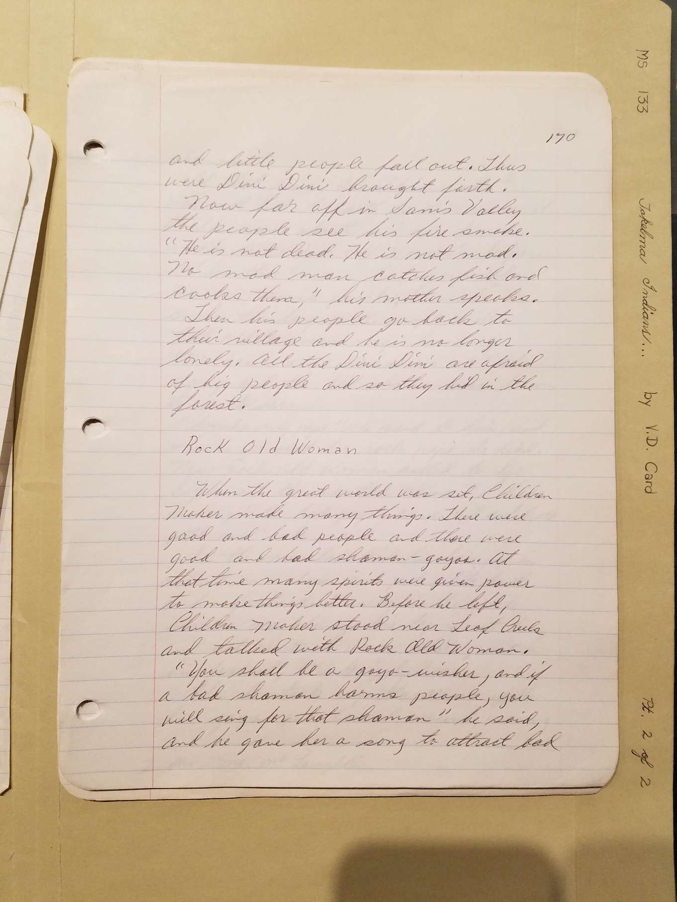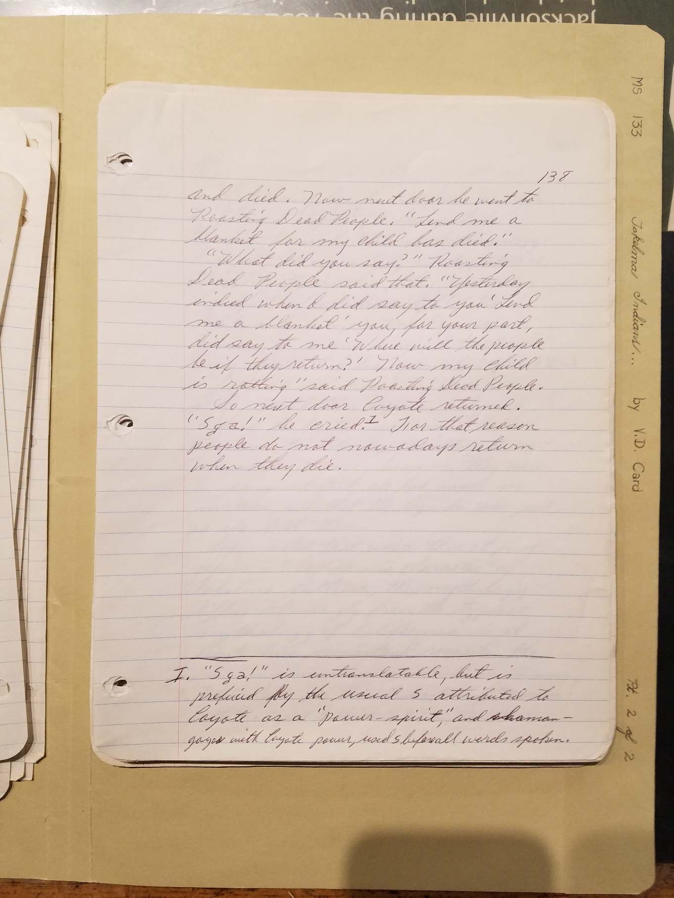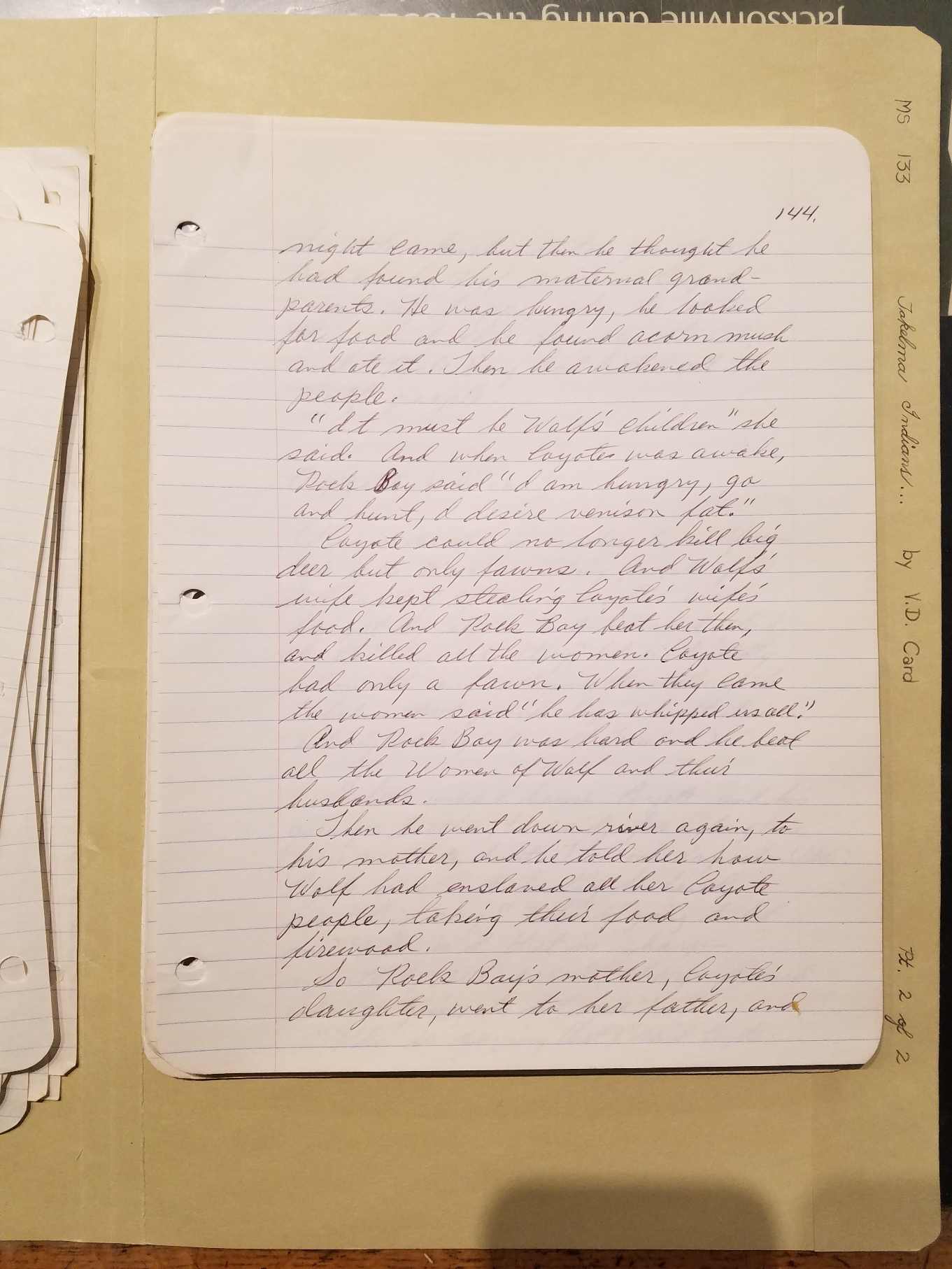 stole the girl and [Page 142] took her with him. Then, tis said, a stone he took up and put into her and into his own house he came with her. The girl was pregnant and gave birth to a child. Then Coyote missed his girl. He looked for her but found only her skirt by the water. Then he became a mourner. Before, Coyote always killed big deer, but now he could only kill fawns, and he was as a slave. Coyote did not know where his daughter had been taken away. Now the child was born and it grew. Now he became big. His mother told him "your maternal grandparents are living up the river." Then he traveled about in his canoe. "Mother, I shall go to see my maternal grandparents." Tis far away she said. There I will go he replied. You will be lost she said. I shall go! What is their appearance? "He is red-eared, sharp-clawed, [Card 143] sharp nose, and red in his ears. Your grandmother has a long neck." Rock Boy had become big. He paddled a canoe off up the stream. He sang "As Otter's boy, I wander about." Over a house he walked, "tul, tul, tul." Who is on top of the graveyard house? someone said. Is that a graveyard house? he asked. Look inside they said. Inside he looked and was hit, his nose was scratched and became full of blood. Then he went in the house and hit and whipped the people. He demanded and got dentalia for that injury, and when he had got it he made all the people to be well again. He took up water and blew it upon them and made them well. Then he went off up the stream and soon this all happened again, and he was hit and he hit the people and got dentalia then blew water upon them and made them well again. Then he went on, singing. And [Page 144] night came, but then he thought he had found his maternal grandparents. He was hungry, he looked for food and he found acorn mush and ate it. Then he awakened the people. It must be Wolf's children she said. And when Coyote was awake, Rock Boy said "I am hungry, go and hunt, I desire venison fat." Coyote could no longer kill big deer but only fawns. And Wolf's wife kept stealing Coyote's wife's food. And Rock Boy beat her then, and killed all the women. Coyote only had a fawn. When they came the women said "he has whipped us all." And Rock Boy was hard and he beat all the Women of Wolf and their husbands. Then he went down river again, to his mother, and he told her how Wolf had enslaved all her Coyote people, taking their food and firewood. So Rock Boy's mother, Coyote's daughter, went to her father, and [Page 145] her husband too, with a canoe ful of salmon. Coyote was very happy when he saw them, and their daughter returned, and Rock Boy had killed all the Wolf people.