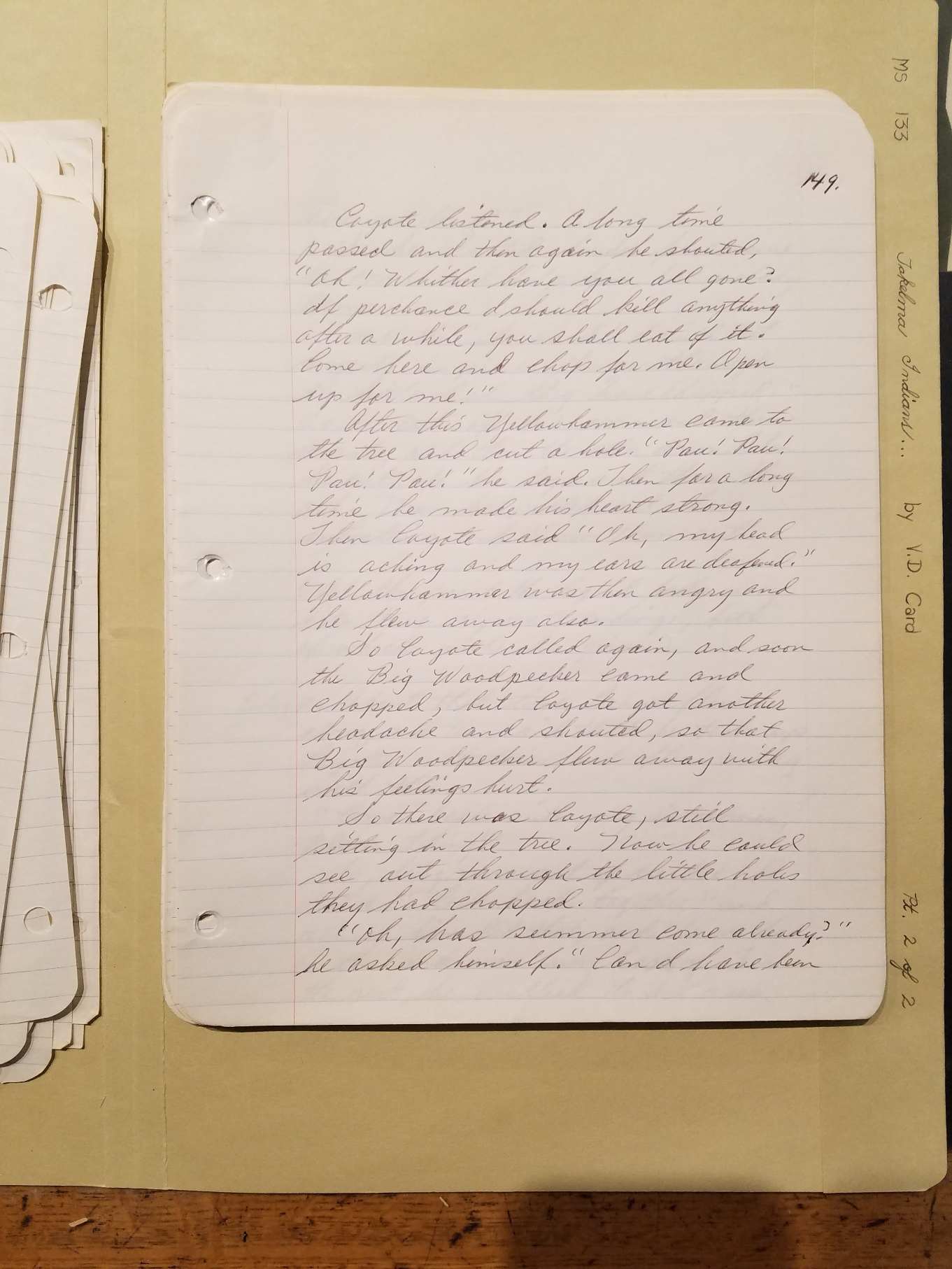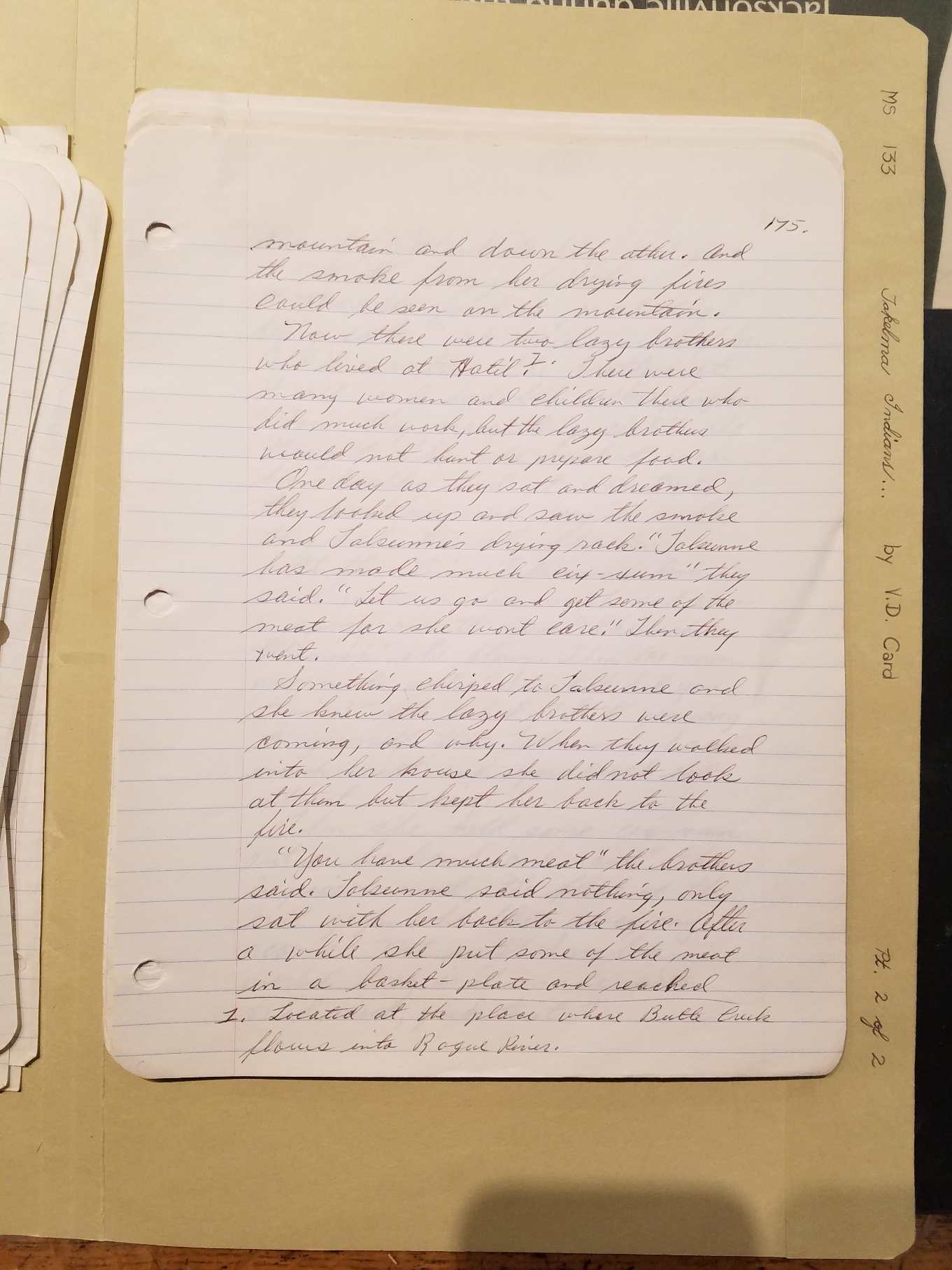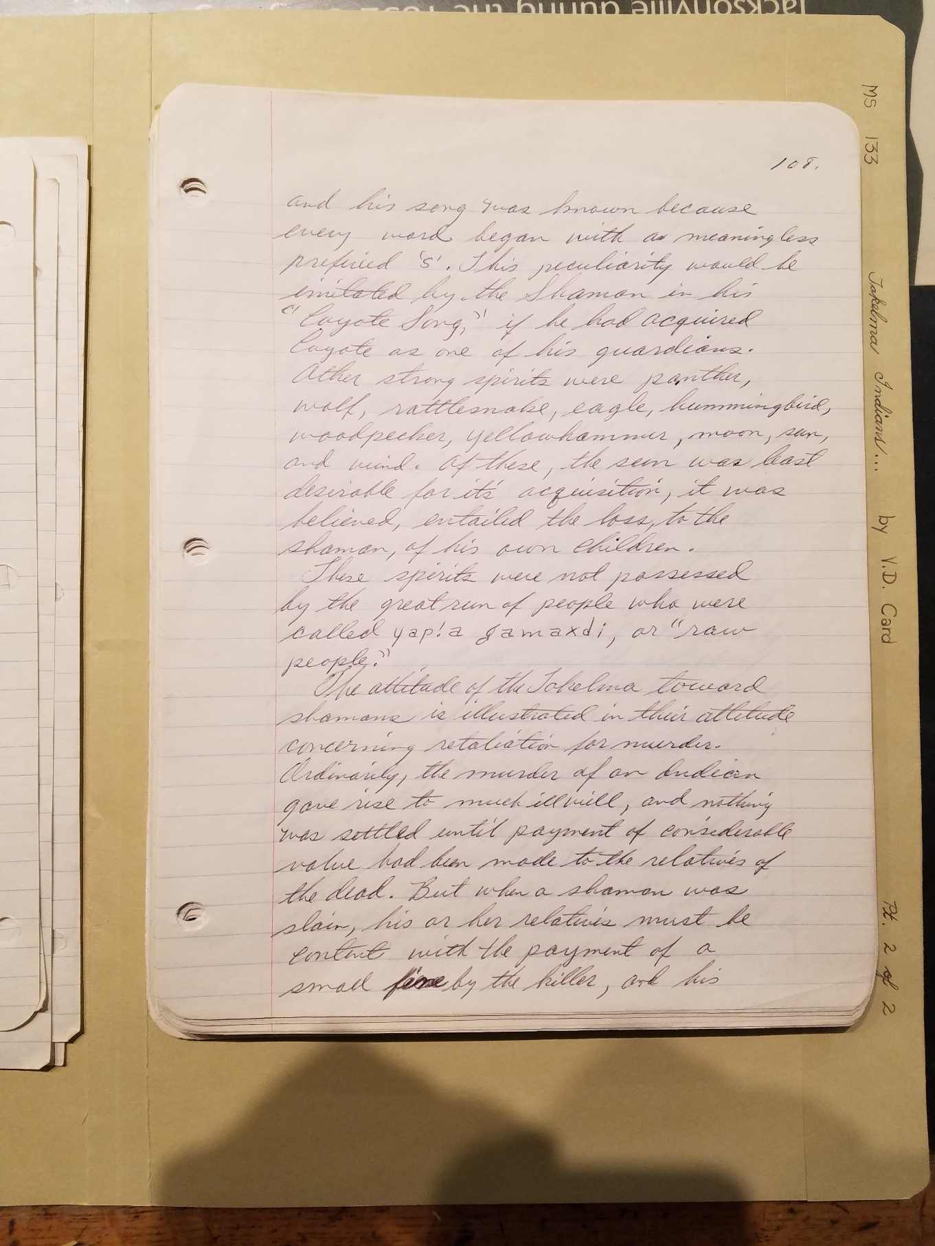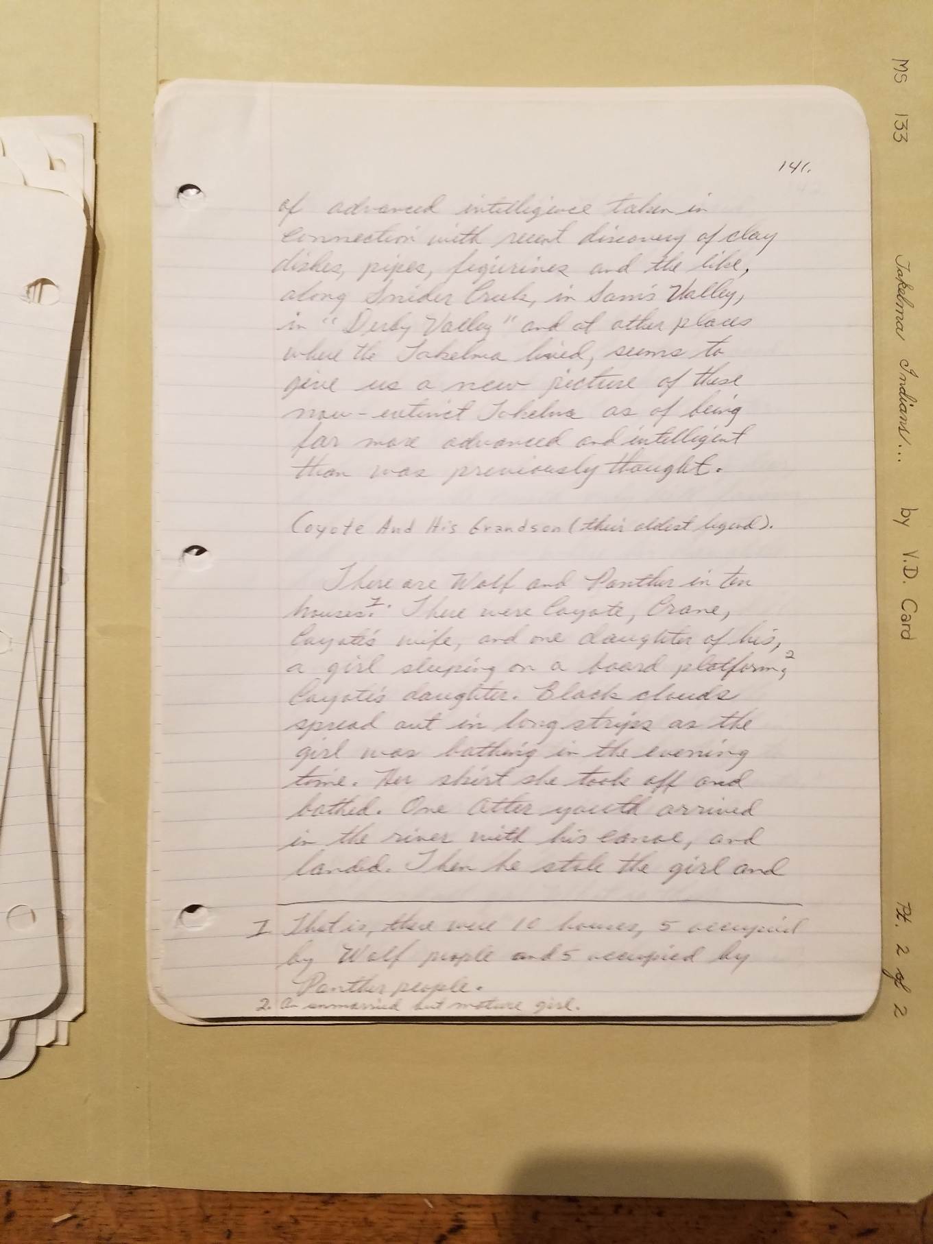 stole the girl and [Page 142] took her with him. Then, tis said, a stone he took up and put into her and into his own house he came with her. The girl was pregnant and gave birth to a child. Then Coyote missed his girl. He looked for her but found only her skirt by the water. Then he became a mourner. Before, Coyote always killed big deer, but now he could only kill fawns, and he was as a slave. Coyote did not know where his daughter had been taken away. Now the child was born and it grew. Now he became big. His mother told him "your maternal grandparents are living up the river." Then he traveled about in his canoe. "Mother, I shall go to see my maternal grandparents." Tis far away she said. There I will go he replied. You will be lost she said. I shall go! What is their appearance? "He is red-eared, sharp-clawed, [Card 143] sharp nose, and red in his ears. Your grandmother has a long neck." Rock Boy had become big. He paddled a canoe off up the stream. He sang "As Otter's boy, I wander about." Over a house he walked, "tul, tul, tul." Who is on top of the graveyard house? someone said. Is that a graveyard house? he asked. Look inside they said. Inside he looked and was hit, his nose was scratched and became full of blood. Then he went in the house and hit and whipped the people. He demanded and got dentalia for that injury, and when he had got it he made all the people to be well again. He took up water and blew it upon them and made them well. Then he went off up the stream and soon this all happened again, and he was hit and he hit the people and got dentalia then blew water upon them and made them well again. Then he went on, singing. And [Page 144] night came, but then he thought he had found his maternal grandparents. He was hungry, he looked for food and he found acorn mush and ate it. Then he awakened the people. It must be Wolf's children she said. And when Coyote was awake, Rock Boy said "I am hungry, go and hunt, I desire venison fat." Coyote could no longer kill big deer but only fawns. And Wolf's wife kept stealing Coyote's wife's food. And Rock Boy beat her then, and killed all the women. Coyote only had a fawn. When they came the women said "he has whipped us all." And Rock Boy was hard and he beat all the Women of Wolf and their husbands. Then he went down river again, to his mother, and he told her how Wolf had enslaved all her Coyote people, taking their food and firewood. So Rock Boy's mother, Coyote's daughter, went to her father, and [Page 145] her husband too, with a canoe ful of salmon. Coyote was very happy when he saw them, and their daughter returned, and Rock Boy had killed all the Wolf people.