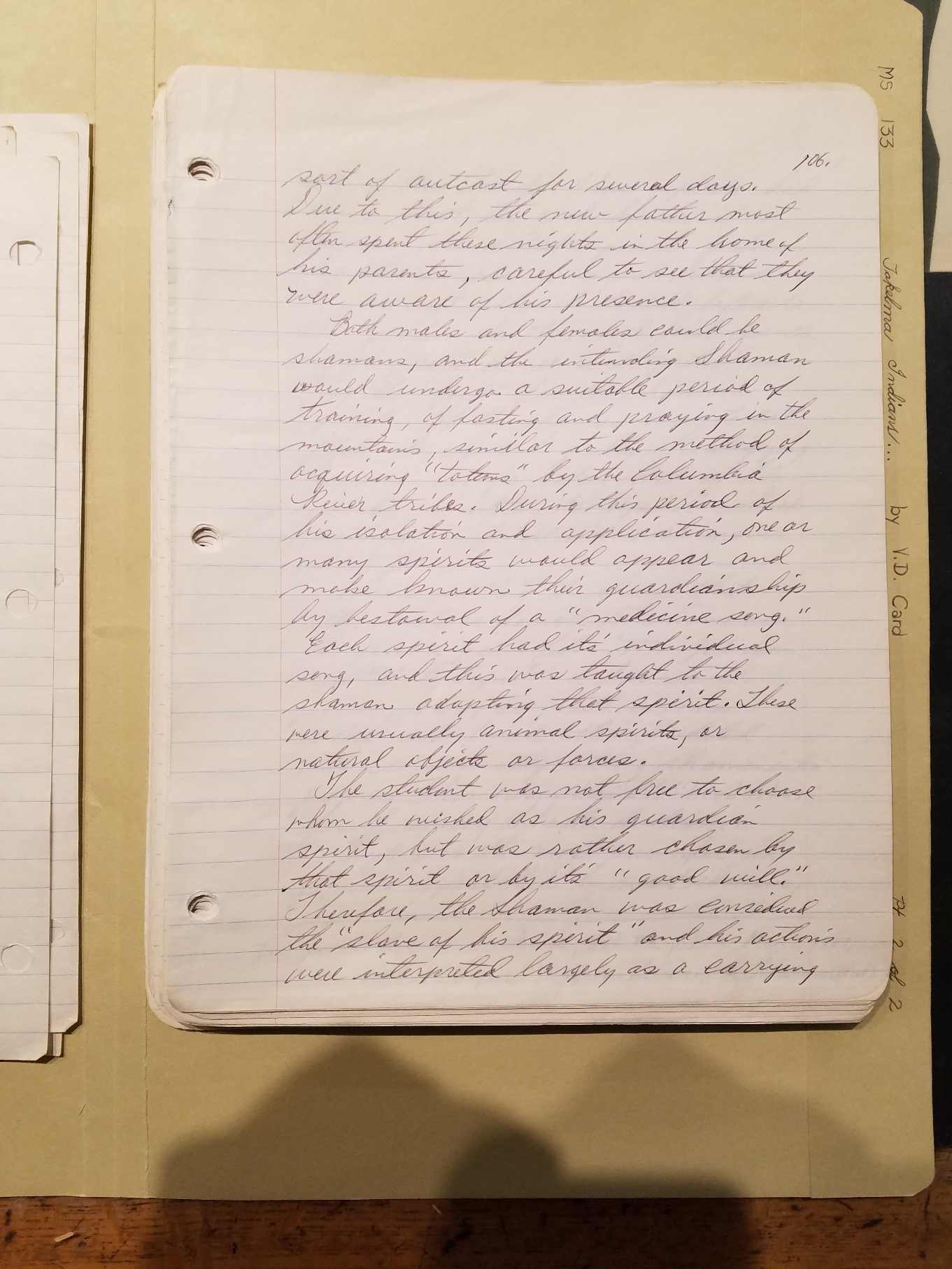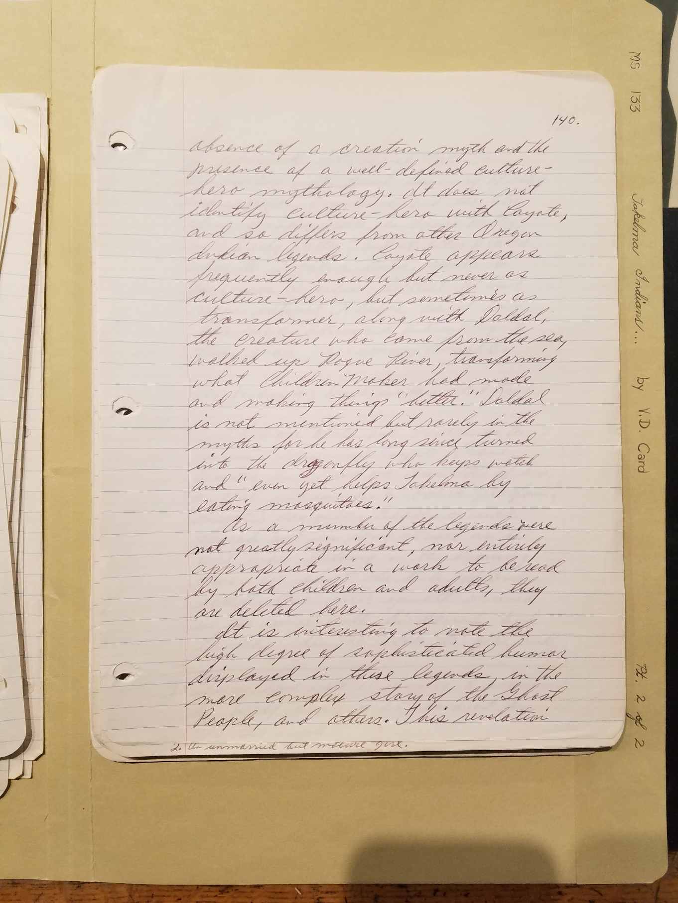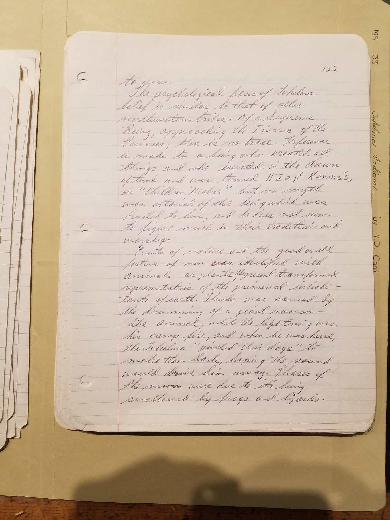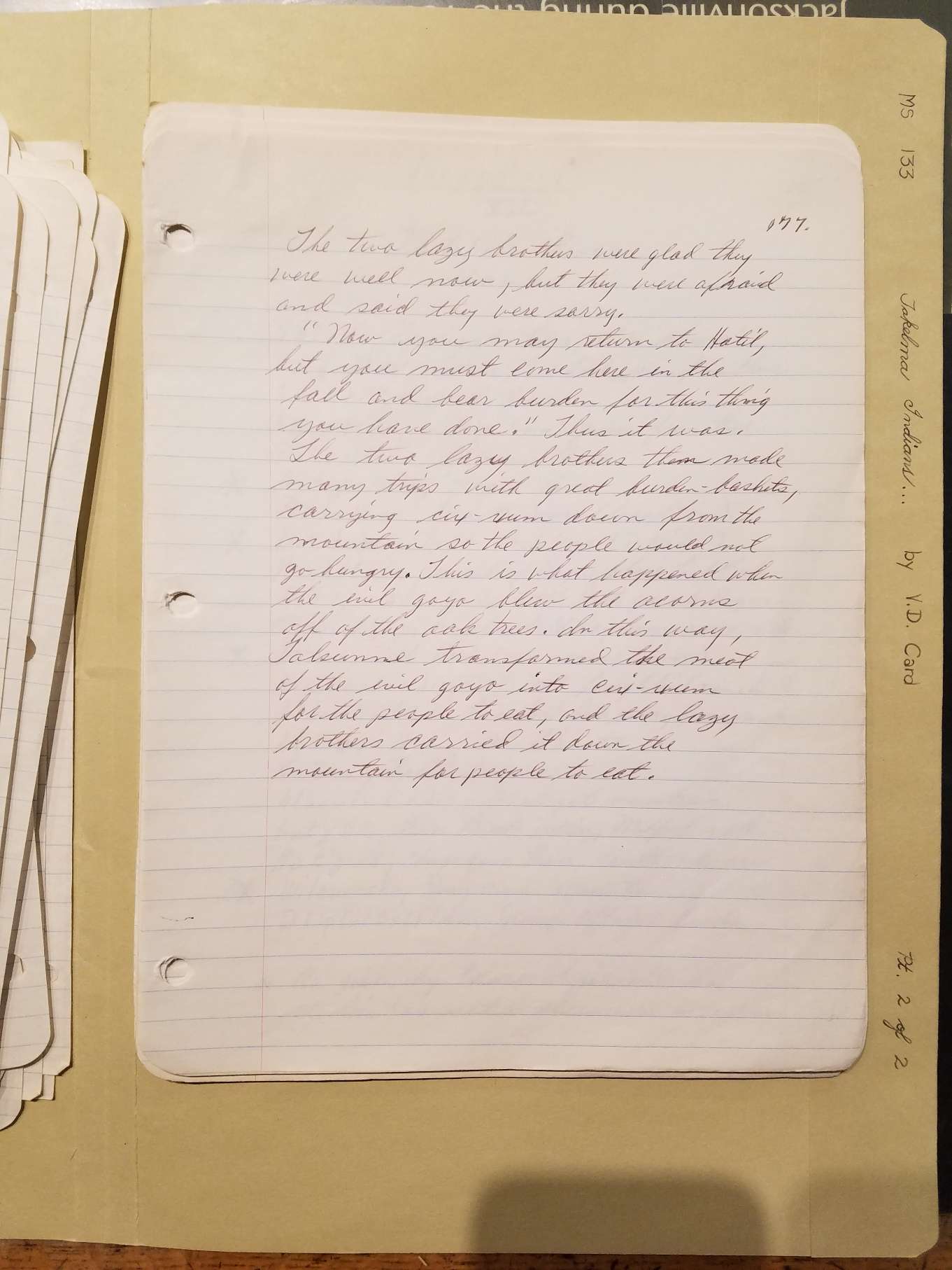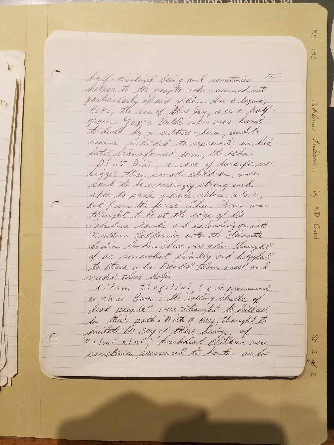 stole the girl and [Page 142] took her with him. Then, tis said, a stone he took up and put into her and into his own house he came with her. The girl was pregnant and gave birth to a child. Then Coyote missed his girl. He looked for her but found only her skirt by the water. Then he became a mourner. Before, Coyote always killed big deer, but now he could only kill fawns, and he was as a slave. Coyote did not know where his daughter had been taken away. Now the child was born and it grew. Now he became big. His mother told him "your maternal grandparents are living up the river." Then he traveled about in his canoe. "Mother, I shall go to see my maternal grandparents." Tis far away she said. There I will go he replied. You will be lost she said. I shall go! What is their appearance? "He is red-eared, sharp-clawed, [Card 143] sharp nose, and red in his ears. Your grandmother has a long neck." Rock Boy had become big. He paddled a canoe off up the stream. He sang "As Otter's boy, I wander about." Over a house he walked, "tul, tul, tul." Who is on top of the graveyard house? someone said. Is that a graveyard house? he asked. Look inside they said. Inside he looked and was hit, his nose was scratched and became full of blood. Then he went in the house and hit and whipped the people. He demanded and got dentalia for that injury, and when he had got it he made all the people to be well again. He took up water and blew it upon them and made them well. Then he went off up the stream and soon this all happened again, and he was hit and he hit the people and got dentalia then blew water upon them and made them well again. Then he went on, singing. And [Page 144] night came, but then he thought he had found his maternal grandparents. He was hungry, he looked for food and he found acorn mush and ate it. Then he awakened the people. It must be Wolf's children she said. And when Coyote was awake, Rock Boy said "I am hungry, go and hunt, I desire venison fat." Coyote could no longer kill big deer but only fawns. And Wolf's wife kept stealing Coyote's wife's food. And Rock Boy beat her then, and killed all the women. Coyote only had a fawn. When they came the women said "he has whipped us all." And Rock Boy was hard and he beat all the Women of Wolf and their husbands. Then he went down river again, to his mother, and he told her how Wolf had enslaved all her Coyote people, taking their food and firewood. So Rock Boy's mother, Coyote's daughter, went to her father, and [Page 145] her husband too, with a canoe ful of salmon. Coyote was very happy when he saw them, and their daughter returned, and Rock Boy had killed all the Wolf people.