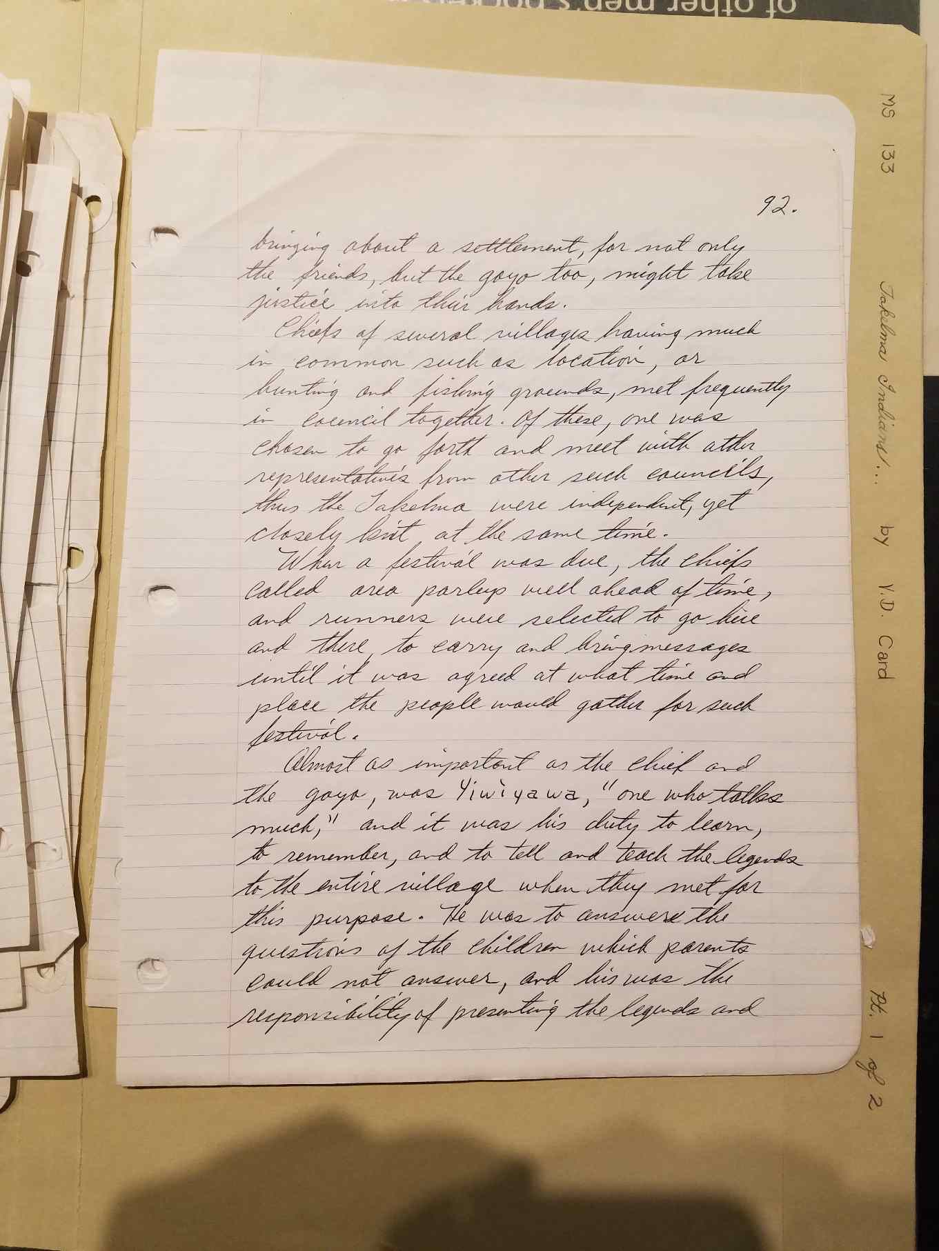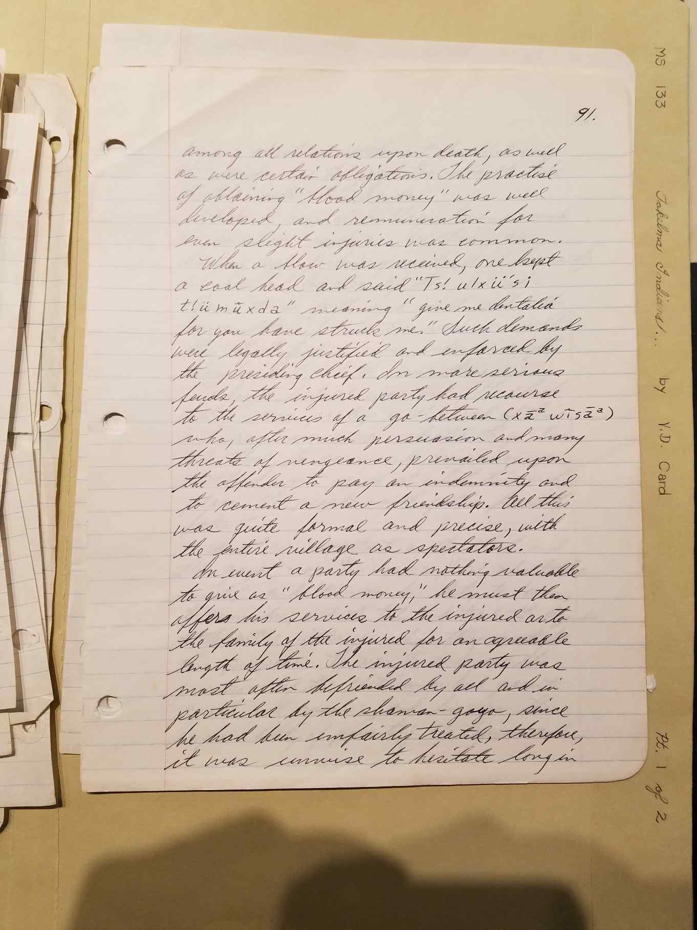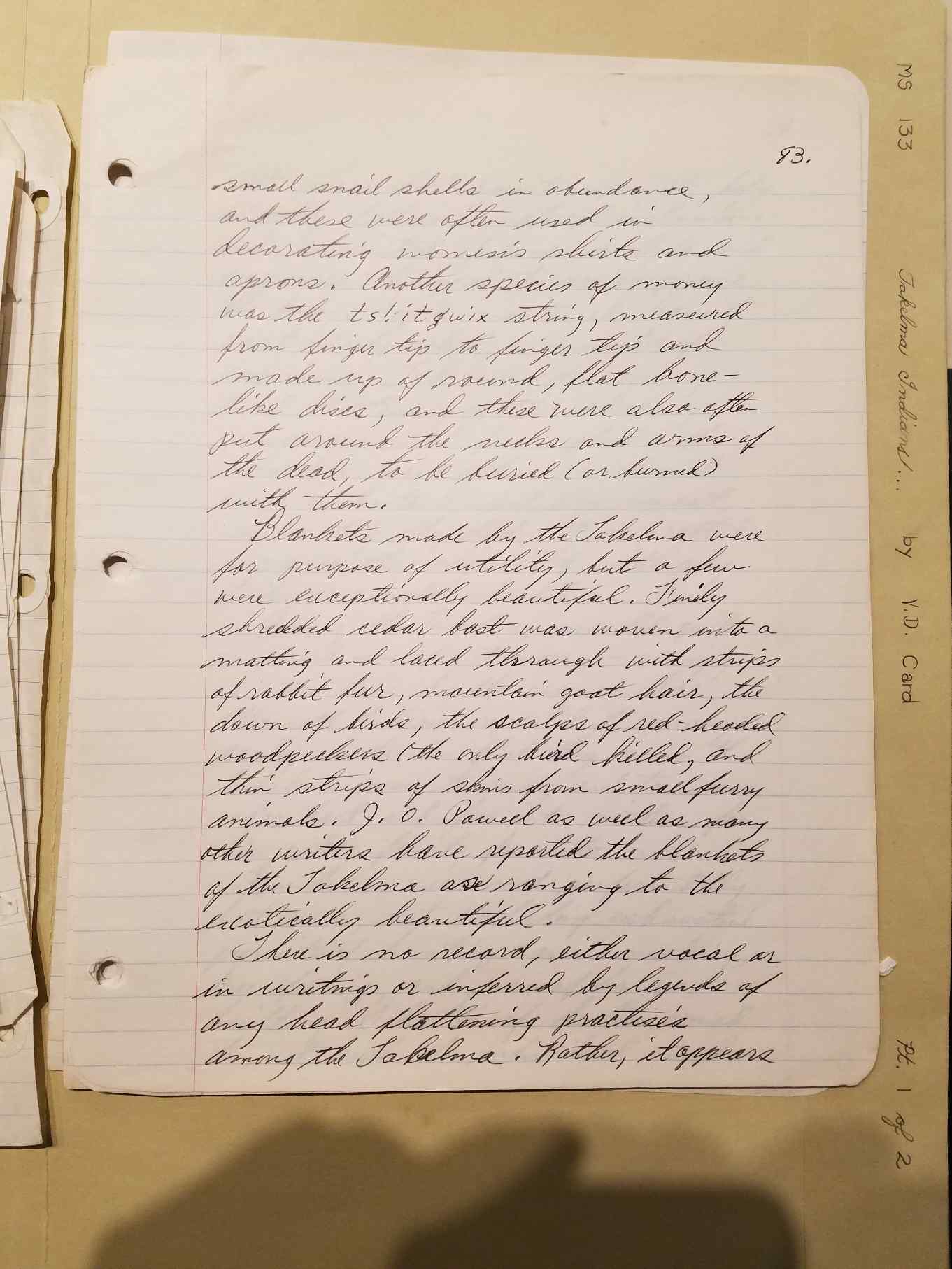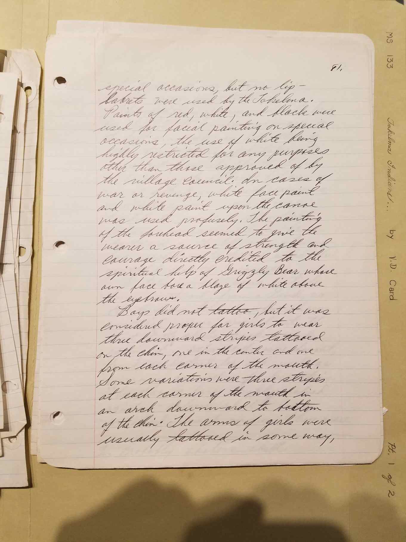 stole the girl and [Page 142] took her with him. Then, tis said, a stone he took up and put into her and into his own house he came with her. The girl was pregnant and gave birth to a child. Then Coyote missed his girl. He looked for her but found only her skirt by the water. Then he became a mourner. Before, Coyote always killed big deer, but now he could only kill fawns, and he was as a slave. Coyote did not know where his daughter had been taken away. Now the child was born and it grew. Now he became big. His mother told him "your maternal grandparents are living up the river." Then he traveled about in his canoe. "Mother, I shall go to see my maternal grandparents." Tis far away she said. There I will go he replied. You will be lost she said. I shall go! What is their appearance? "He is red-eared, sharp-clawed, [Card 143] sharp nose, and red in his ears. Your grandmother has a long neck." Rock Boy had become big. He paddled a canoe off up the stream. He sang "As Otter's boy, I wander about." Over a house he walked, "tul, tul, tul." Who is on top of the graveyard house? someone said. Is that a graveyard house? he asked. Look inside they said. Inside he looked and was hit, his nose was scratched and became full of blood. Then he went in the house and hit and whipped the people. He demanded and got dentalia for that injury, and when he had got it he made all the people to be well again. He took up water and blew it upon them and made them well. Then he went off up the stream and soon this all happened again, and he was hit and he hit the people and got dentalia then blew water upon them and made them well again. Then he went on, singing. And [Page 144] night came, but then he thought he had found his maternal grandparents. He was hungry, he looked for food and he found acorn mush and ate it. Then he awakened the people. It must be Wolf's children she said. And when Coyote was awake, Rock Boy said "I am hungry, go and hunt, I desire venison fat." Coyote could no longer kill big deer but only fawns. And Wolf's wife kept stealing Coyote's wife's food. And Rock Boy beat her then, and killed all the women. Coyote only had a fawn. When they came the women said "he has whipped us all." And Rock Boy was hard and he beat all the Women of Wolf and their husbands. Then he went down river again, to his mother, and he told her how Wolf had enslaved all her Coyote people, taking their food and firewood. So Rock Boy's mother, Coyote's daughter, went to her father, and [Page 145] her husband too, with a canoe ful of salmon. Coyote was very happy when he saw them, and their daughter returned, and Rock Boy had killed all the Wolf people.