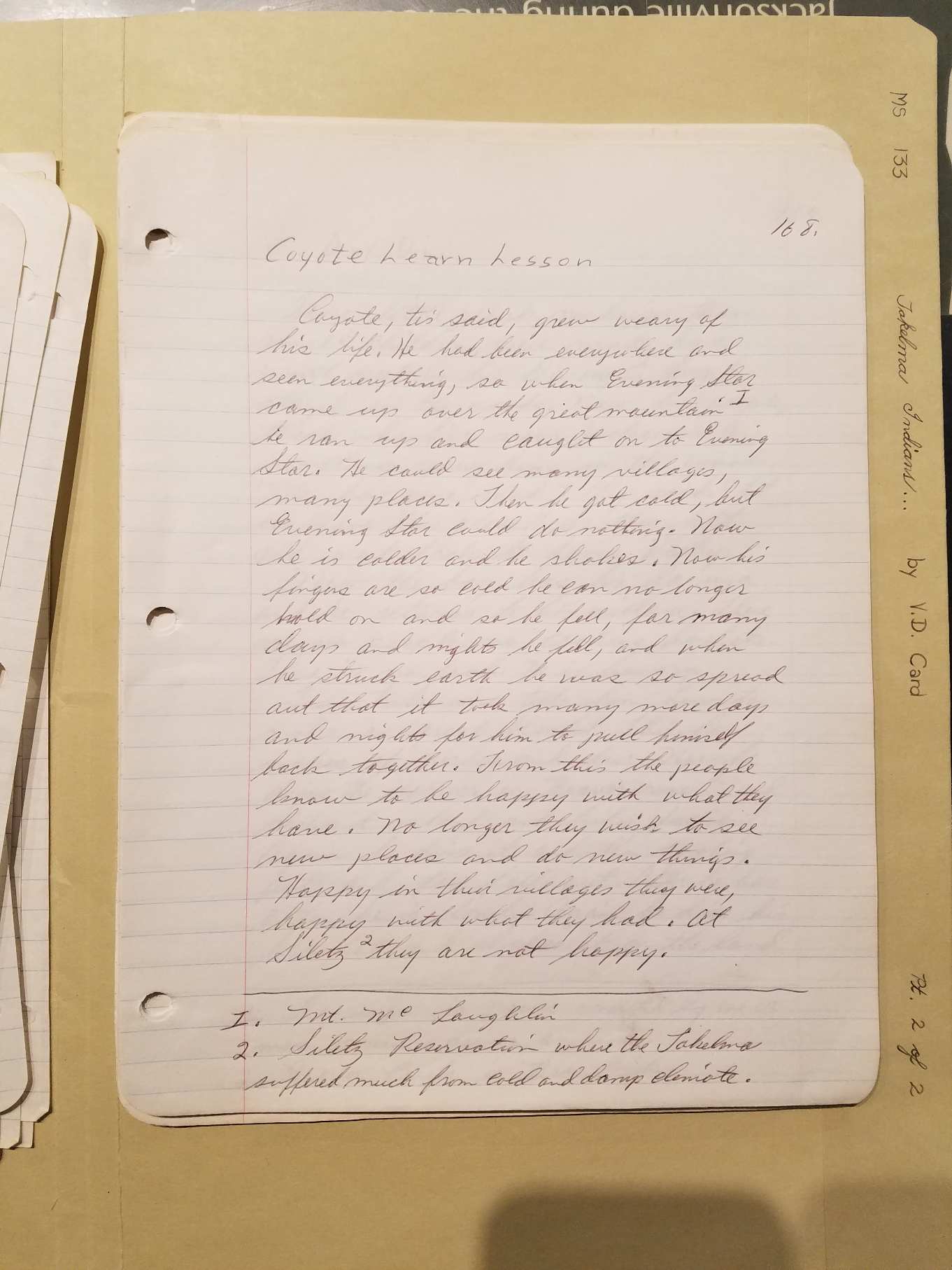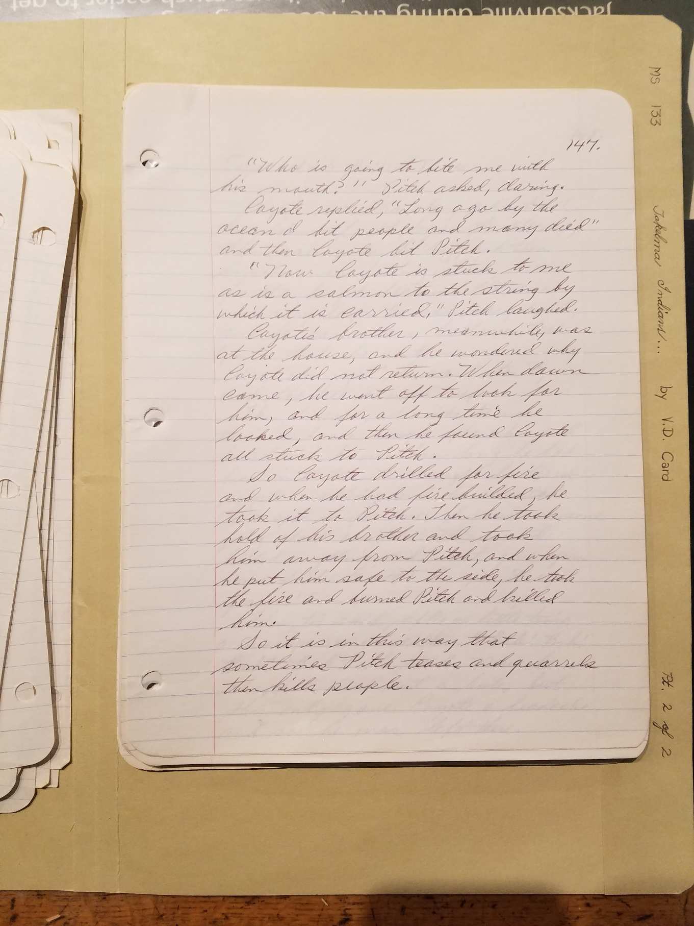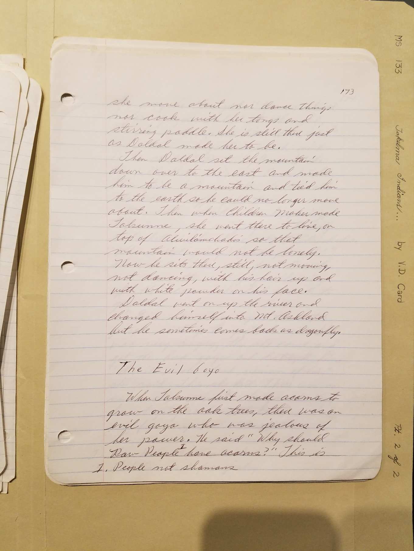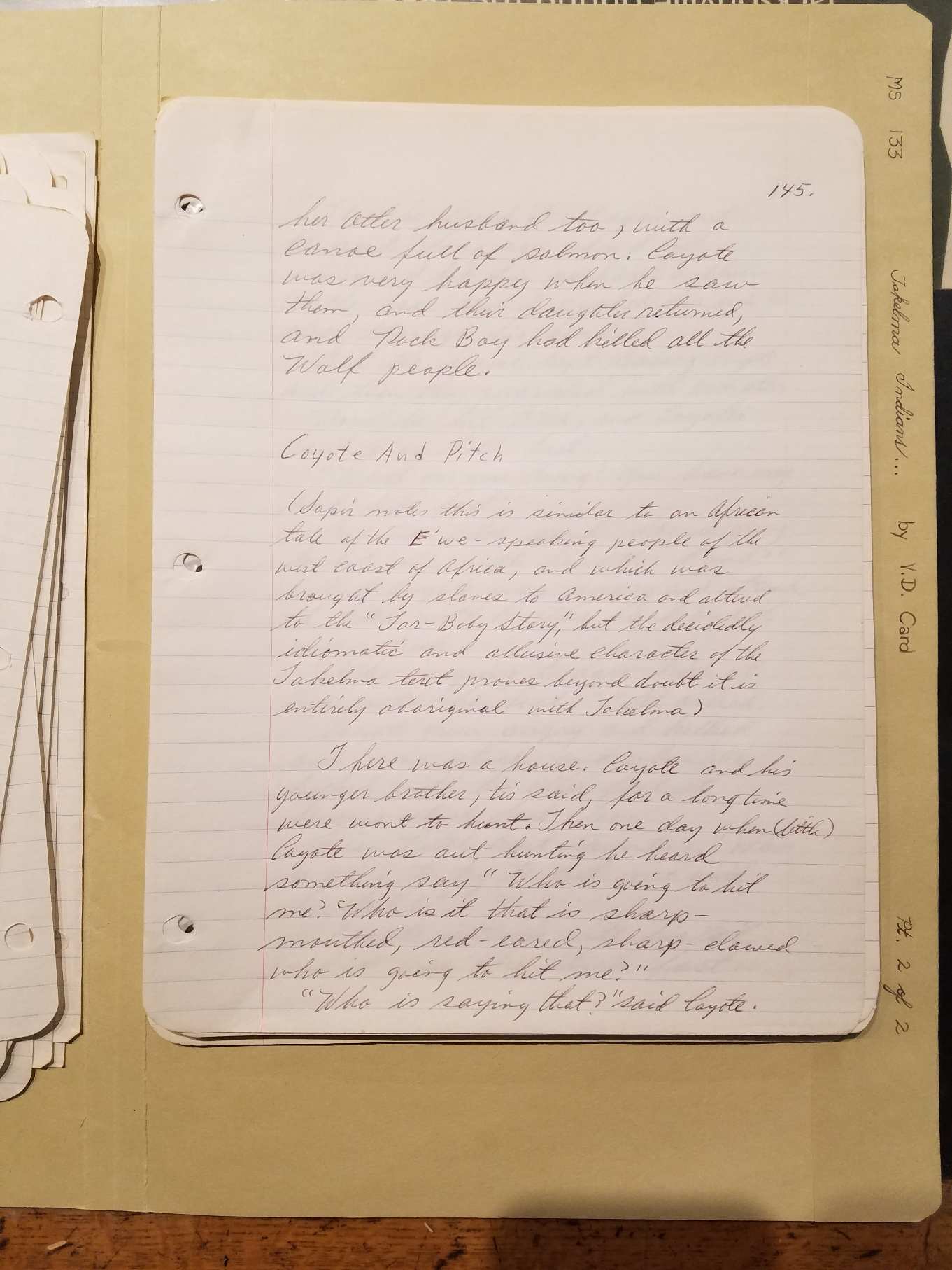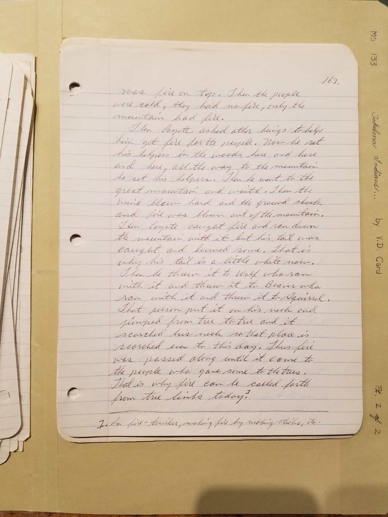 spirit, before Daldal made it into a spirit creature, the great mountain[Page 163] was fire on top. Then the people were cold, they had no fire, only the mountain had fire. Then Coyote asked other beings to help him get fire for the people. Now he set his helpers in the woods here and here and here, all the way to the mountain he set his helpers. Then he went to the great mountain and waited. Then the wind blew hard and the ground shook and fire was blown out of the mountain. Then Coyote caught fire and ran down the mountain with it but his tail was caught and burned some. That is why his tail is a little white now. Then he threw it to Wolf who ran with it and threw it to Beaver who ran with it and threw it to to Squirrel. That person put it on his neck and jumped from tree to tree and it scorched his neck so that place is scorched even to this day. Thus fire was passed along until it came to the people who gave some to the trees. That is why fire can be called forth from tree limbs today. [In fire-twirler, making fire by rubbing sticks, etc.] [Page 164]