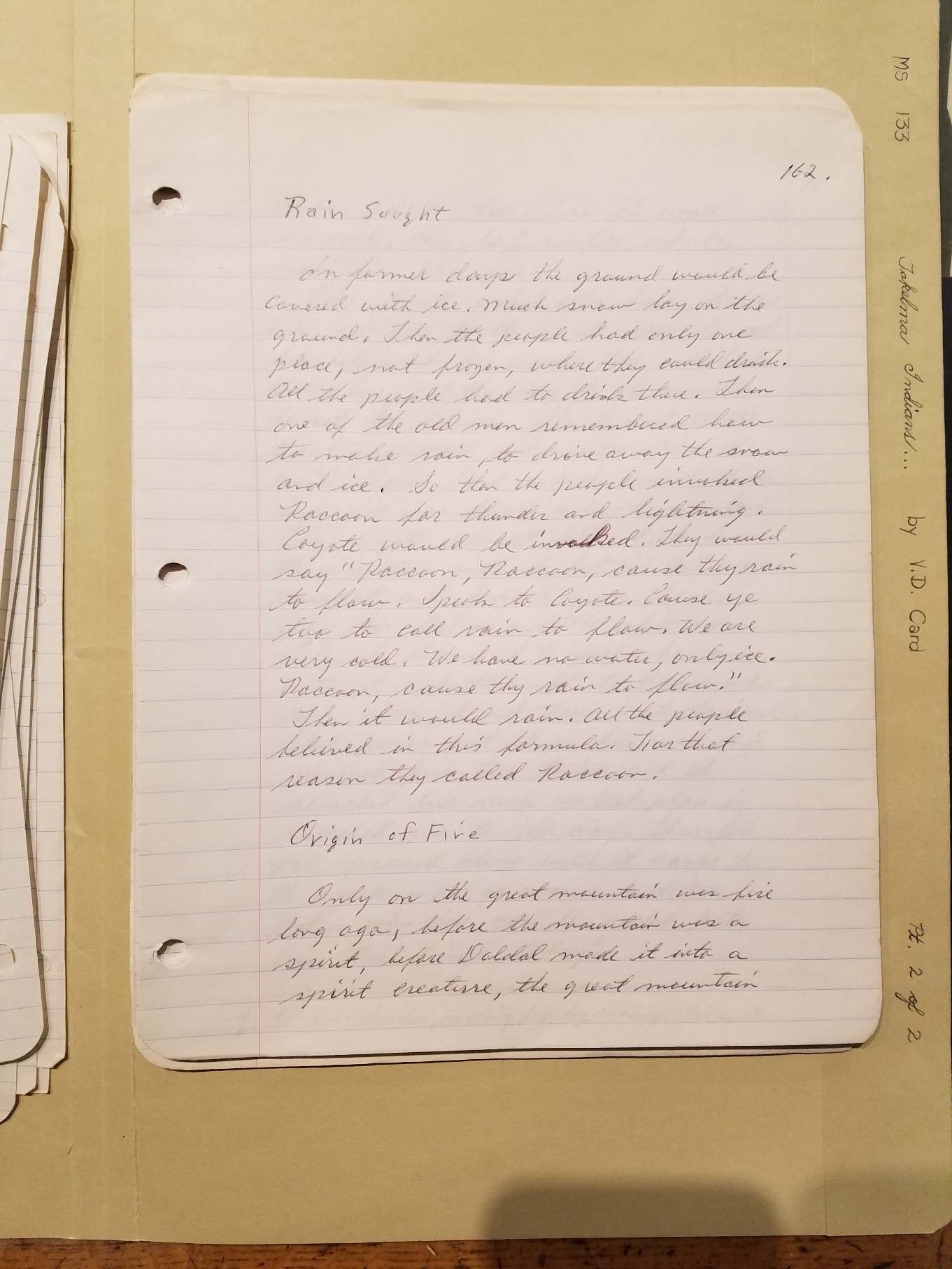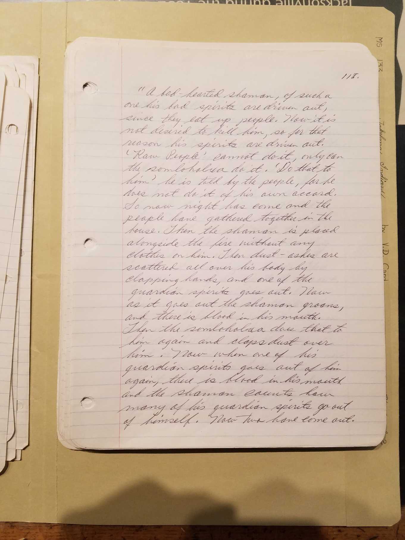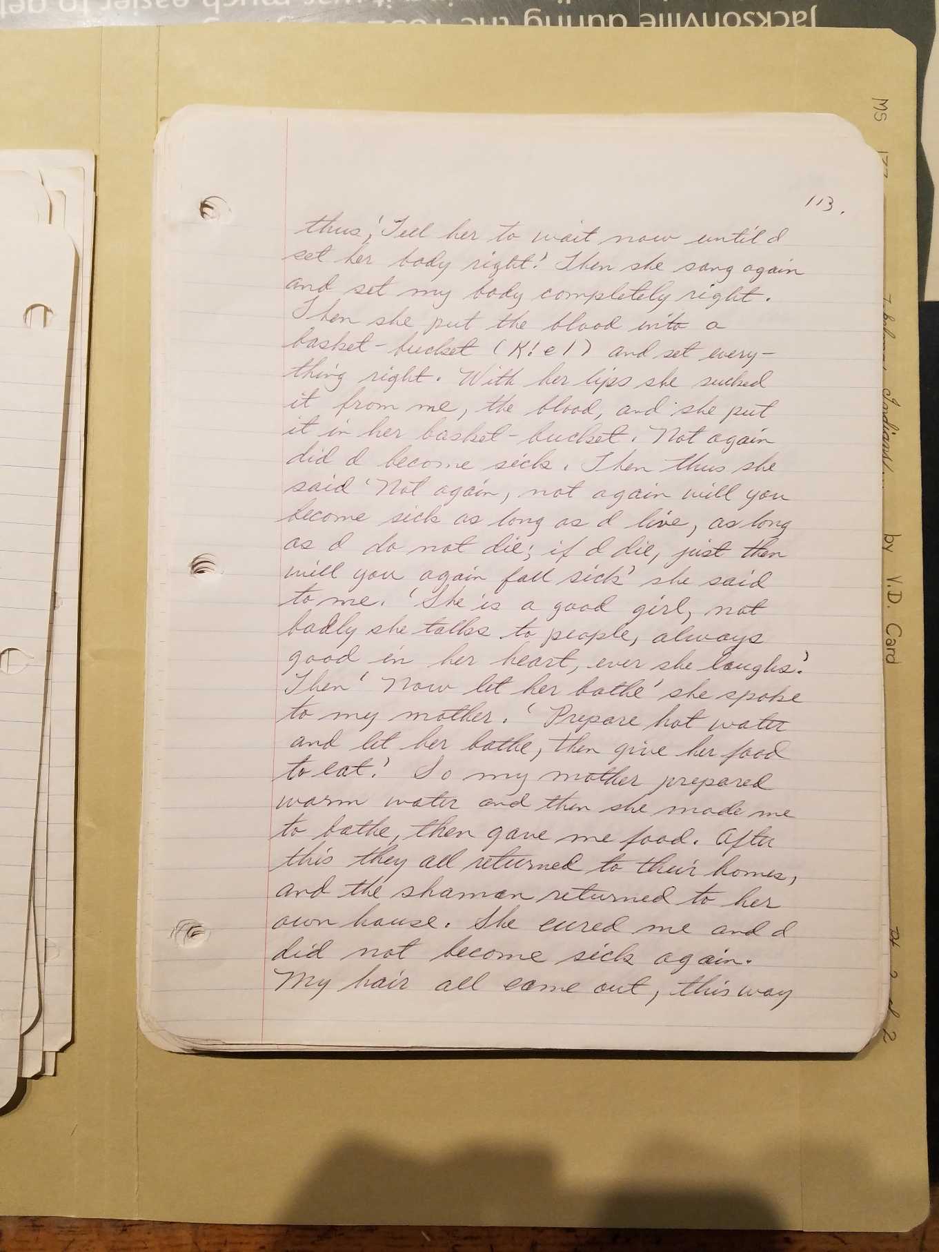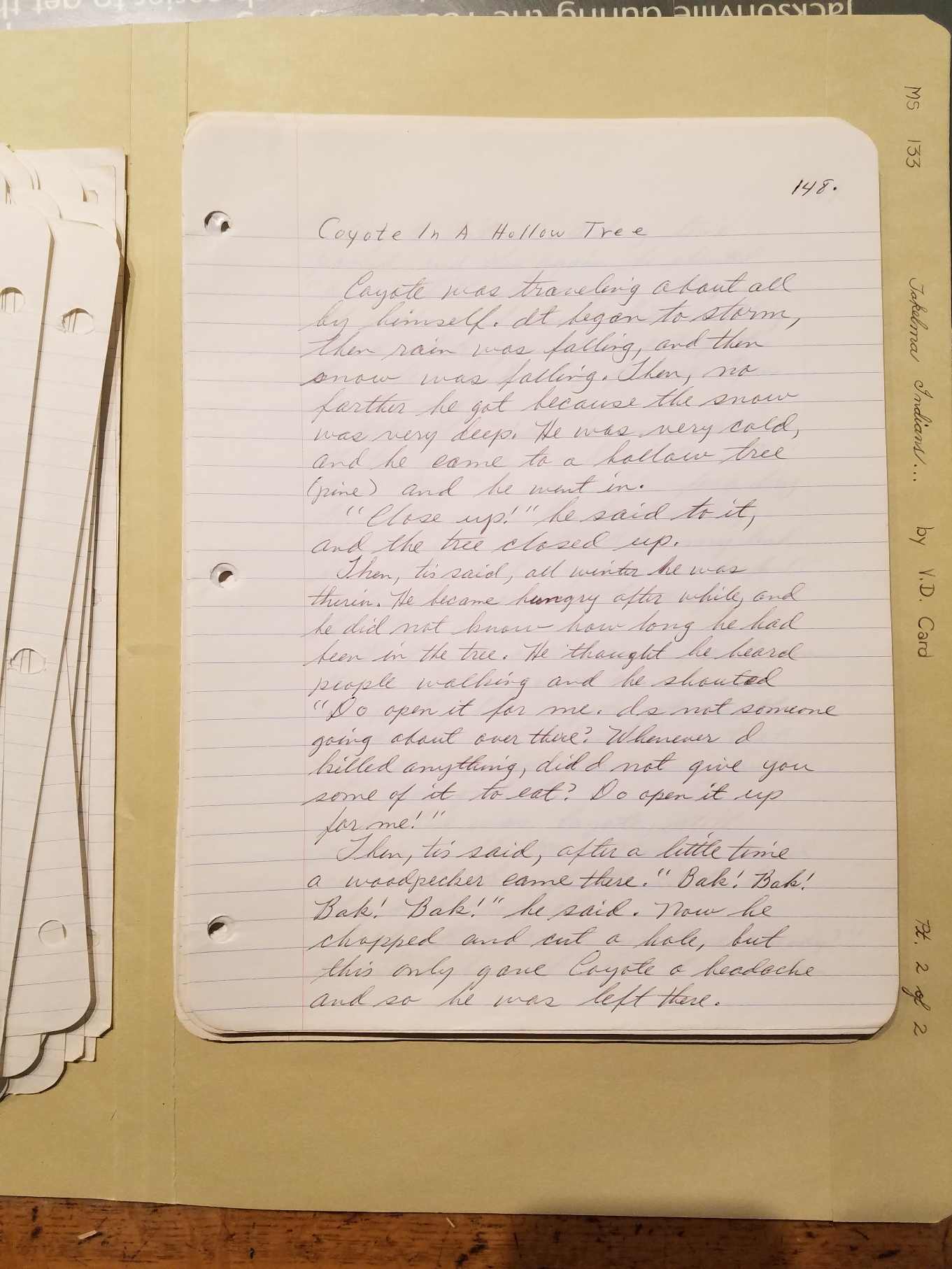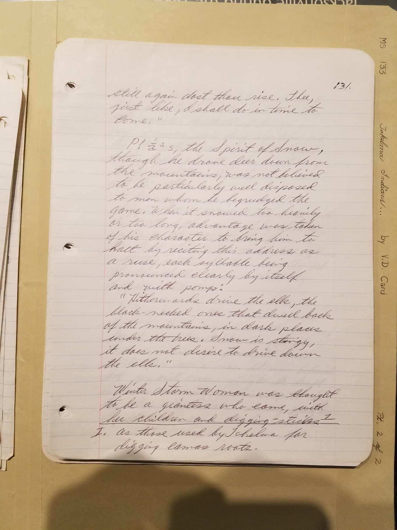 spirit, before Daldal made it into a spirit creature, the great mountain[Page 163] was fire on top. Then the people were cold, they had no fire, only the mountain had fire. Then Coyote asked other beings to help him get fire for the people. Now he set his helpers in the woods here and here and here, all the way to the mountain he set his helpers. Then he went to the great mountain and waited. Then the wind blew hard and the ground shook and fire was blown out of the mountain. Then Coyote caught fire and ran down the mountain with it but his tail was caught and burned some. That is why his tail is a little white now. Then he threw it to Wolf who ran with it and threw it to Beaver who ran with it and threw it to to Squirrel. That person put it on his neck and jumped from tree to tree and it scorched his neck so that place is scorched even to this day. Thus fire was passed along until it came to the people who gave some to the trees. That is why fire can be called forth from tree limbs today. [In fire-twirler, making fire by rubbing sticks, etc.] [Page 164]