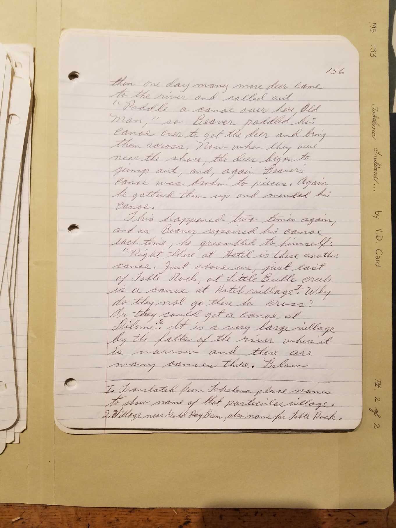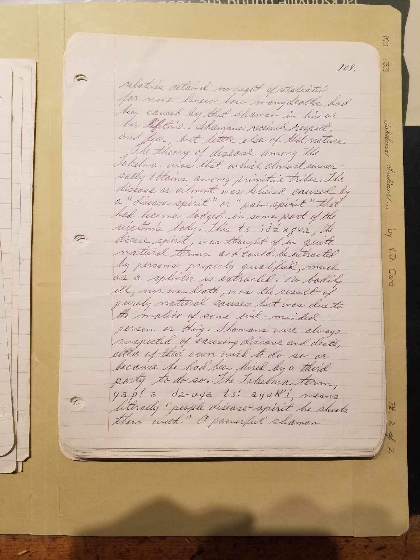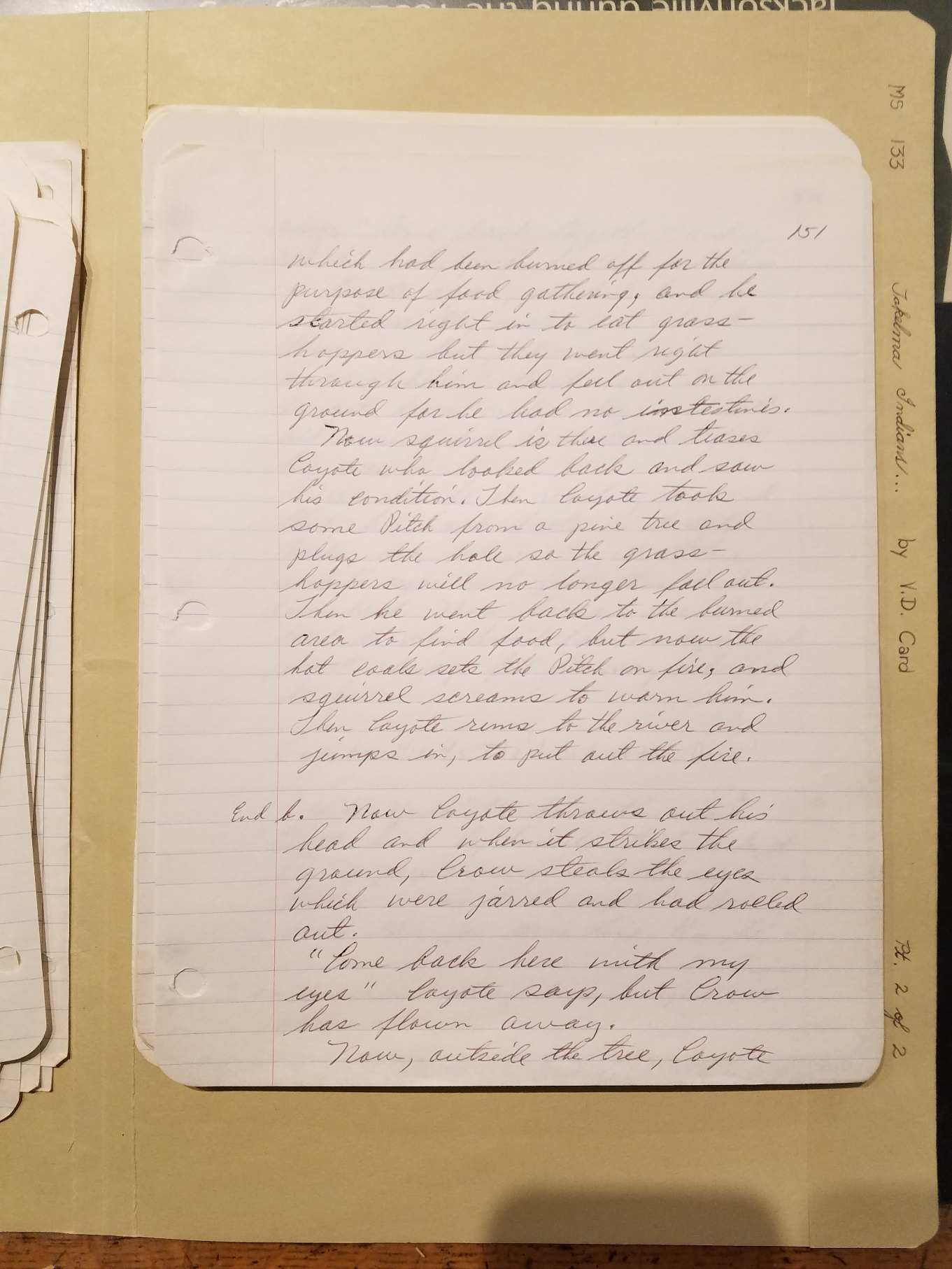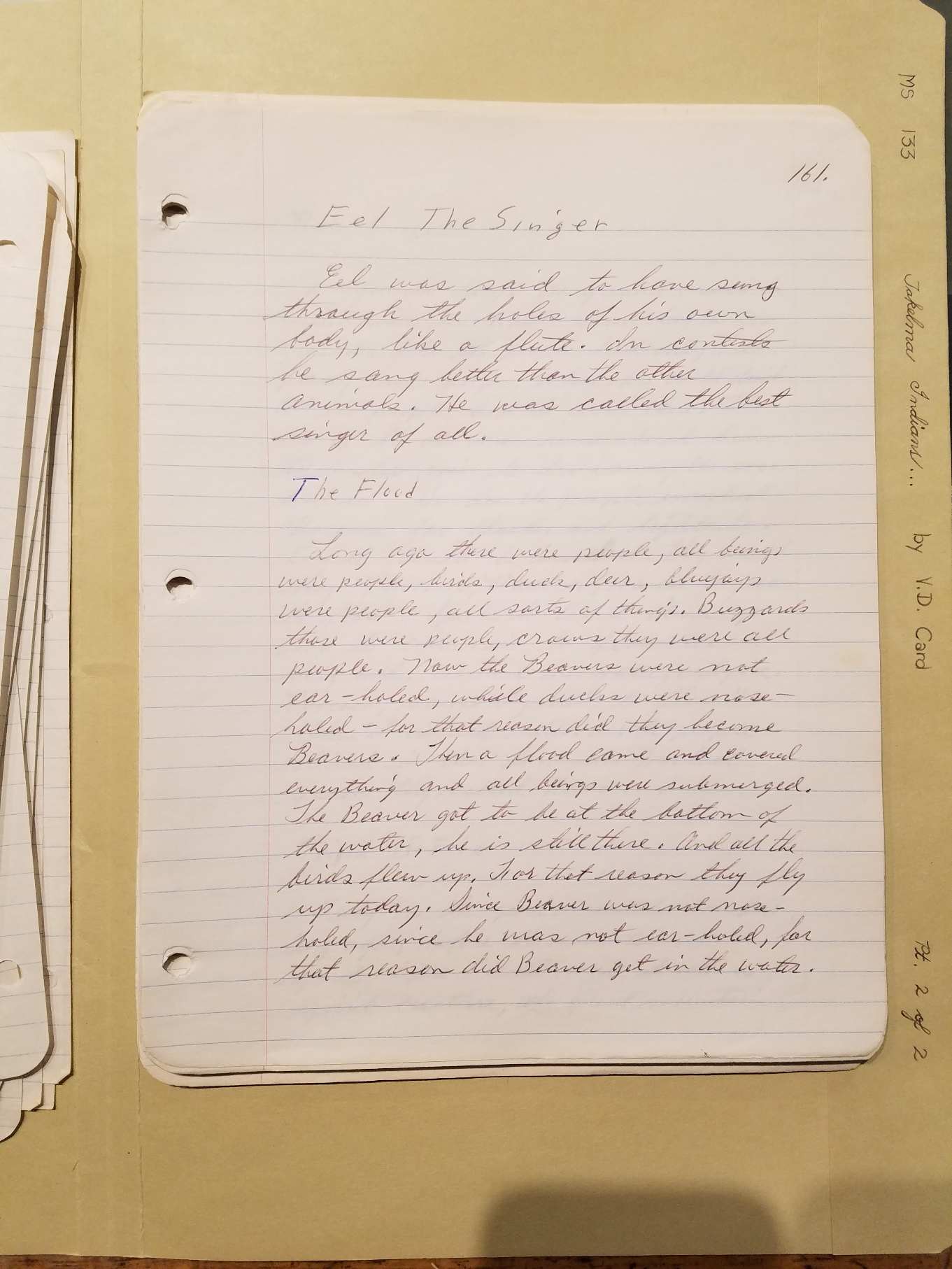 spirit, before Daldal made it into a spirit creature, the great mountain[Page 163] was fire on top. Then the people were cold, they had no fire, only the mountain had fire. Then Coyote asked other beings to help him get fire for the people. Now he set his helpers in the woods here and here and here, all the way to the mountain he set his helpers. Then he went to the great mountain and waited. Then the wind blew hard and the ground shook and fire was blown out of the mountain. Then Coyote caught fire and ran down the mountain with it but his tail was caught and burned some. That is why his tail is a little white now. Then he threw it to Wolf who ran with it and threw it to Beaver who ran with it and threw it to to Squirrel. That person put it on his neck and jumped from tree to tree and it scorched his neck so that place is scorched even to this day. Thus fire was passed along until it came to the people who gave some to the trees. That is why fire can be called forth from tree limbs today. [In fire-twirler, making fire by rubbing sticks, etc.] [Page 164]