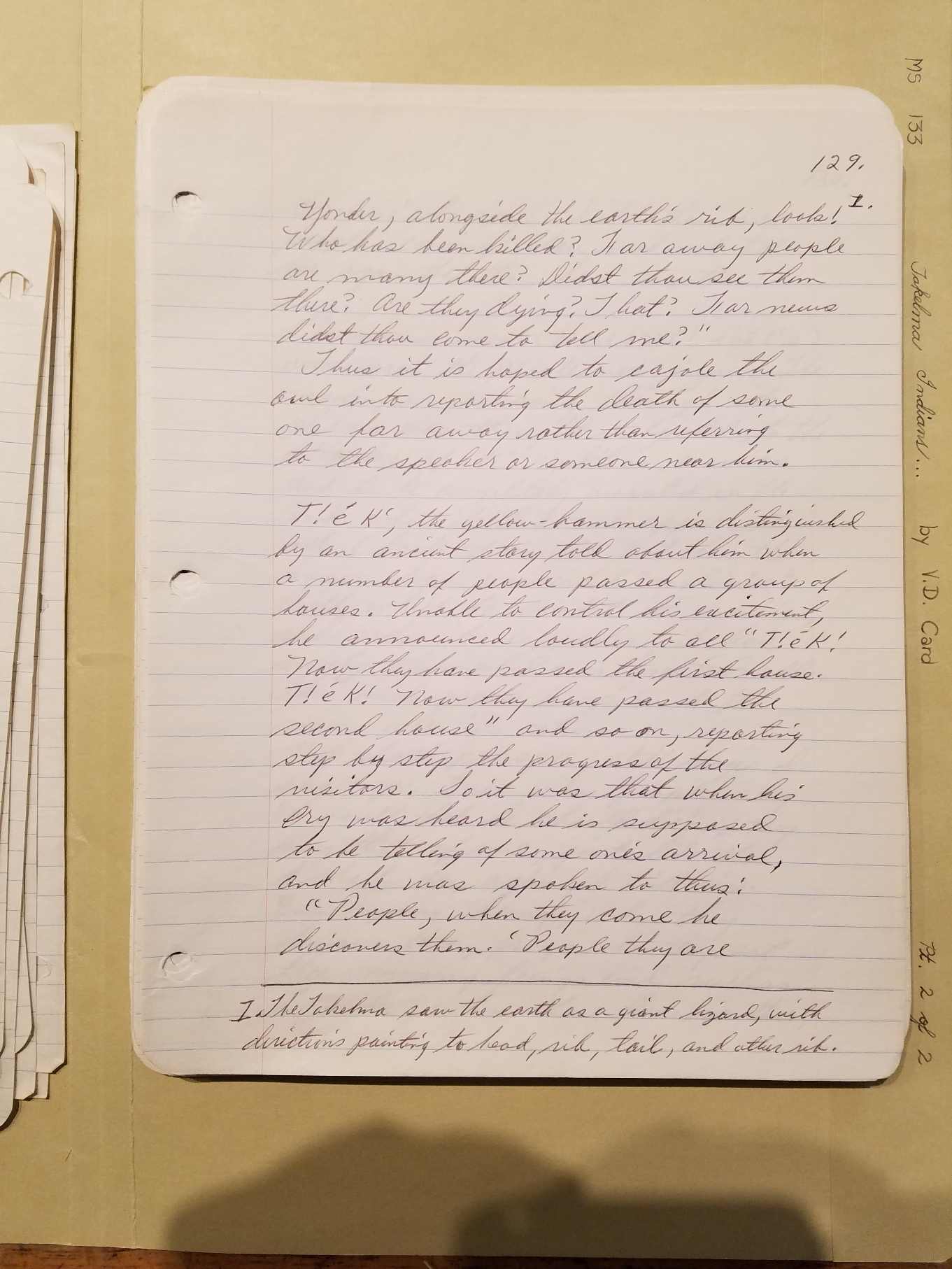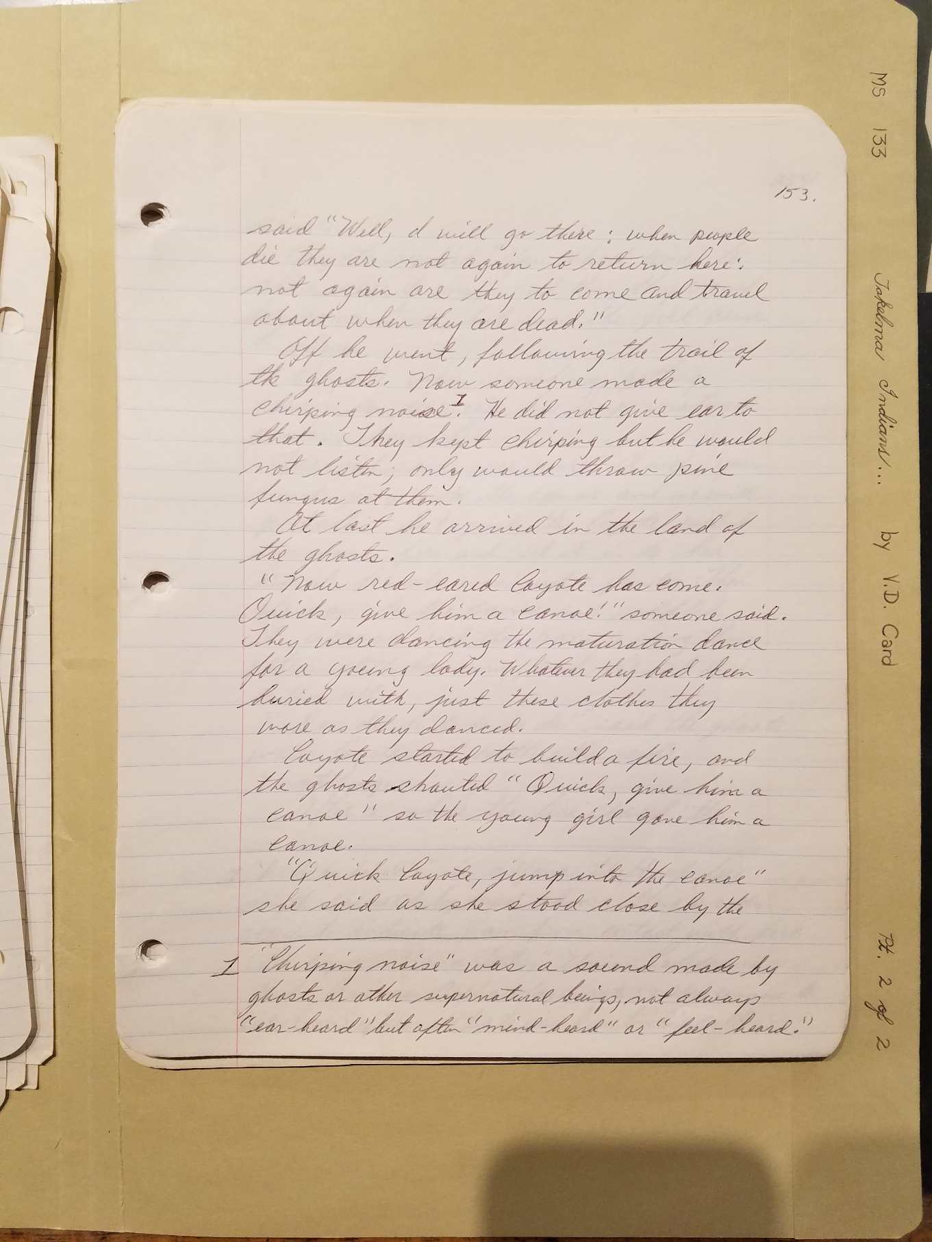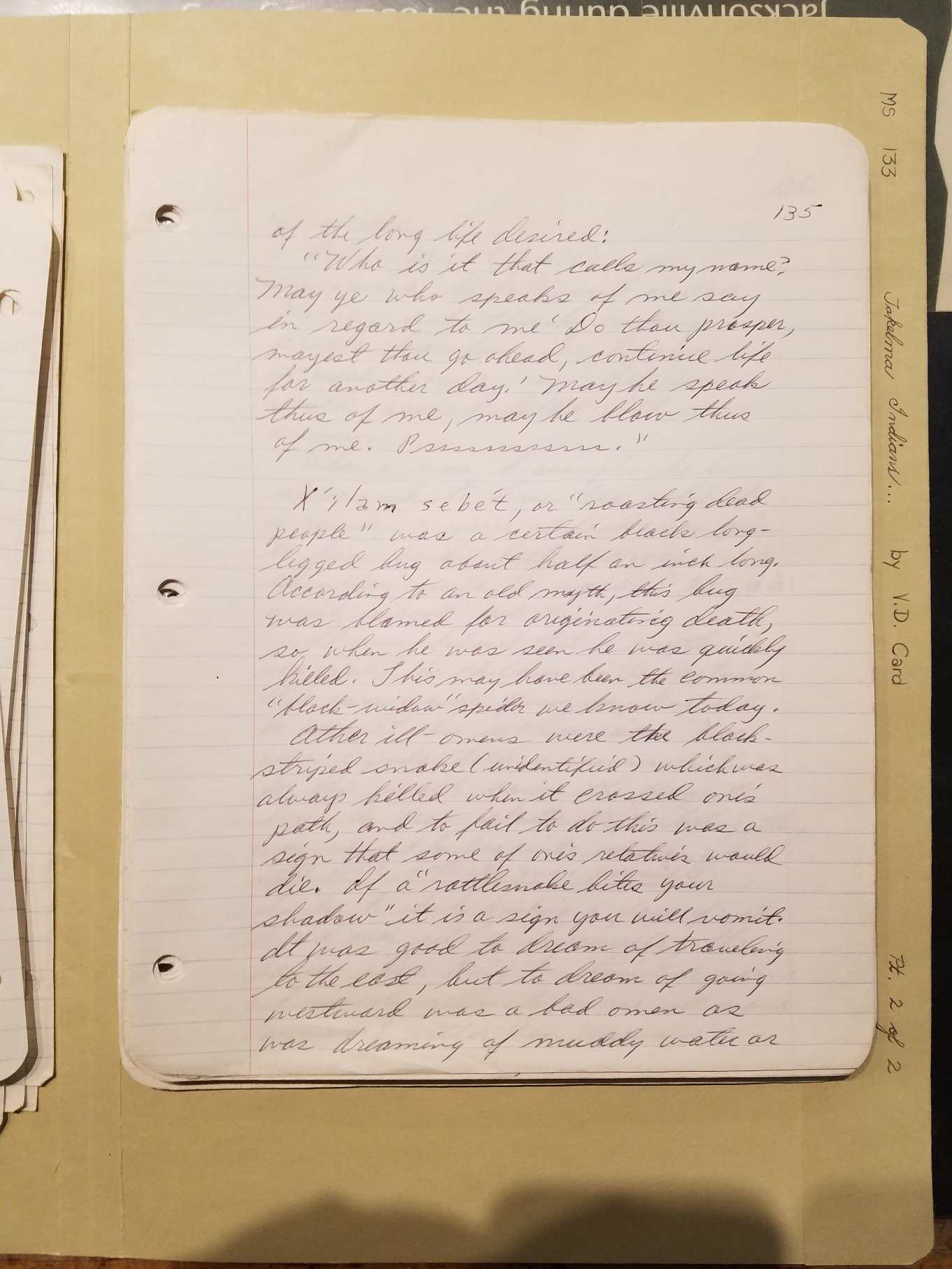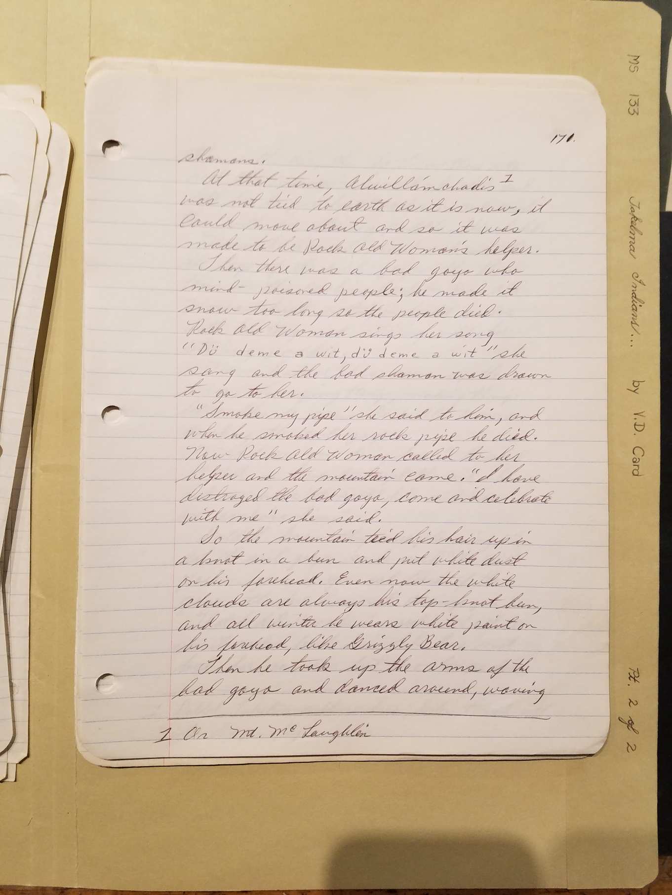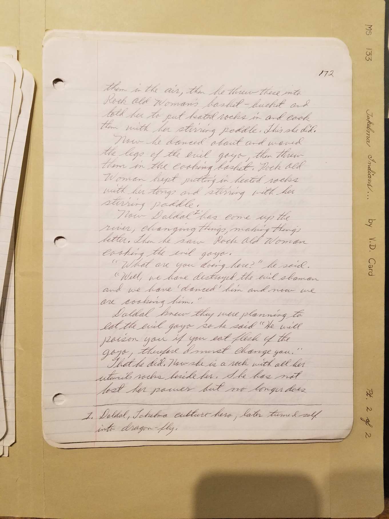 spirit, before Daldal made it into a spirit creature, the great mountain[Page 163] was fire on top. Then the people were cold, they had no fire, only the mountain had fire. Then Coyote asked other beings to help him get fire for the people. Now he set his helpers in the woods here and here and here, all the way to the mountain he set his helpers. Then he went to the great mountain and waited. Then the wind blew hard and the ground shook and fire was blown out of the mountain. Then Coyote caught fire and ran down the mountain with it but his tail was caught and burned some. That is why his tail is a little white now. Then he threw it to Wolf who ran with it and threw it to Beaver who ran with it and threw it to to Squirrel. That person put it on his neck and jumped from tree to tree and it scorched his neck so that place is scorched even to this day. Thus fire was passed along until it came to the people who gave some to the trees. That is why fire can be called forth from tree limbs today. [In fire-twirler, making fire by rubbing sticks, etc.] [Page 164]