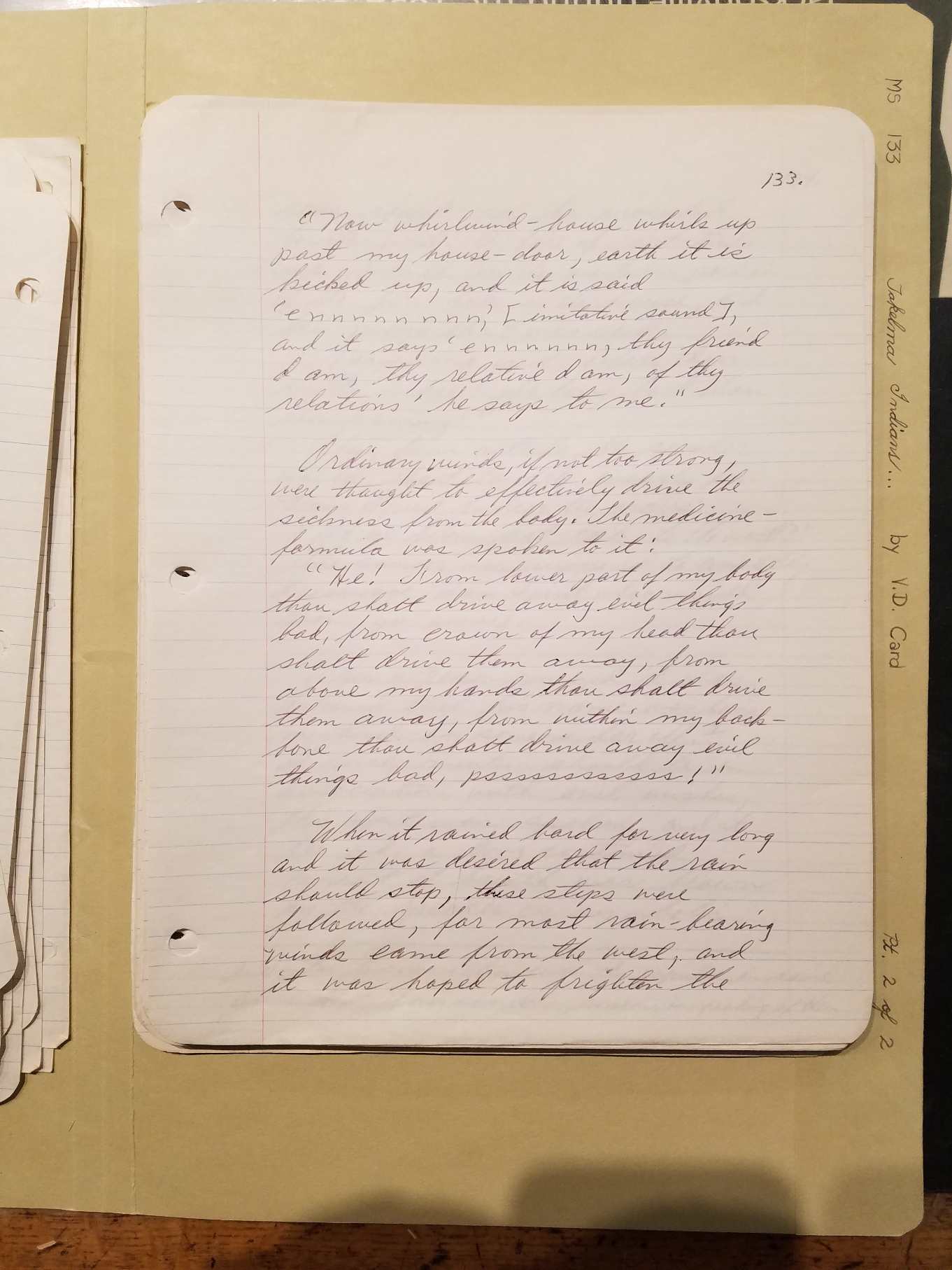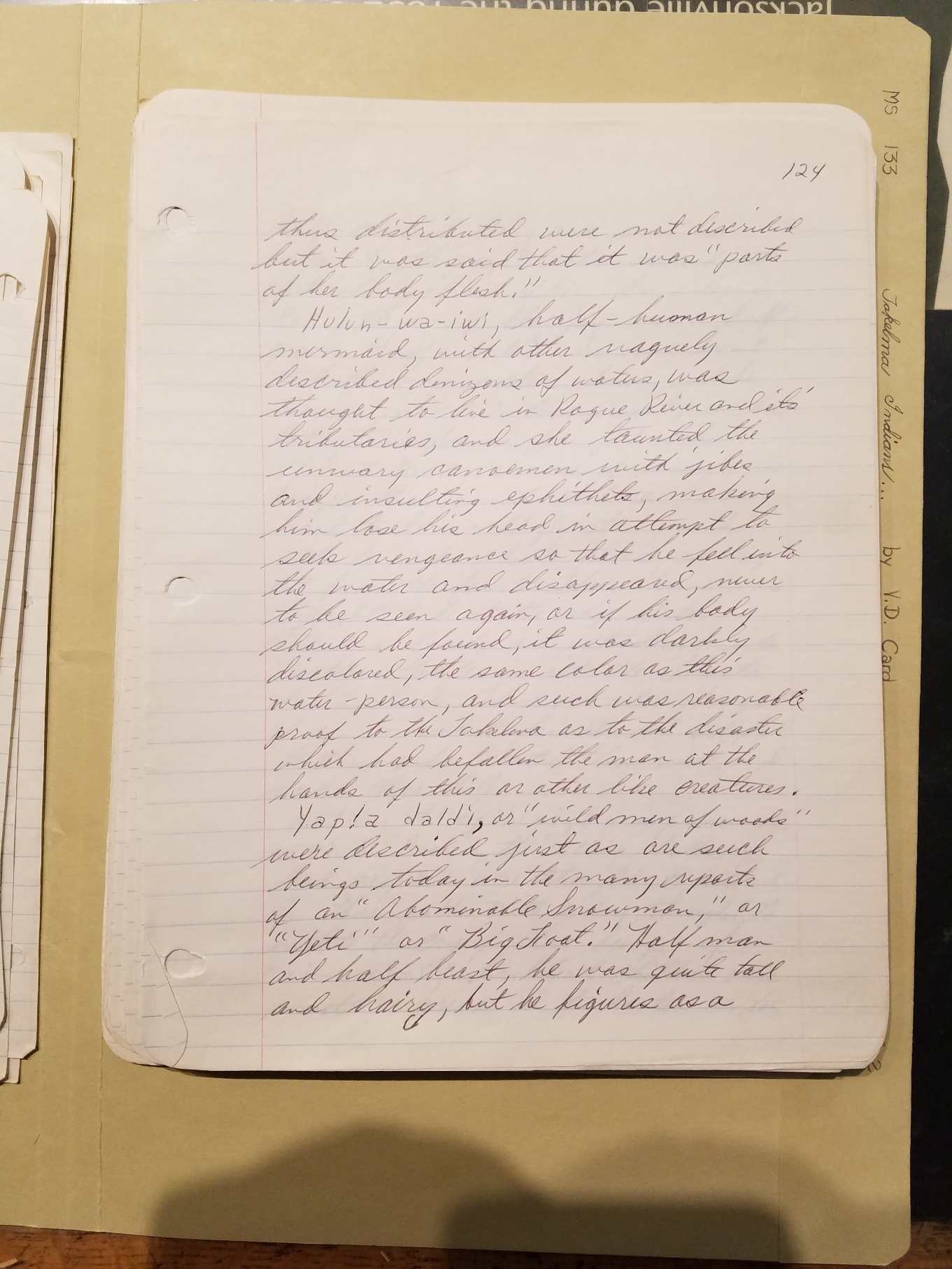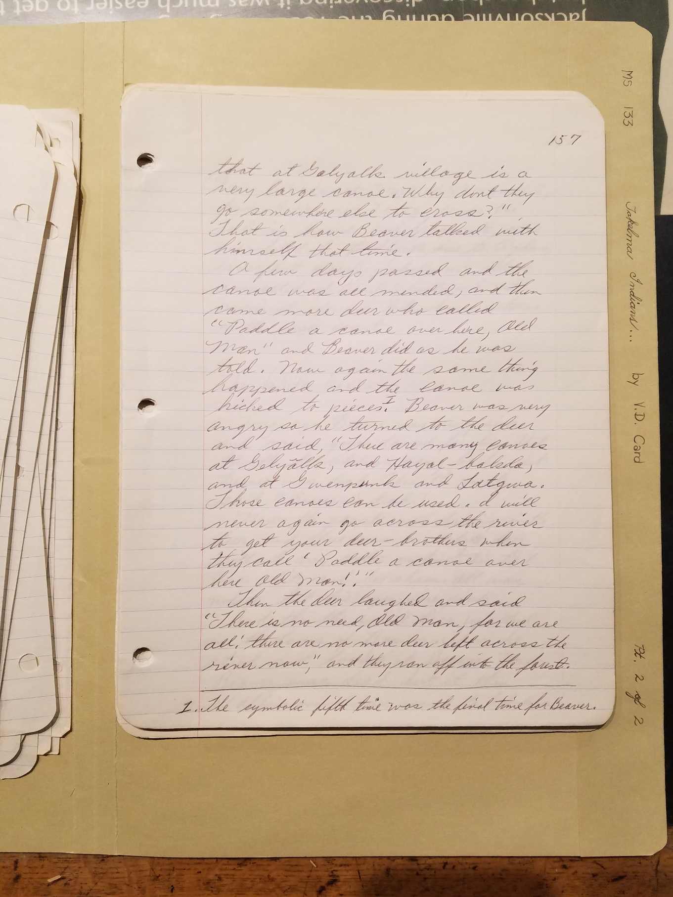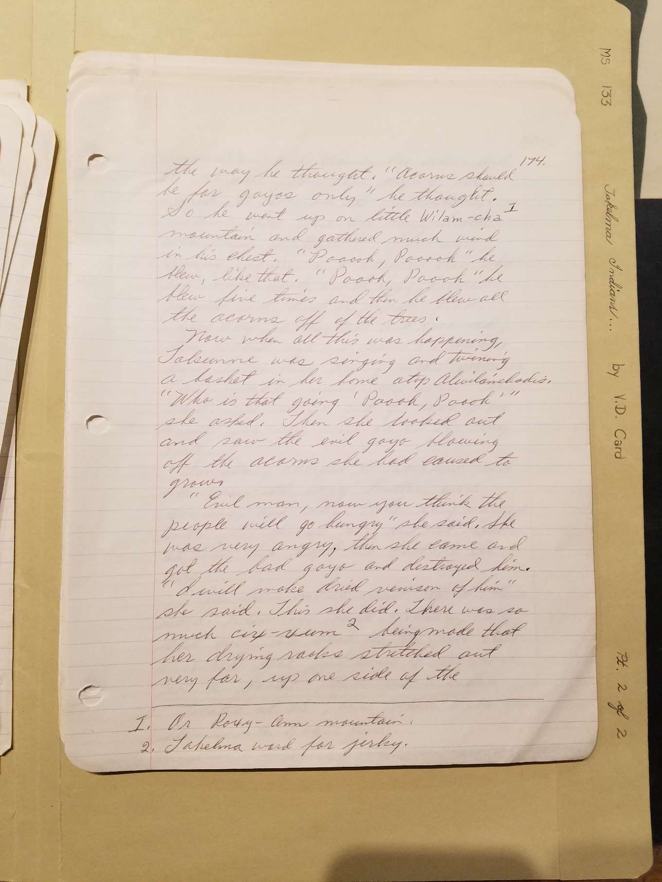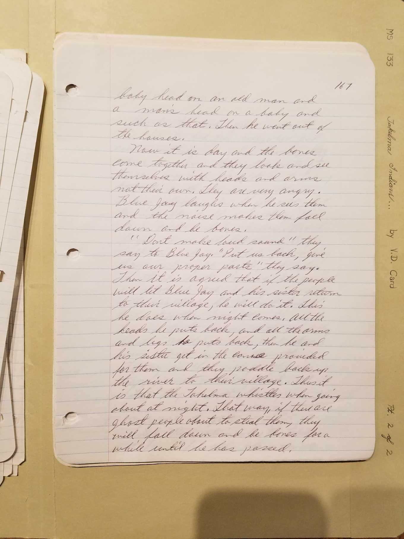 spirit, before Daldal made it into a spirit creature, the great mountain[Page 163] was fire on top. Then the people were cold, they had no fire, only the mountain had fire. Then Coyote asked other beings to help him get fire for the people. Now he set his helpers in the woods here and here and here, all the way to the mountain he set his helpers. Then he went to the great mountain and waited. Then the wind blew hard and the ground shook and fire was blown out of the mountain. Then Coyote caught fire and ran down the mountain with it but his tail was caught and burned some. That is why his tail is a little white now. Then he threw it to Wolf who ran with it and threw it to Beaver who ran with it and threw it to to Squirrel. That person put it on his neck and jumped from tree to tree and it scorched his neck so that place is scorched even to this day. Thus fire was passed along until it came to the people who gave some to the trees. That is why fire can be called forth from tree limbs today. [In fire-twirler, making fire by rubbing sticks, etc.] [Page 164]