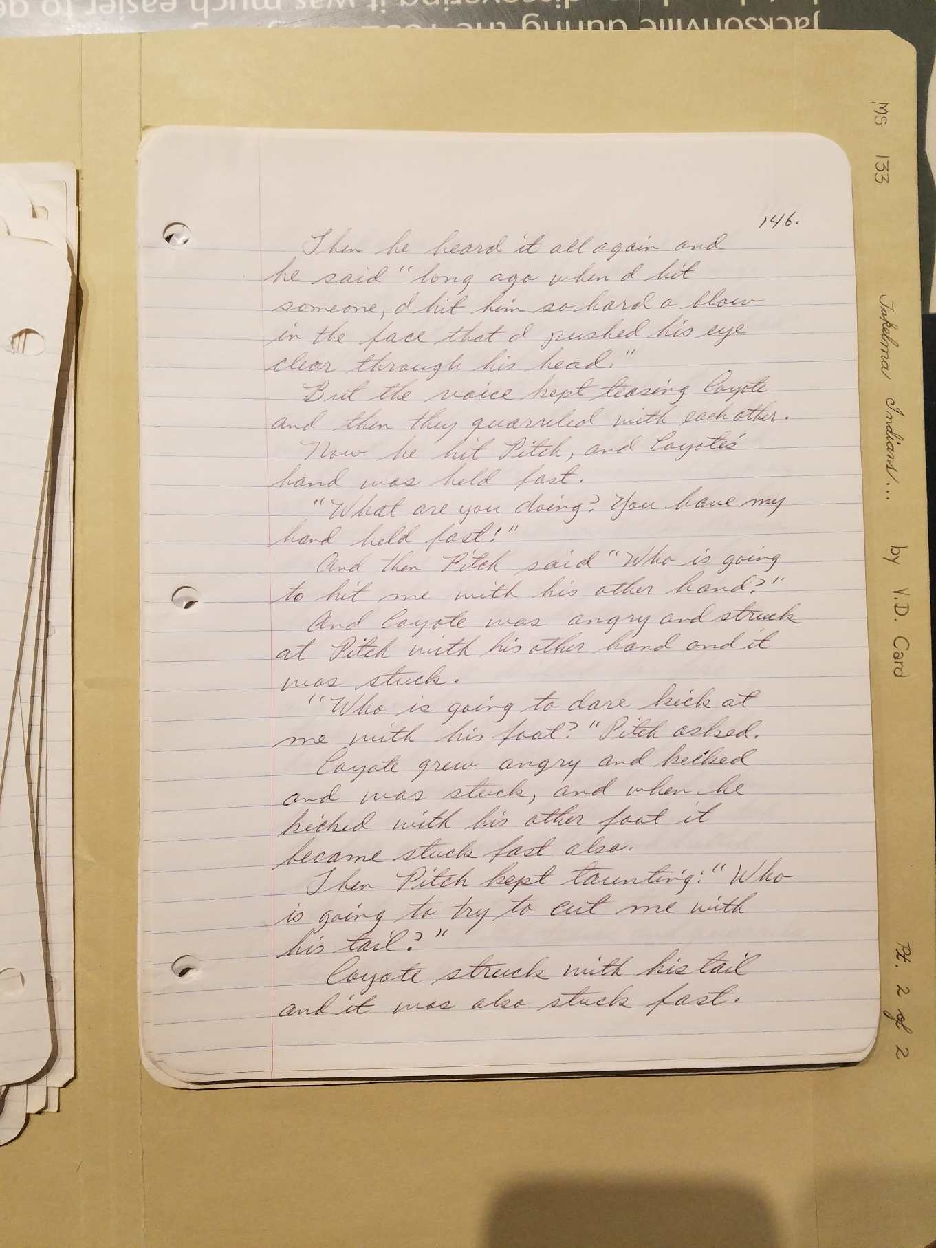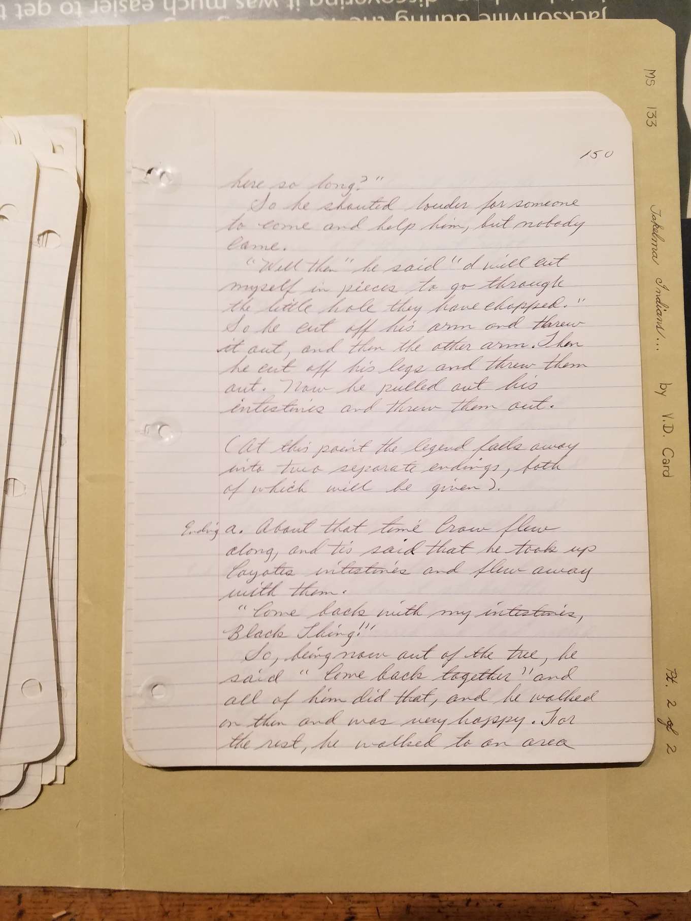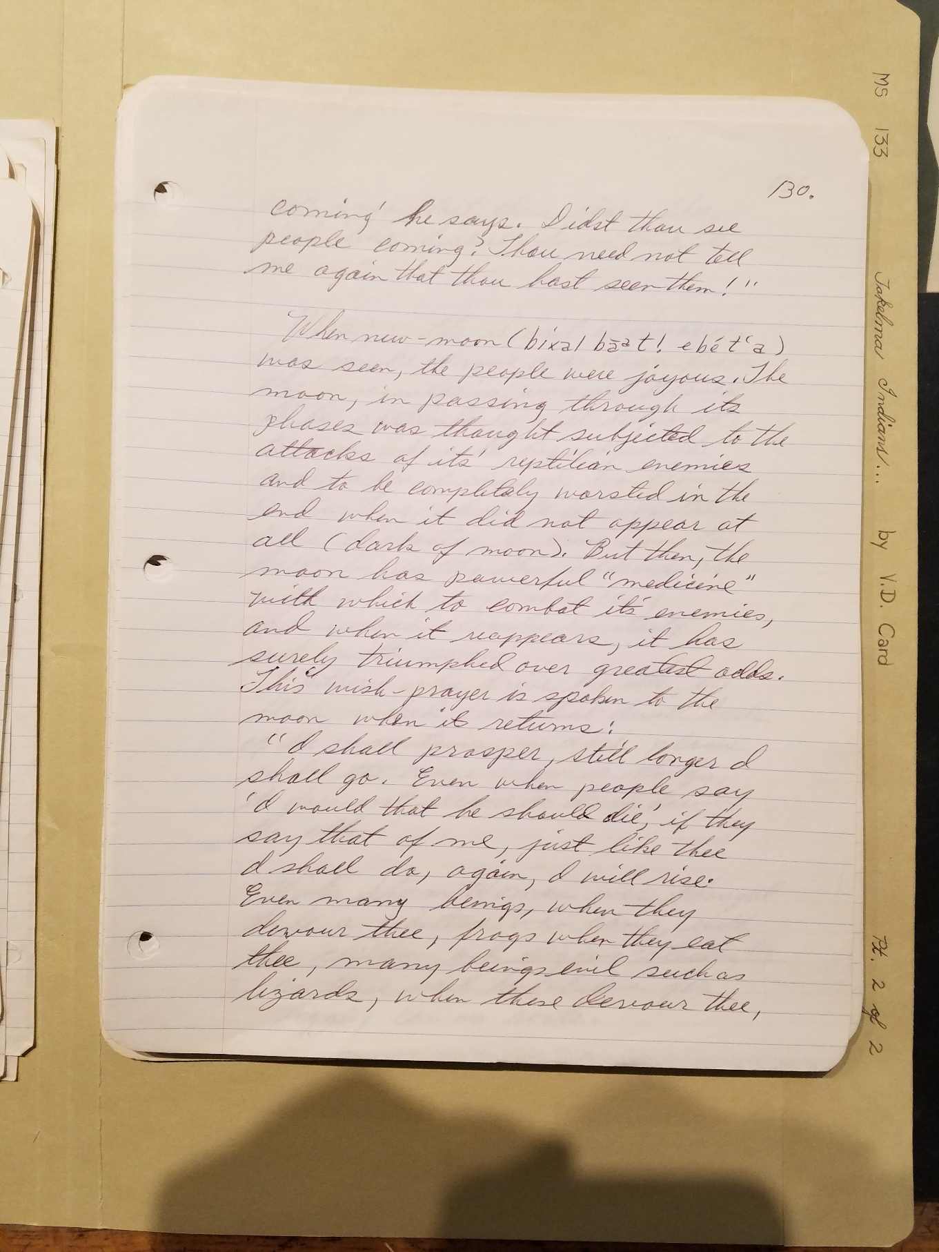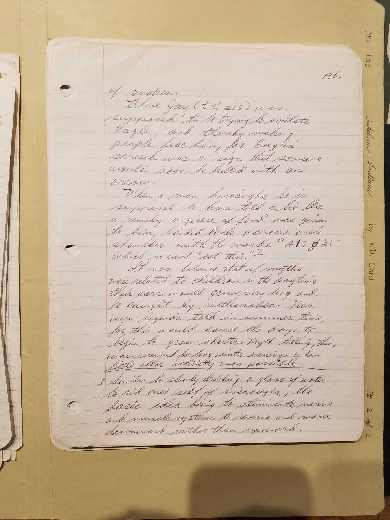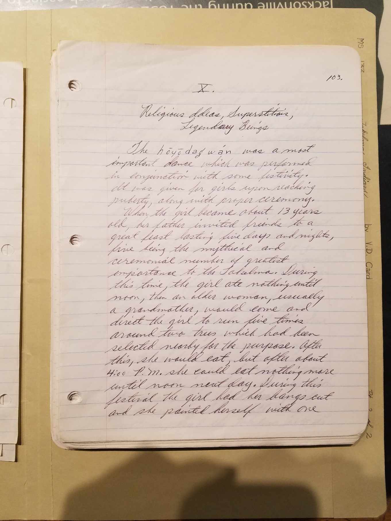 spirit, before Daldal made it into a spirit creature, the great mountain[Page 163] was fire on top. Then the people were cold, they had no fire, only the mountain had fire. Then Coyote asked other beings to help him get fire for the people. Now he set his helpers in the woods here and here and here, all the way to the mountain he set his helpers. Then he went to the great mountain and waited. Then the wind blew hard and the ground shook and fire was blown out of the mountain. Then Coyote caught fire and ran down the mountain with it but his tail was caught and burned some. That is why his tail is a little white now. Then he threw it to Wolf who ran with it and threw it to Beaver who ran with it and threw it to to Squirrel. That person put it on his neck and jumped from tree to tree and it scorched his neck so that place is scorched even to this day. Thus fire was passed along until it came to the people who gave some to the trees. That is why fire can be called forth from tree limbs today. [In fire-twirler, making fire by rubbing sticks, etc.] [Page 164]