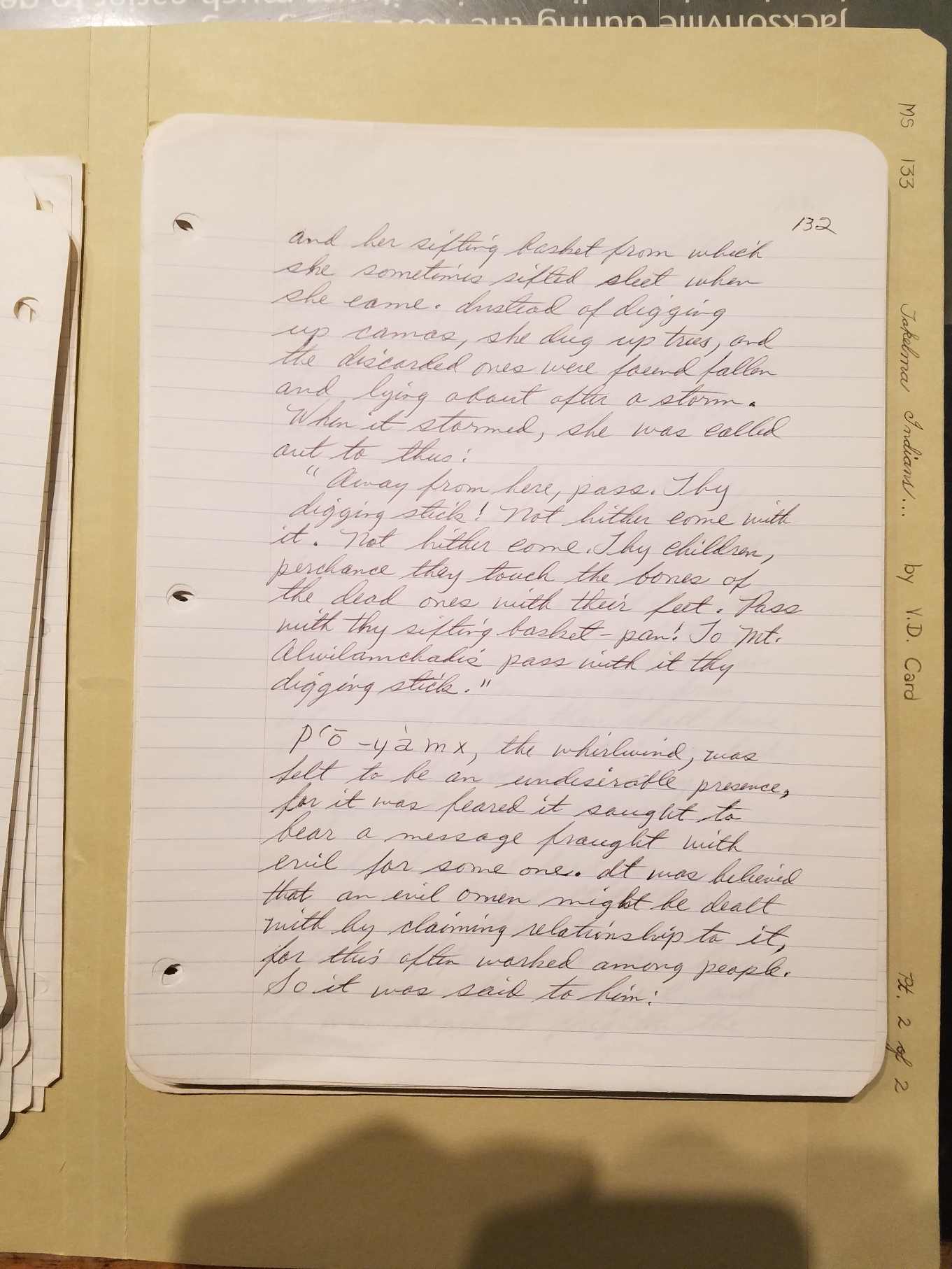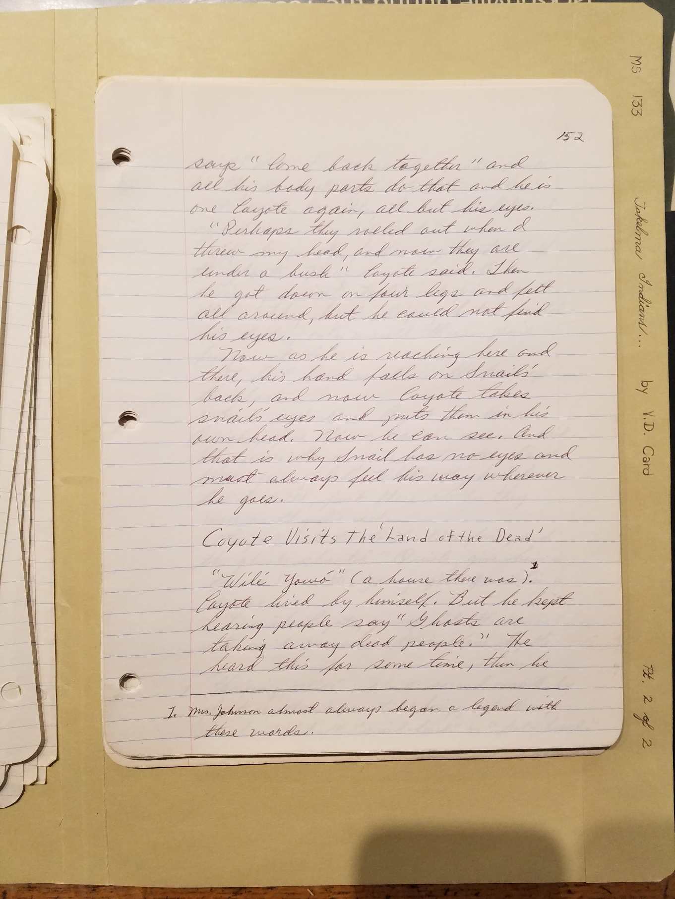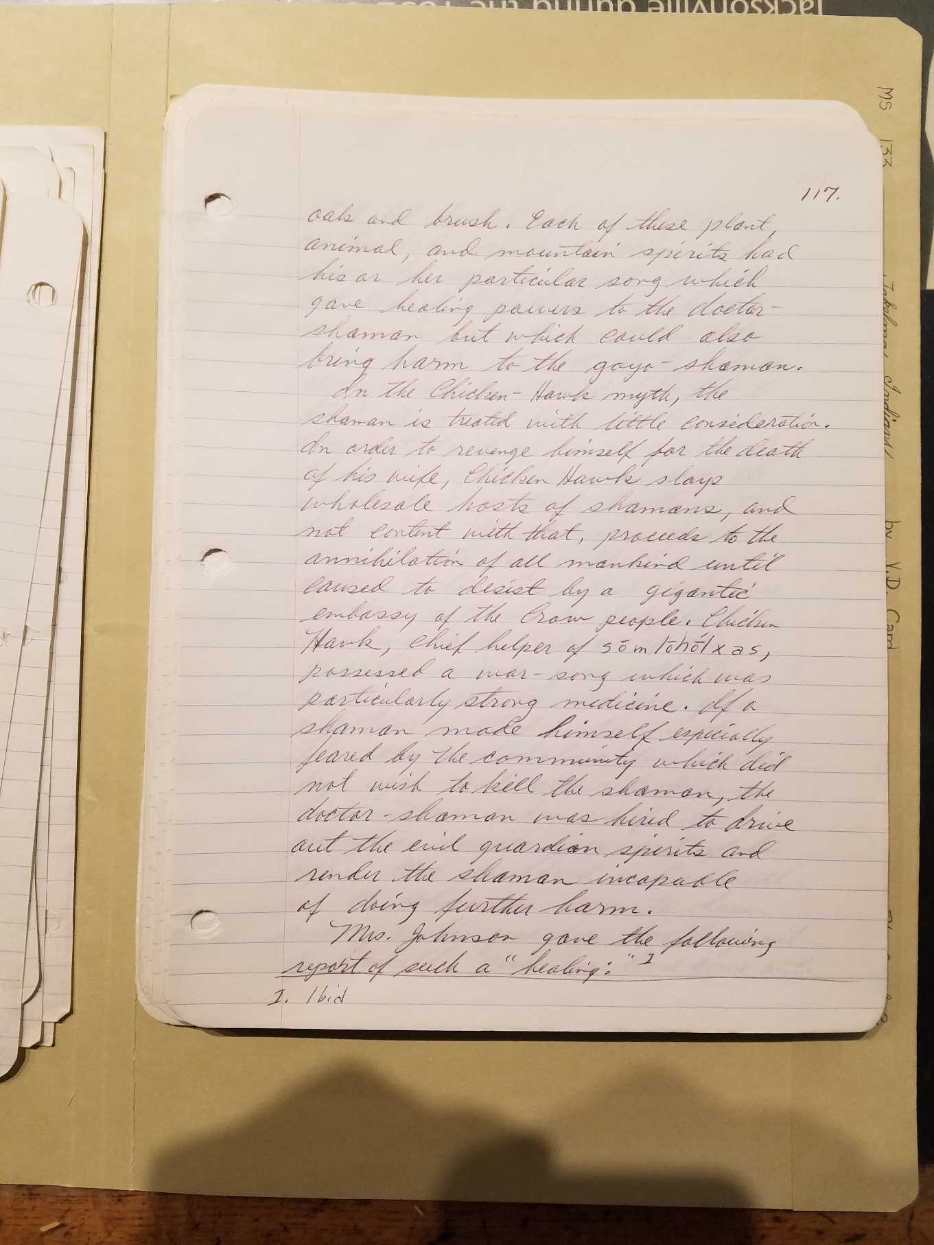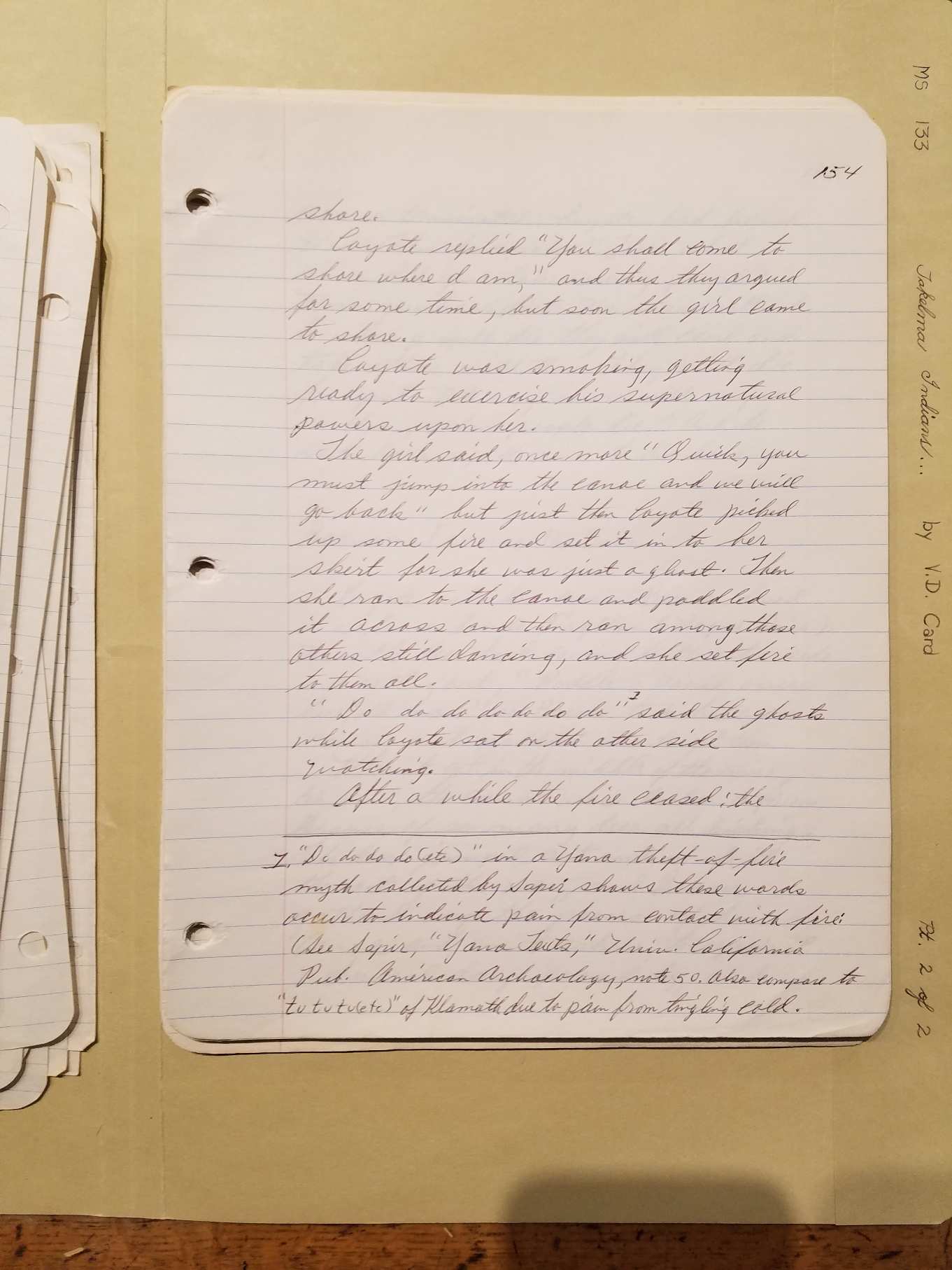 (pine) and he went in. "Close up!" he said to it, and the tree closed up. Then, tis said, all winter he was therein. He became hungry after a while, and he did not know how long he had been in the tree. He thought he heard people walking and he shouted "Do open it for me. Is not someone going about over there? Whenever I killed anything, did I not give you some of it to eat? Do open it up for me!" Then, 'tis said, after a little time a woodpecker came there. "Bak! Bak! Bak! Bak!" he said. Now he chopped and cut a hole, but this only gave Coyote a headache and so he was left there. [Page 149] Coyote listened. A long time passed and then again he shouted, "Oh! Whither have you all gone? If perchance I should kill anything after a while, you shall eat of it. Come here and chop for me. Open up for me!" After this Yellowhammer came to the tree and cut a hole. "Pau! Pau! Pau! Pau!" he said. Then for a long time he made his heart strong. Then Coyote said "Oh, my head is aching and my ears are deafened." Yellowhammer was then angry and he flew away also. So Coyote called again, and soon the Big Woodpecker came and chopped but Coyote got another headache and shouted, so that Big Woodpecker flew away with his feelings hurt. So there was Coyote, still sitting in the tree. Now he could see out through the little holes they had chopped. "Oh, has summer come already?" he asked himself. "Can I have been [Page 150] here so long?" So he shouted louder for someone to come and help him, but nobody came. "Well then" he said "I will cut myself in pieces to go through the little hole they have chopped." So he cut off his arm and threw it out, and then the other arm. Then he cut off his legs and threw them out. Now he pulled out his intestines and threw them out. (At this point the legend falls away into two separate endings, both of which will be given). Ending A. About that time Crow flew long, and tis said that he took up Coyote's intestines and flew away with them. Come back with my intestines, Black Thing! So, being now out of the tree, he said "Come back together" and all of him did that and he walked on then and was very happy. For the rest, he walked to an area [Page 151] which had been burned off for the purpose of food gathering, and he started right in to eat grasshoppers but they went right through him and fell out on the ground for he had no intestines. Now squirrel is there and teases Coyote who looked back and saw his condition. Then Coyote took some Pitch from a pine tree and plugs the hole so the grasshoppers will no longer fall out. Then he went back to the burned area to find food, but now the hot coals sets the Pitch on fire, and squirrel screams to warn him. The Coyote runs to the river and jumps in, to put out the fire. End B. Now Coyote throws out his head and when it strikes the ground, Crow steals the eyes which were jarred and had rolled out. Come back here with my eyes Coyote says, but Crow has flown away. Now, outside the tree, Coyote [Page 152] says "Come back together" and his body parts do that and he is one Coyote again, all but his eyes. Perhaps they rolled out when I threw my head, and now they are under a bush Coyote said. Then he got down on four legs and felt all around, but he could not find his eyes. Now as he is reaching here and there, his hand falls on Snail's back, and now Coyote takes snail's eyes and puts them in his own head. Now he can see. And that is why Snail has no eyes and must always feel his way wherever he goes. Coyote Visits the 'Land of the Dead' Wili Youvo (a house there was) [Mrs. Johnson almost always began a legend with these words.] Coyote lived by himself. But he kept hearing people say "Ghosts are taking away dead people." He heard this for some time, then he [Page 153] said "Well, I will go there: when people die they are not again to return here: not again are they to come and travel about when they are dead." Off he went, following the trail of the ghosts. Now someone made a chirping noise. ["Chirping noise" was a sound made by ghosts or other supernatural beings, not always "ear-heard" but often "mind-heard" or "feel-heard."] He did not give ear to that. They kept chirping but he would not listen; only would throw pine fungus at them. At least he arrived in the land of the ghosts. Now red-eared Coyote has come. Quick, give him a canoe. someone said. They were dancing the maturation dance for a young lady. Whatever they had been buried with, just these clothes they wore as they danced. Coyote started to build a fire, and the ghosts shouted "Quick, give him a canoe" so the young girl gave him a canoe. Quick Coyote, jump into the canoe she said as she stood close by the [Page 154] shore. Coyote replied "you shall come to shore where I am," and thus they argued for some time, but soon the girl came to shore. Coyote was smoking, getting ready to exercise his supernatural powers upon her. The girl said, once more "Quick, you must jump into the canoe and we will go back" but just then Coyote picked up some fire and set it in to her skirt for she was just a ghost. Then she ran to the canoe and paddled it across and then ran among those others still dancing, and she set fire to them all. Do do do do do do do said the ghosts while Coyote sat on the other side watching. ["Do do do do (etc)" in a Yana theft-of-fire myth collected by Sapir shows these words occur to indicate pain from contact with fire: (See Sapir, "Yana Texts," Univ. California Pub. American Archaeology, note 50. Also compare to "tu tu tu (etc)" of Klamath due to pain from tingling cold.] After a while the fire ceased: the [Page 155] [word missing] were exterminated: Coyote had burned them. Then he spoke "For what reason did you take away people? Now you have died. No more will it be when people die they will come and take others with them. They will die for good. Not any more will anyone see them, when people die." And he went back up the river to his home.