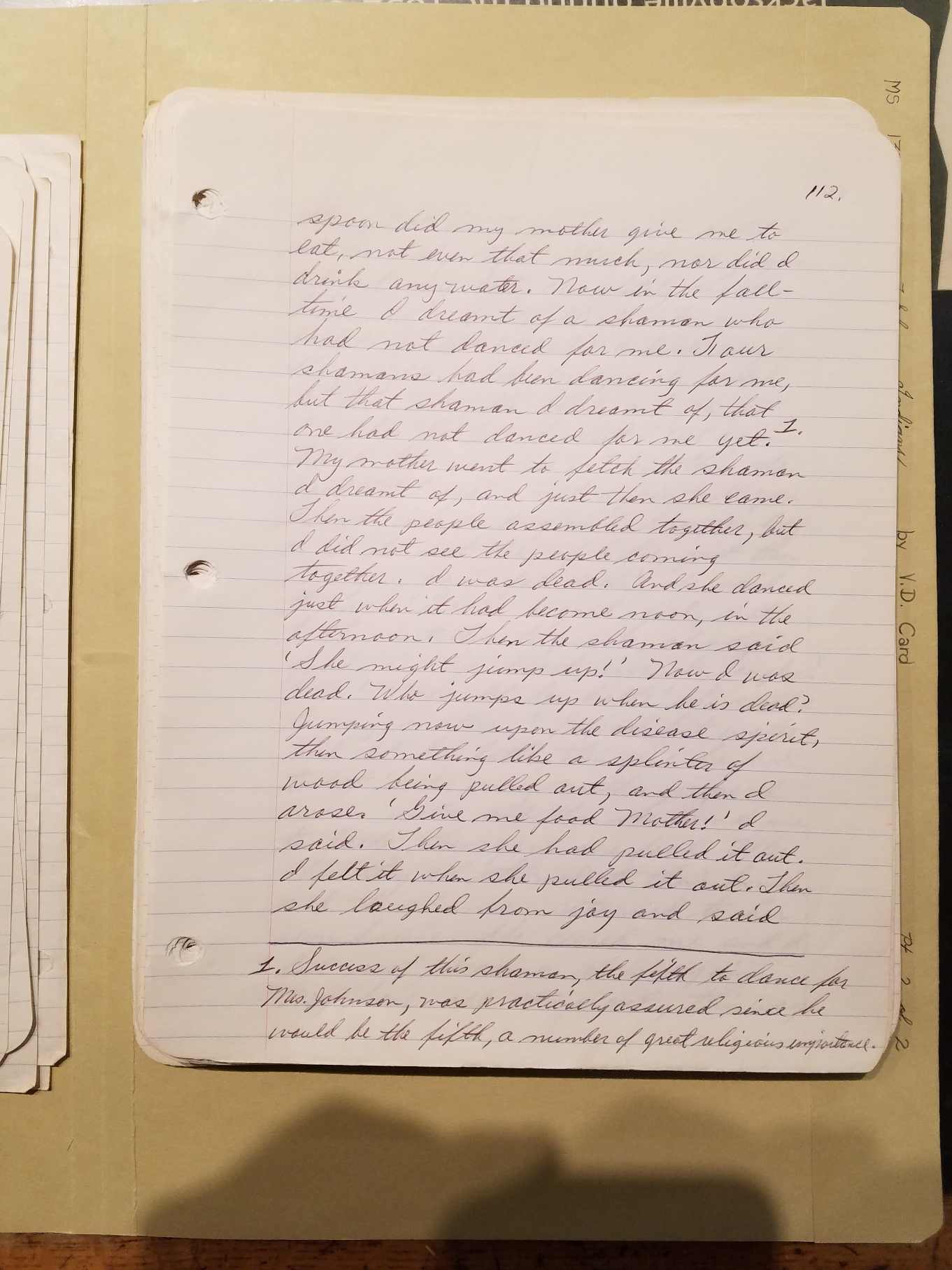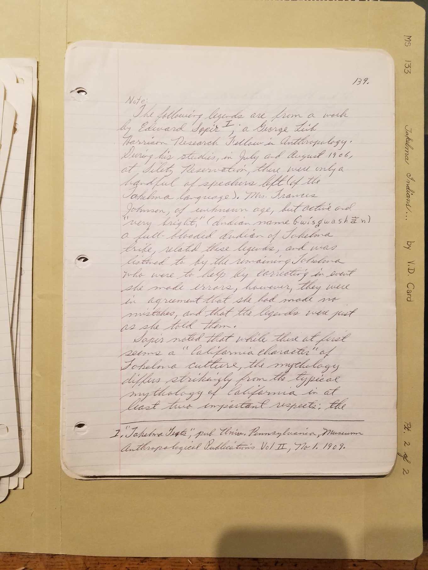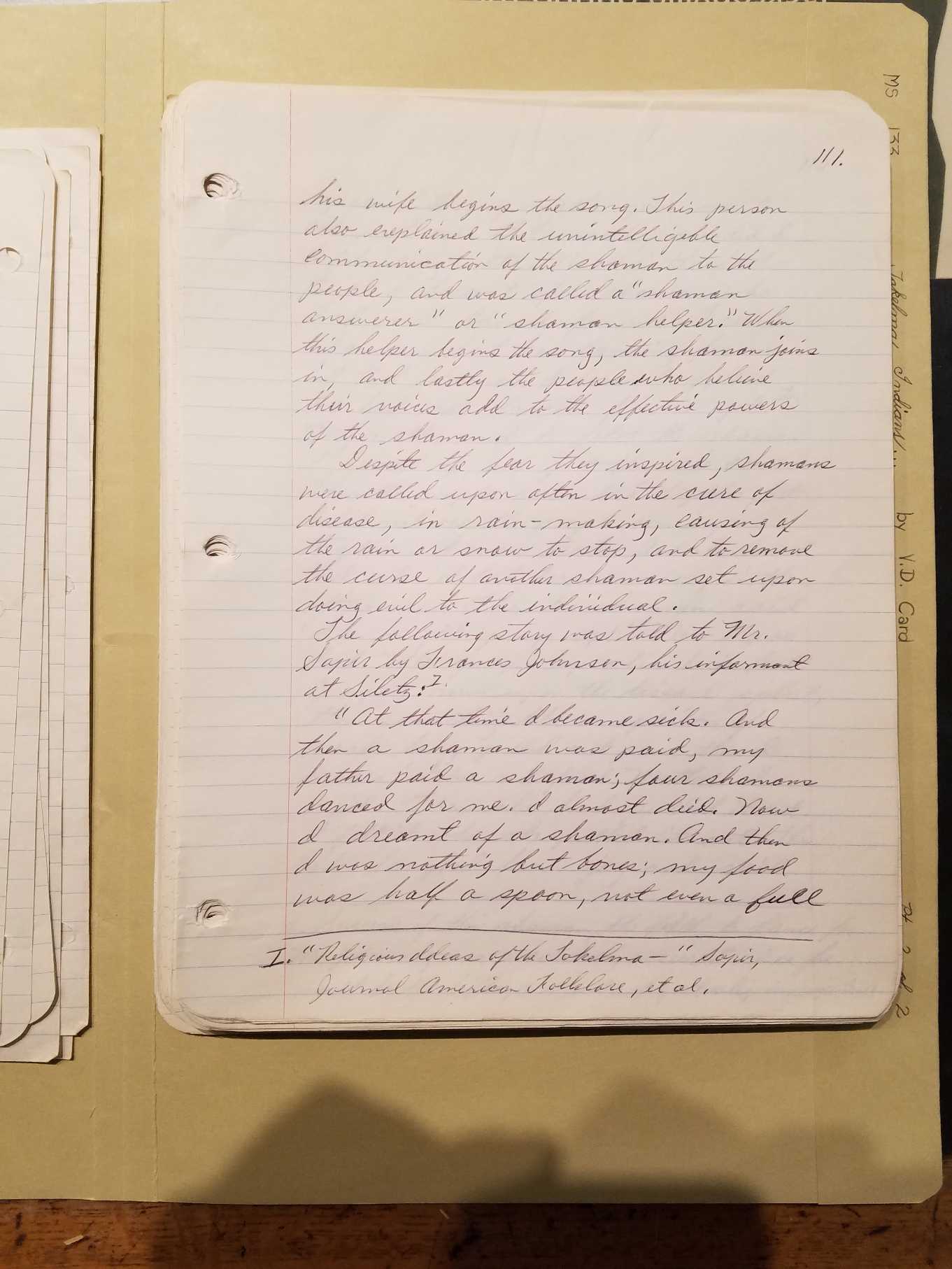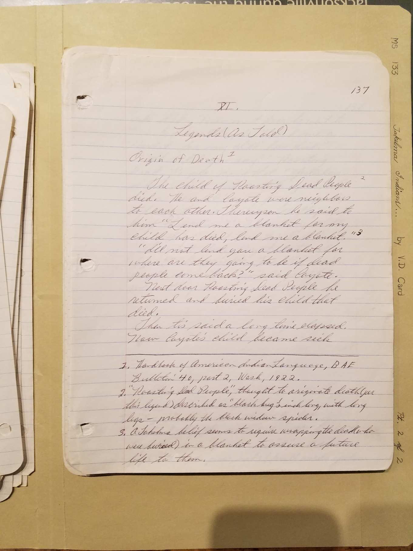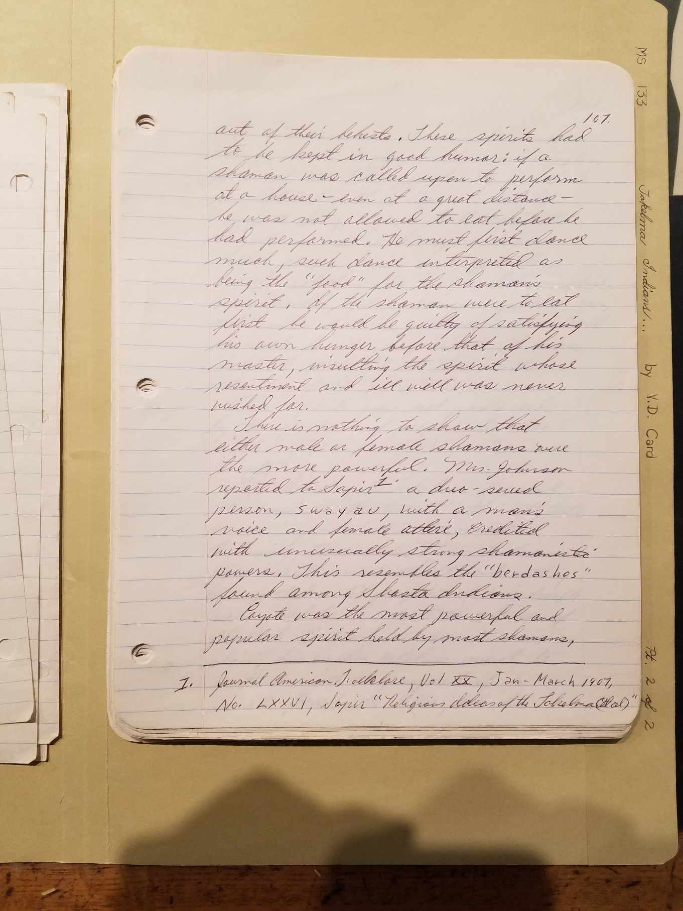 (pine) and he went in. "Close up!" he said to it, and the tree closed up. Then, tis said, all winter he was therein. He became hungry after a while, and he did not know how long he had been in the tree. He thought he heard people walking and he shouted "Do open it for me. Is not someone going about over there? Whenever I killed anything, did I not give you some of it to eat? Do open it up for me!" Then, 'tis said, after a little time a woodpecker came there. "Bak! Bak! Bak! Bak!" he said. Now he chopped and cut a hole, but this only gave Coyote a headache and so he was left there. [Page 149] Coyote listened. A long time passed and then again he shouted, "Oh! Whither have you all gone? If perchance I should kill anything after a while, you shall eat of it. Come here and chop for me. Open up for me!" After this Yellowhammer came to the tree and cut a hole. "Pau! Pau! Pau! Pau!" he said. Then for a long time he made his heart strong. Then Coyote said "Oh, my head is aching and my ears are deafened." Yellowhammer was then angry and he flew away also. So Coyote called again, and soon the Big Woodpecker came and chopped but Coyote got another headache and shouted, so that Big Woodpecker flew away with his feelings hurt. So there was Coyote, still sitting in the tree. Now he could see out through the little holes they had chopped. "Oh, has summer come already?" he asked himself. "Can I have been [Page 150] here so long?" So he shouted louder for someone to come and help him, but nobody came. "Well then" he said "I will cut myself in pieces to go through the little hole they have chopped." So he cut off his arm and threw it out, and then the other arm. Then he cut off his legs and threw them out. Now he pulled out his intestines and threw them out. (At this point the legend falls away into two separate endings, both of which will be given). Ending A. About that time Crow flew long, and tis said that he took up Coyote's intestines and flew away with them. Come back with my intestines, Black Thing! So, being now out of the tree, he said "Come back together" and all of him did that and he walked on then and was very happy. For the rest, he walked to an area [Page 151] which had been burned off for the purpose of food gathering, and he started right in to eat grasshoppers but they went right through him and fell out on the ground for he had no intestines. Now squirrel is there and teases Coyote who looked back and saw his condition. Then Coyote took some Pitch from a pine tree and plugs the hole so the grasshoppers will no longer fall out. Then he went back to the burned area to find food, but now the hot coals sets the Pitch on fire, and squirrel screams to warn him. The Coyote runs to the river and jumps in, to put out the fire. End B. Now Coyote throws out his head and when it strikes the ground, Crow steals the eyes which were jarred and had rolled out. Come back here with my eyes Coyote says, but Crow has flown away. Now, outside the tree, Coyote [Page 152] says "Come back together" and his body parts do that and he is one Coyote again, all but his eyes. Perhaps they rolled out when I threw my head, and now they are under a bush Coyote said. Then he got down on four legs and felt all around, but he could not find his eyes. Now as he is reaching here and there, his hand falls on Snail's back, and now Coyote takes snail's eyes and puts them in his own head. Now he can see. And that is why Snail has no eyes and must always feel his way wherever he goes. Coyote Visits the 'Land of the Dead' Wili Youvo (a house there was) [Mrs. Johnson almost always began a legend with these words.] Coyote lived by himself. But he kept hearing people say "Ghosts are taking away dead people." He heard this for some time, then he [Page 153] said "Well, I will go there: when people die they are not again to return here: not again are they to come and travel about when they are dead." Off he went, following the trail of the ghosts. Now someone made a chirping noise. ["Chirping noise" was a sound made by ghosts or other supernatural beings, not always "ear-heard" but often "mind-heard" or "feel-heard."] He did not give ear to that. They kept chirping but he would not listen; only would throw pine fungus at them. At least he arrived in the land of the ghosts. Now red-eared Coyote has come. Quick, give him a canoe. someone said. They were dancing the maturation dance for a young lady. Whatever they had been buried with, just these clothes they wore as they danced. Coyote started to build a fire, and the ghosts shouted "Quick, give him a canoe" so the young girl gave him a canoe. Quick Coyote, jump into the canoe she said as she stood close by the [Page 154] shore. Coyote replied "you shall come to shore where I am," and thus they argued for some time, but soon the girl came to shore. Coyote was smoking, getting ready to exercise his supernatural powers upon her. The girl said, once more "Quick, you must jump into the canoe and we will go back" but just then Coyote picked up some fire and set it in to her skirt for she was just a ghost. Then she ran to the canoe and paddled it across and then ran among those others still dancing, and she set fire to them all. Do do do do do do do said the ghosts while Coyote sat on the other side watching. ["Do do do do (etc)" in a Yana theft-of-fire myth collected by Sapir shows these words occur to indicate pain from contact with fire: (See Sapir, "Yana Texts," Univ. California Pub. American Archaeology, note 50. Also compare to "tu tu tu (etc)" of Klamath due to pain from tingling cold.] After a while the fire ceased: the [Page 155] [word missing] were exterminated: Coyote had burned them. Then he spoke "For what reason did you take away people? Now you have died. No more will it be when people die they will come and take others with them. They will die for good. Not any more will anyone see them, when people die." And he went back up the river to his home.