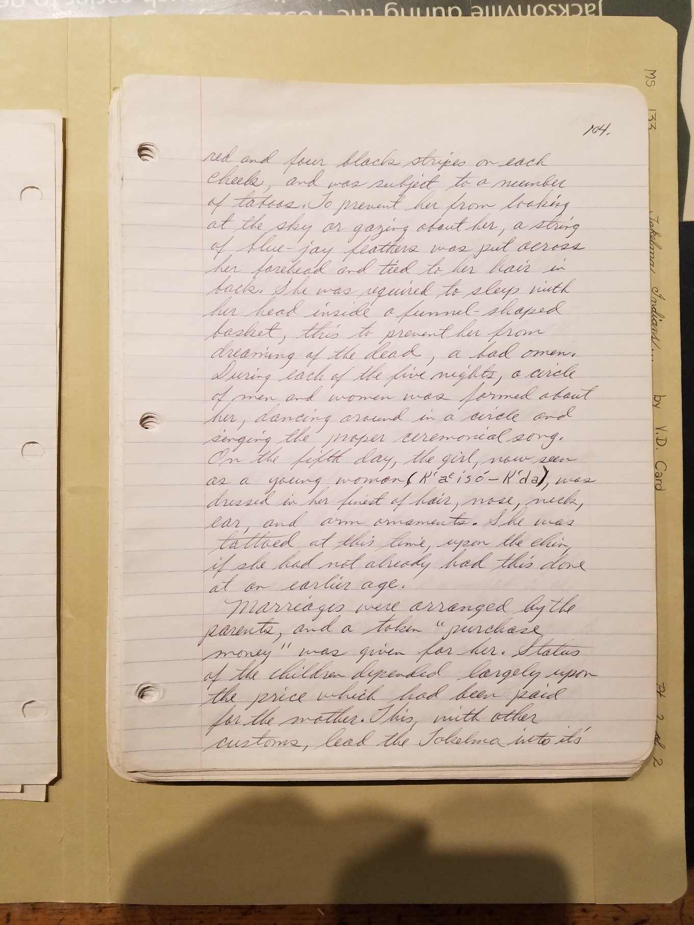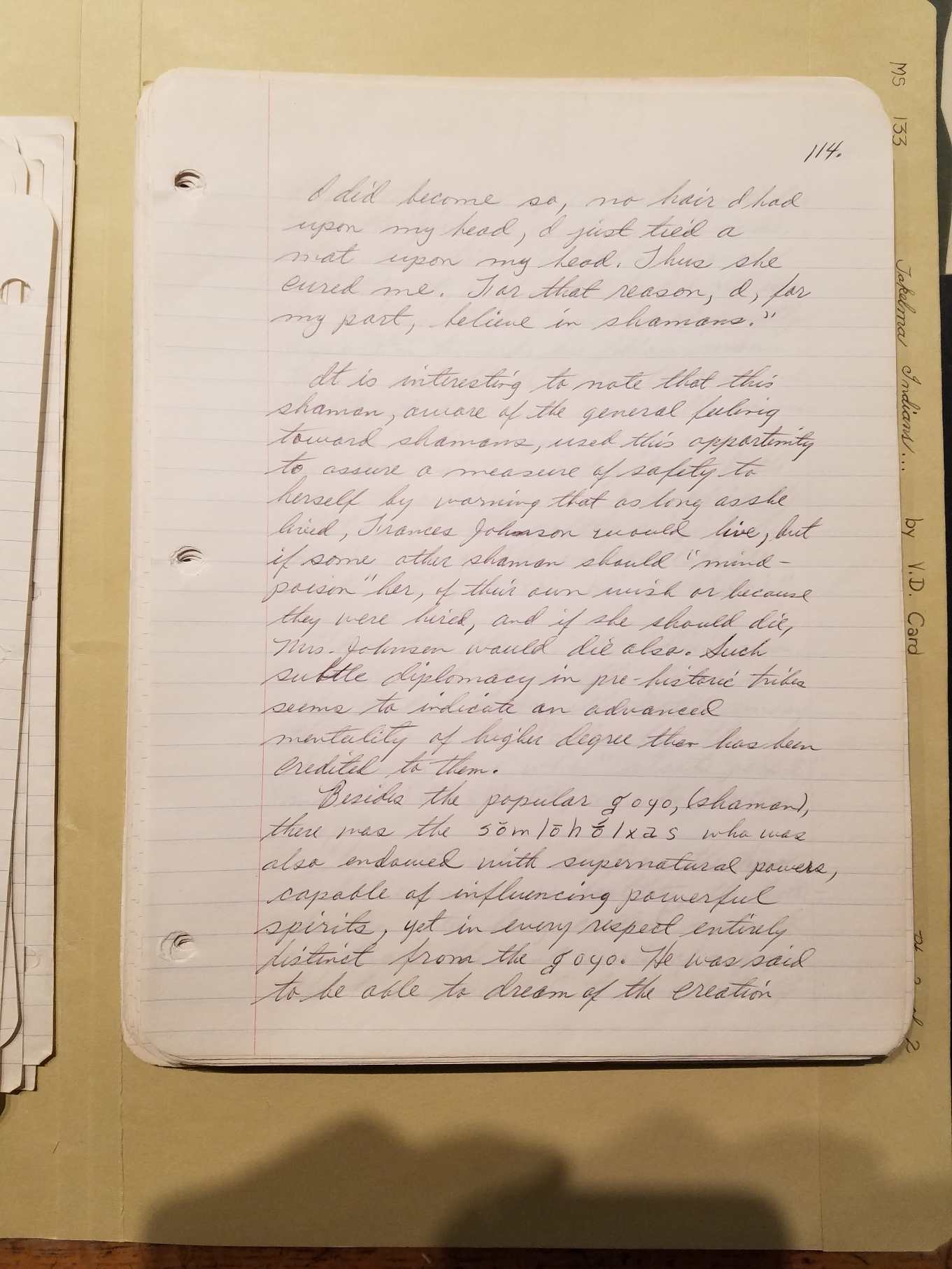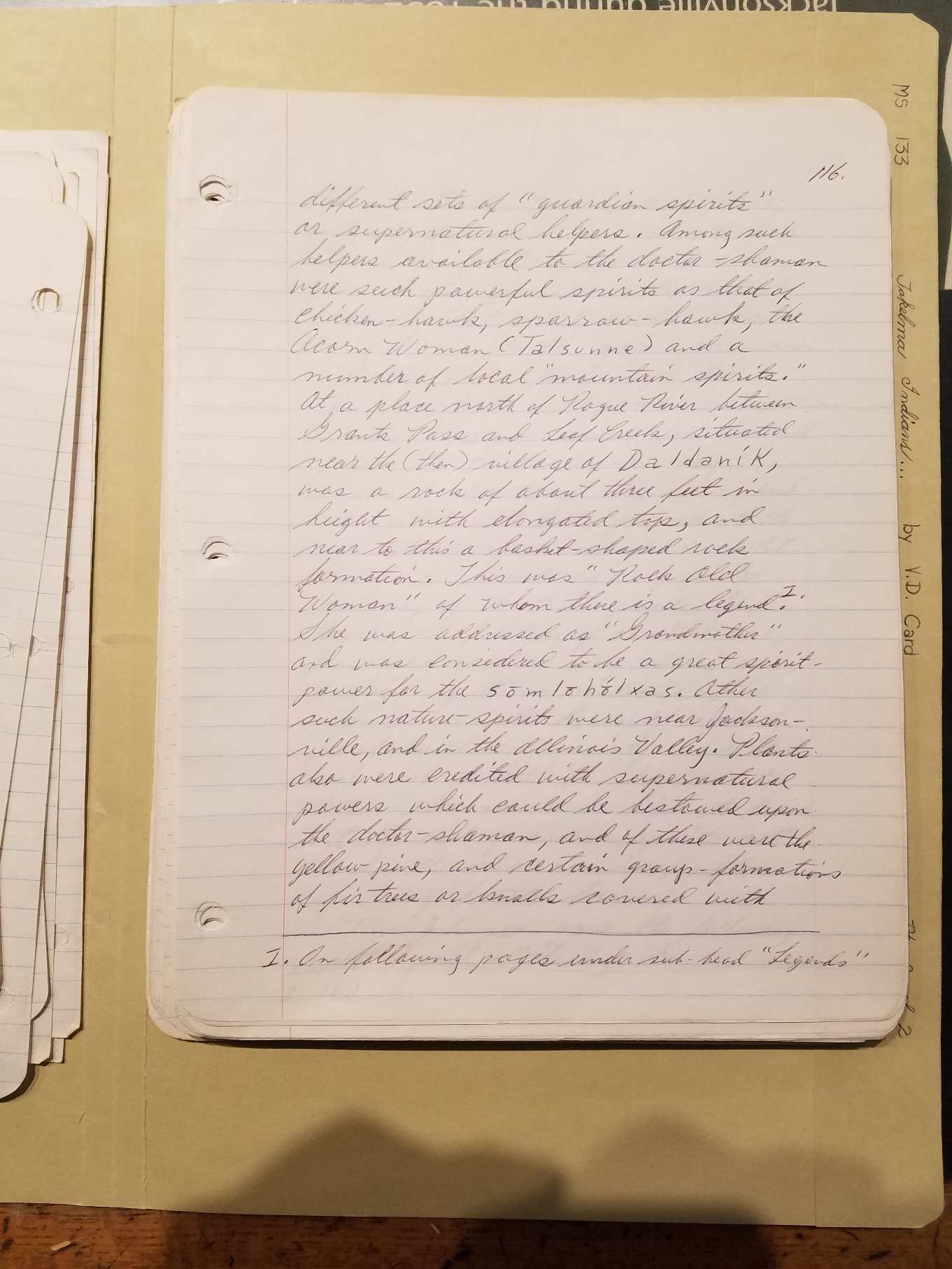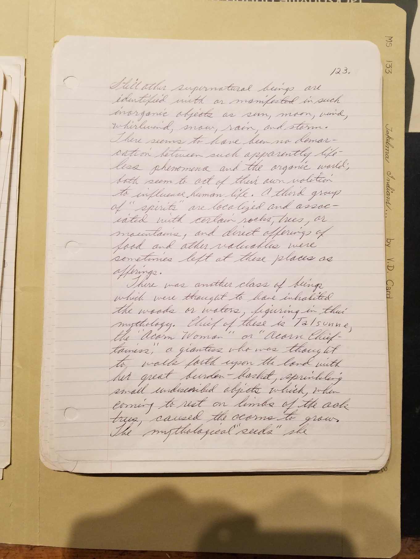 (pine) and he went in. "Close up!" he said to it, and the tree closed up. Then, tis said, all winter he was therein. He became hungry after a while, and he did not know how long he had been in the tree. He thought he heard people walking and he shouted "Do open it for me. Is not someone going about over there? Whenever I killed anything, did I not give you some of it to eat? Do open it up for me!" Then, 'tis said, after a little time a woodpecker came there. "Bak! Bak! Bak! Bak!" he said. Now he chopped and cut a hole, but this only gave Coyote a headache and so he was left there. [Page 149] Coyote listened. A long time passed and then again he shouted, "Oh! Whither have you all gone? If perchance I should kill anything after a while, you shall eat of it. Come here and chop for me. Open up for me!" After this Yellowhammer came to the tree and cut a hole. "Pau! Pau! Pau! Pau!" he said. Then for a long time he made his heart strong. Then Coyote said "Oh, my head is aching and my ears are deafened." Yellowhammer was then angry and he flew away also. So Coyote called again, and soon the Big Woodpecker came and chopped but Coyote got another headache and shouted, so that Big Woodpecker flew away with his feelings hurt. So there was Coyote, still sitting in the tree. Now he could see out through the little holes they had chopped. "Oh, has summer come already?" he asked himself. "Can I have been [Page 150] here so long?" So he shouted louder for someone to come and help him, but nobody came. "Well then" he said "I will cut myself in pieces to go through the little hole they have chopped." So he cut off his arm and threw it out, and then the other arm. Then he cut off his legs and threw them out. Now he pulled out his intestines and threw them out. (At this point the legend falls away into two separate endings, both of which will be given). Ending A. About that time Crow flew long, and tis said that he took up Coyote's intestines and flew away with them. Come back with my intestines, Black Thing! So, being now out of the tree, he said "Come back together" and all of him did that and he walked on then and was very happy. For the rest, he walked to an area [Page 151] which had been burned off for the purpose of food gathering, and he started right in to eat grasshoppers but they went right through him and fell out on the ground for he had no intestines. Now squirrel is there and teases Coyote who looked back and saw his condition. Then Coyote took some Pitch from a pine tree and plugs the hole so the grasshoppers will no longer fall out. Then he went back to the burned area to find food, but now the hot coals sets the Pitch on fire, and squirrel screams to warn him. The Coyote runs to the river and jumps in, to put out the fire. End B. Now Coyote throws out his head and when it strikes the ground, Crow steals the eyes which were jarred and had rolled out. Come back here with my eyes Coyote says, but Crow has flown away. Now, outside the tree, Coyote [Page 152] says "Come back together" and his body parts do that and he is one Coyote again, all but his eyes. Perhaps they rolled out when I threw my head, and now they are under a bush Coyote said. Then he got down on four legs and felt all around, but he could not find his eyes. Now as he is reaching here and there, his hand falls on Snail's back, and now Coyote takes snail's eyes and puts them in his own head. Now he can see. And that is why Snail has no eyes and must always feel his way wherever he goes. Coyote Visits the 'Land of the Dead' Wili Youvo (a house there was) [Mrs. Johnson almost always began a legend with these words.] Coyote lived by himself. But he kept hearing people say "Ghosts are taking away dead people." He heard this for some time, then he [Page 153] said "Well, I will go there: when people die they are not again to return here: not again are they to come and travel about when they are dead." Off he went, following the trail of the ghosts. Now someone made a chirping noise. ["Chirping noise" was a sound made by ghosts or other supernatural beings, not always "ear-heard" but often "mind-heard" or "feel-heard."] He did not give ear to that. They kept chirping but he would not listen; only would throw pine fungus at them. At least he arrived in the land of the ghosts. Now red-eared Coyote has come. Quick, give him a canoe. someone said. They were dancing the maturation dance for a young lady. Whatever they had been buried with, just these clothes they wore as they danced. Coyote started to build a fire, and the ghosts shouted "Quick, give him a canoe" so the young girl gave him a canoe. Quick Coyote, jump into the canoe she said as she stood close by the [Page 154] shore. Coyote replied "you shall come to shore where I am," and thus they argued for some time, but soon the girl came to shore. Coyote was smoking, getting ready to exercise his supernatural powers upon her. The girl said, once more "Quick, you must jump into the canoe and we will go back" but just then Coyote picked up some fire and set it in to her skirt for she was just a ghost. Then she ran to the canoe and paddled it across and then ran among those others still dancing, and she set fire to them all. Do do do do do do do said the ghosts while Coyote sat on the other side watching. ["Do do do do (etc)" in a Yana theft-of-fire myth collected by Sapir shows these words occur to indicate pain from contact with fire: (See Sapir, "Yana Texts," Univ. California Pub. American Archaeology, note 50. Also compare to "tu tu tu (etc)" of Klamath due to pain from tingling cold.] After a while the fire ceased: the [Page 155] [word missing] were exterminated: Coyote had burned them. Then he spoke "For what reason did you take away people? Now you have died. No more will it be when people die they will come and take others with them. They will die for good. Not any more will anyone see them, when people die." And he went back up the river to his home.