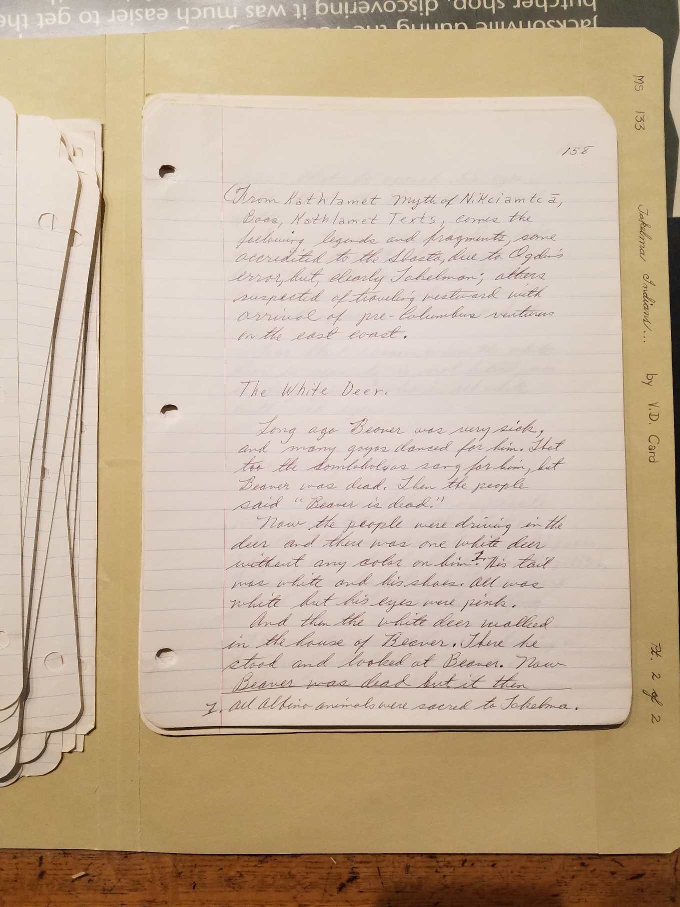 "Beaver is dead."Now the people were driving in the deer and there was one white deer without any color on him. [All abino animals were sacred to the Takelma.] His tail was white and his shoes. All was white but his eyes were pink. And then the white deer walked in the house of Beaver. There he stood and looked at Beaver. Now Beaver was dead but it then [Page 159] was that he opened his eyes. After that the deer walked out of the house. Then Beaver cried "Don't kill the white deer. He has come down from Mt. Alwilamchadis [this mountain was McLoughlin, bearing a "true name and a "spiritual" name.] He has come to heal me. He is a spirit-power. Do not kill him." For that reason when the white deer is seen he is not killed, nor is any person who is all white with red eyes. ["Person" meaning animal.]
