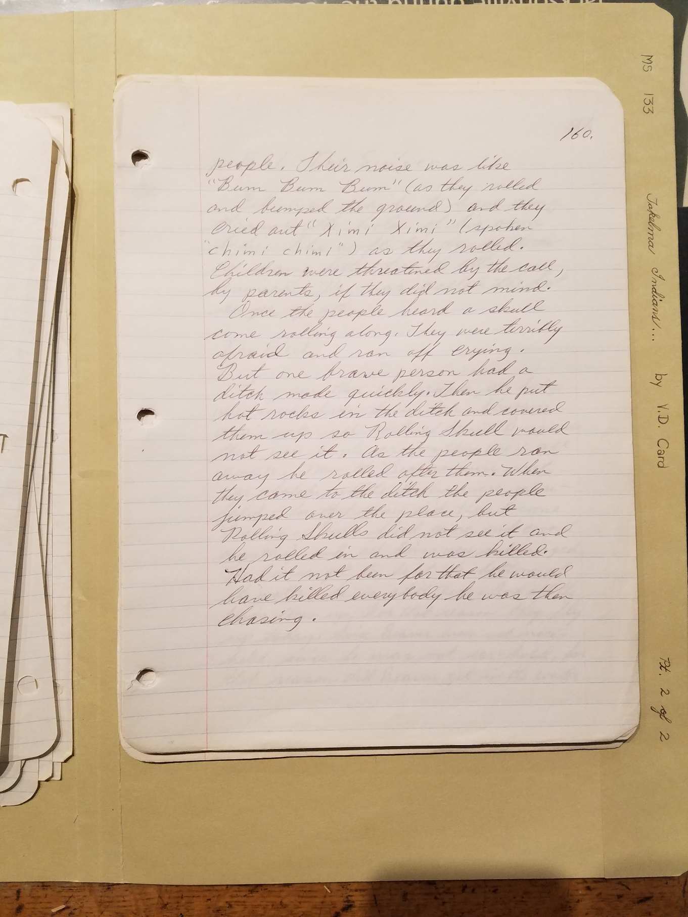 killing[Page 160] people. Their noise was like "Bum Bum Bum" (as they rolled and bumped the ground) and they cried out "Ximi Ximi" (spoken "chimi chimi") as they rolled. Children were threatened by the call, by parents, if they did not mind. Once the people heard a skull come rolling along. They were terribly afraid and ran off crying. But one brave person had a ditch made quickly. Then he put hot rocks in the ditch and covered them up so Rolling Skull would not see it. As the people ran away he rolled after them. When they came to the ditch the people jumped over the place, but Rolling Skulls did not see it and he rolled in and was killed. Had it not been for that he would have killed everybody he was then chasing. [Page 161]