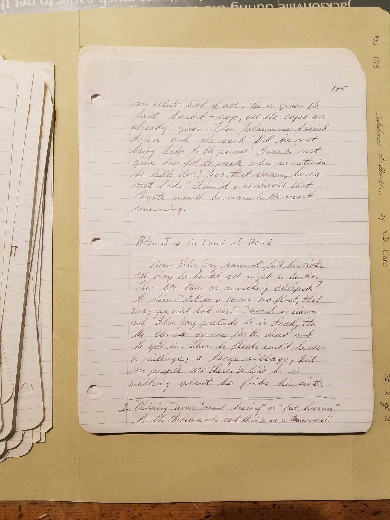 about he finds his sister.[Page 166] Where did you come from she said. I came for you. I am not dead. Are you dead? Blue Jay said. No, I am not dead. The ghosts have stolen me to cook for them, now I don't know how to get away from here. Now Blue Jay looks about. Inside the houses he sees only bones. No People. Then when night comes, all the bones came up and were people. Now Blue Jay went fishing with the ghost people but all they catch is leaves and sticks which are their fish. A canoe comes along with men in it and Blue Jay calls to them, but it is dark and they do not hear him. In the boat, all the ghost people have turned to bones. After a while they came back and said to him "Don't be so noisy. When you are noisy it makes us fall down." Now Blue Jay's sister cooks fish for the ghost people but it is only leaves and sticks. They are in their house now because it is day and they are just bones when it is day. Blue Jay stirs up the bones, he puts a [Page 167] baby head on an old man and a man's head on a baby and such as that. Then he went out of the houses. Now it is day and the bones come together and they look and see themselves with heads and arms not their own. They are very angry. Blue Jay laughs when he sees them and the noise makes them fall down and be bones. Don't make loud sound they say to Blue Jay. "Put us back, give us our proper parts" they say. Then it is agreed that if the people will let Blue Jay and his sister return to their village, he will do it. This he does when night comes. All the heads he puts back, and all the arms and legs he puts back, then he and his sister get in the canoe provided for them and they paddle back up the river to their village. Thus it is that the Takelma whistles when going about at night. That way, if there are ghost people about to steal them, they will fall down and be bones for a while until he has passed. [Page 168] Coyote Learn Lesson