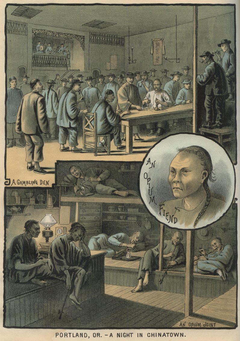 In 1886, the Oregon magazine The West Shore mounted an expedition into Portland's Chinatown and published the article below, a rare in-depth report of 19th-century urban Chinese life in the Pacific Northwest. Click on the pictures for a larger view. ![]() A NIGHT IN CHINATOWN. The great mass of Chinese in America are of the laboring class, unmarried and irresponsible. Bound to no locality by family or property ties, they go from place to place wherever employment can be secured. They huddle together in the "Chinatown" of our various cities, from which they go out singly in search of work, or are sent out in gangs to fill contracts for labor taken by some "boss Chinaman," returning promptly to the city rendezvous whenever out of work. Only those of the better class, the merchants, bosses, etc., can afford the luxury of a wife and family. A wife represents an investment of from one hundred to five hundred dollars purchase money, and a steady outlay for current expenses. Consequently they are above the means of the ordinary coolie, and are a scarce article in America. The great majority of Chinese women brought to this country are of the disreputable class. They are not very numerous in comparison with the men, yet they amount to several thousands in the aggregate; and since they remain in the cities and are there seen in great numbers, they give the impression of being in greater force to the men than is actually the case. Every effort is made by our customs officials to exclude them under the terms of the restriction act, and of late years their numbers have not increased as rapidly as formerly. There is one class of Chinese who acquire and maintain property interests here--the merchants. They are of a higher order than the mass of their countrymen who reach our shores, and the two are as distinct socially as the same classes are among our own people. Their property consists chiefly of merchandise, and it is seldom they acquire real estate. Some of them, however, have erected buildings upon land held under a lease, while a few have even gone to the extent of purchasing the land itself. Some of these are rich, even in the American acceptation of that word, while all of them are well-to-do according to the Chinese standard. They are shrewd business men, and possess as fine a sense of commercial honor as do the white merchants occupying more imposing quarters on the adjoining street. Their dealings are principally with their own countrymen, though our wholesale and commission merchants have quite extensive transactions with them, and find them desirable customers. They have a commercial system of their own, and it is seldom our courts are troubled with their business affairs. The majority of respectable women are wives of these merchants, and generally live in apartments in the rear of, or above, their husbands' stores. They are seen but little on the street, are modest and retiring in their demeanor, and are usually dressed in the most expensive silk and velvet. They toil no more than the lilies that put the glory of Solomon to shame, but are considered by their husbands more as toys and ornaments than as companions and helpmeets. Their domestic duties are practically nothing, since all cooking is done by men, and they have but the care of their children to occupy their time, when, indeed, these little almond-eyed olive branches begin to spring up around them. In every city of any size on the Pacific coast there exists a miniature China, with the exception only of the pagodas and other forms of native architecture. The quarters they occupy are generally in the heart of the city, comprising brick structures formerly used by our own merchants, or others which have since been erected by themselves, of the severest plainness in their exteriors. With this exception there is little in the appearance of Chinatown to convince the stranger that he is not actually traversing the streets of Hong Kong or Peking. The interiors of the old buildings have been remodeled to meet the Chinese idea of utility. Half stories have been put in, and the whole cut up into innumerable small apartments and passageways. Everywhere there is the utmost economy of space and prodigality of smell. In their new buildings little windows reach these half stories and let in the faint rays of light and the small breath of fresh air which seems to be all that Mongolian lungs require. Half a dozen of them will remain for hours in an inside apartment so contracted that they can hardly move about, with no ventilation save what creeps in through a small door from a dark and narrow passageway, and where the atmosphere is so foul and the conglomerated odors so rank that a white man finds it unendurable. The ordinary observer beholds Chinatown only in its exterior aspects. He sees the walls plastered with red paper covered with the complicated marks which convey intelligence to the Mongolian, interspersed with the gaudy bills of some circus or dramatic troupe; he sees the stores, with their English and Chinese signs staring at each other with the appearance of hopeless estrangement; the roast pig, hanging tail upwards; the butcher clumsily cutting up pork, which seems to form almost their entire meat diet; the barber shaving the heads and braiding the queues of his customers, his paraphernalia consisting of a common chair, a bowl, a towel and a razor; the cobbler and tinker at work on the sidewalk for the purpose of saving rent; the vendors of vegetables, confections, cigars, etc., at their little stands on either side of the walk; the fish dealer, with his basket and scales, at the curbstone; the rag picker, with his gunny sack and stick, and scores shambling along at a dogtrot under the weight of loaded baskets suspended from the ends of bamboo poles. He may even enter the store and see their varied stocks of Oriental goods, where he may find in progress a game of dominoes or see a party sipping tea and cramming their mouths full of r