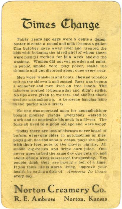 Men wore whiskers, square hats, ascot ties, red flannel underwear, big watches and chains--chopped wood for stoves--bathed sometimes once a week--drank ten-cent whisky and five-cent beer--rode bicycles, buggies or sleighs--went in for politics and worked 12 hours a day--and lived to a ripe old age. Stores burned coal-oil lamps--carried everything from a needle to a plow--trusted everybody--never took inventory--placed order for goods a year in advance--always had money. 1936
