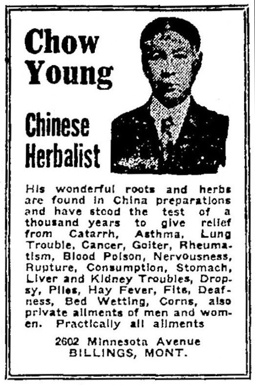 YOUNG CHOW, Chinese Doctor, 241 S Front, res same, Tel Main 42 1912 Medford city directory Chow Young later spent 1918 through 1926 in Billings and Helena, Montana. GIM CHUNG