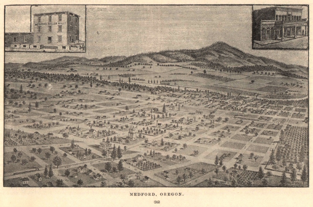 will set in, in earnest.The several proprietors of the town, Messrs. Beekman, Phipps, Mingus and Broback, have divided their lots, each taking an agreed number, to which he has secured full individual title. Thus far lots to the value of about $8000 have been sold. The following list comprises most of the purchasers, although there are a few whose names are not down. Some of them have bought two or more lots each: W. B. Roberts, P. B. O'Neil, S. B. Hadley, Rachel E. Stanley, B. Rostelle, Byers & Jacobs, D. H. Miller, H. C. Mulvany, T. E. Stanley, F. B. Voorhies, Augustus Johnson, Nettie L. Howard, Vrooman & Miller, R. T. McCullough, Wm. Egan, P. McMahon, J. W. Cunningham, James Hamlin, A. L. Johnson, S. L. Dolson, G. Naylor, F. Heber, Wm. Robinson, ---- Robinson, J. C. Slagle, A. A. Raine, Isaac Woolf, Thos. McAndrews, John Wolters, Wm. Angle, J. S. Howard, H. F. Torrey, Mr. Hurt. The lots range from $100 to $500, those in what is considered the business part of town, 25x100 feet are held at $300, and a higher price is asked for the corners. Vrooman & Miller have their store building about finished. It is a fine room, 24x40 with a neat front, which they had made in Portland. One side will be occupied by Dr. Vrooman's Drug Store, and the other by Mr. Miller with a large stock of hardware, stoves and tinware. Mr. Miller will also have a tin shop completely fitted, and has engaged a first-class tinsmith. They will receive 10,000 lbs. of freight from Grants Pass this week, and will be ready for business within a few days. Byers & Jacobs will build a brick block 50x60 and another brick store 20x40. Large piles of brick are already on the ground, having been hauled from Jacksonville. The buildings will be made but one story high at first. Thos. McAndrews promises to burn a large kiln of brick and also put up one or more brick buildings during the coming season. T. E. Stanley and Betterton & Work have the two saloons, have been occupied for some time, as have also the blacksmith shops of Emil Peil and another of whose proprietor [George Crystal] we cannot give the name at this writing. J. S. Howard has the appointment of Notary Public, and is ready to attend to any business pertaining to that office, and also to conveyancing in all its branches. He has done all this work in the transfer of town property thus far. J. S. Howard has his store completed, and a portion of his stock of groceries already in it, with new goods on the way. He will be the postmaster, and it is expected the office will be opened very soon. Egan & McMahon have a fine, roomy livery stable building and barn, and are well prepared for business, having good horses, new buggies and hacks, and a good supply of hay and grain. Mulvany & Slagle are carrying on business at the Railroad Blacksmith shop, and if you want good work done a low prices give them a call. You will find John Slagle at the forge. J. W. Cunningham, of Jacksonville, is building a good sized hotel, and wants to have it ready for a dancing party on Washington's birthday. H. F. Torrey, of Willow Springs, is also building a good sized hotel, and wants to have it ready for a dancing party on Washington's birthday. A. L. Johnson, the real estate agent, has lumber on his lot for an office and will move over from Jacksonville as soon as the building is ready. Wm. Angle has a good sized dwelling house about completed for himself. H. C. Mulvany also has a dwelling house built and in use. S. B. Hadley has a good assortment of merchandise in a temporary store building, and will put up a good, permanent building, 25x40. F. B. Voorhies has his restaurant building completed, and is prepared to furnish the public with good meals at all hours of the day. A. S. Johnson has just finished a building for a meat market, and will begin the butchering business within a few days. Some six or seven wells have been dug in the town, all furnishing good drinking water at a moderate depth. George Howard is clerking in his father's store and F. W. Broback is clerking for Mr. Hadley. Roberts & O'Neil will build on their lots as soon as lumber can be had. Robinson Bros. have their barber shop about ready to move into. F. Heber will put up a wagon or cabinet shop on his lot soon. Ashland Tidings, January 25, 1884, page 4 MEDFORD.--In company with several others we paid a visit to the new town of Medford this week and found considerable activity there in the building line. The lumber for the depot buildings has commenced arriving from the north, and the work of putting it up will be commenced at once. A water tank to be run with windmill power will also be placed here. Among the business men who have got started in business we noticed the following: J. S. Howard, with a stock of general merchandise, and Sam Hadley in the same line of business. McMahon & Egan keep a livery stable there well supplied with livery outfits to go to any part of the country. Two saloons have also opened out there, one kept by Werk & Batterton and the other by T. E. Stanley, both appearing to do a good business. The new building for Vrooman & Miller's drug and hardware store is about finished, and a portion of their stock has already arrived so that they will be ready to commence business in a few days. Besides this there are two blacksmith shops, owned by Slagle & Mulvaney and Geo. W. Crystal, a boarding house by Wm. Angle and a butcher shop and barber shop owned by parties whose names we did not learn. Several other buildings are in course of construction, one being a substantial hotel building owned by Mr. Cunningham of this place. Oregon Sentinel, Jacksonville, January 26, 1884, page 3 MEDFORD ITEMS.-- Things are lively at Medford. The new buildings going up and the trains arriving and departing give an air of briskness and "business" to the place which is something novel for the people of this valley to witness. There are now thirty-six buildings in the town, all new, of course--a pretty good record for three months