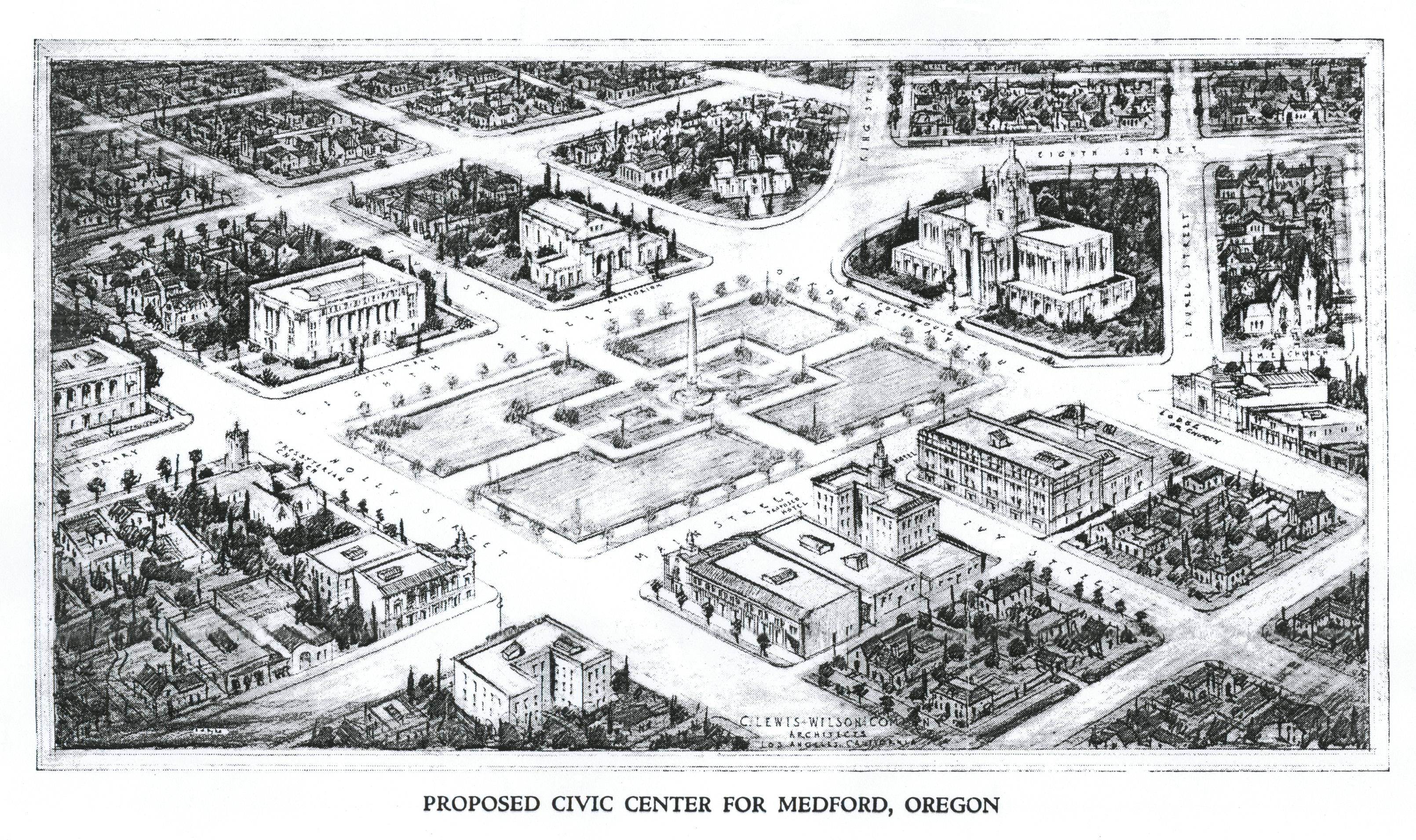 valley.Although the Medford district produced in 1929 one of the largest crops of pears in its history and received the highest prices paid for several years, the crop for 1930 promises to exceed that of last year by 10 to 15 percent, and while the prices will probably not be as large as last year's, owing to other sections of the country having larger crops, it is predicted by those in a position to know that the financial return will equal if not exceed that of 1929. Three thousand six hundred and sixty-six cars of pears shipped from Medford in 1929 brought more than $6,000,000, and this year's crop is estimated at over 4,000 cars, The estimate for apples and other fruits to be shipped this year is 750 to 800 cars. Some idea of the importance of the fruit industry to the Rogue River Valley can be gained from the fact that during the peak season of pear shipping over 5,000 people are employed in connection with the industry, and the payroll is over $200,000 a month. There are 21 fruit packing and exporting firms in Medford, 43 fruit storage houses and five modern cold storage plants with a capacity of 800 cars. There are two large ice plants, one with the largest ice storage in Oregon, used for icing the refrigerator cars in which the fruit is shipped. Two canneries are located in the county, packing 100,000 cases of fruit and vegetables yearly. There is also a catsup factory in Medford. In the center of a picturesque landscape, with the Cascade and Siskiyou and Coast Range mountains in the distance and abounding in all the beauties and advantages of prodigal nature, Medford town is one of Oregon's prize cities. ![]() The artist's conception of Medford's civic center in 25 or 30 years as provided in the plan. The Medford city plan, as worked out by Mr. Crane in conjunction with the Planning Commission and engineers, was exhibited at the National Conference on City Planning held at Denver June 23-26, and attracted favorable comment. Voters of Jackson County have determined upon the location of the courthouse as shown in the sketch. Several of the buildings shown in the eventual grouping, particularly the courthouse, city hall and library, are in prospect within the next few years. Realization of the completed plan is expected to be a matter of twenty-five or thirty years. An Alert Northwest City Plans for its Development BY JACOB L. CRANE, JR. City Planner, Chicago, Consultant to the Planning Commission, Medford, Oregon