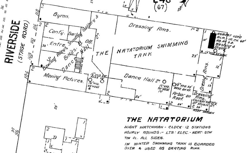 house.Pays $10,000 To Enlarge Ground and Provide General Entrance to Park on South Side. Work is rapidly progressing on the new Natatorium, and it is believed that by July 1 it will be ready to throw open to the public. A huge heating plant and two cars of lumber arrived Tuesday for the company. Medford Mail Tribune, May 25, 1910, page 8 ![]() Sanborn Fire Insurance map, 1911 SMALL BOYS ENJOY NEW NATATORIUM