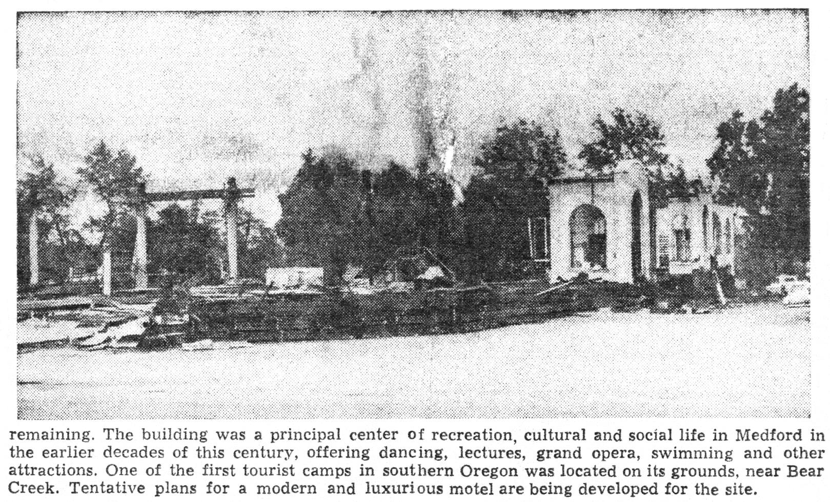 By June 23rd, 1910, a $200,000 edifice had been created--the largest and finest building of its kind in Southern Oregon--Merrick's ballroom. [The building was originally known as the Natatorium; Fred E. Merrick's name would not be attached until the early 1920s.] Early this week, two workmen started to tear down this building, a job that may take until May 15. In the forty-five years, the building had changed from the social center of the county to a little-used structure, a building that like an old man lived in its past glory; lived with its memories of the great events, of the famous people who had come and gone. As John G. Crawford, one of the building owners, put it: "Merrick's ballroom has reached the end of its economic life." One of the principal features of the new structure when it opened in 1910 was its huge swimming pool. It was 50 by 100 feet and held 50,000 gallons of water. In the winter the pool was boarded over and used for a roller rink. Emerson Merrick, son of one of the original owners of the building, once rented bathing suits, bloomers and stockings to the ladies who came there to swim. He recalls that stockings rented for ten cents a pair and that no woman would think of entering the pool without her stockings. The history of the evolution of the bathing suit in Merrick's is a part of the nation's history as far as women's fashions in bathing suits go. Merrick remembers when the first woman entered the pool without stockings--bare-legged. Other ladies whispered, and Medford gossiped about her. And then there were the girls who had trouble swimming in the skirted suits, with big bloomers and stockings. They were weighted down in an outfit that the modern girl wouldn't be caught drowned in. Some of those brave lassies, Merrick remembers, used to surreptitiously unbutton the skirts after they were in the pool. Of course, it left them heavily clad in big bloomers, but they giggled about their daring. Then one day came the advent of the one-piece bathing suit, and a brave young lady donned one and appeared in Merrick's pool. Tongues clacked far into the night, but a new era in women's wear had come, and Merrick's had made a little more local history. The late F. E. Merrick, H. C. Kentner, W. H. Brown and Jess Enyart pooled their funds to buy three acres of ground and start the building. Emerson Merrick said the investment was $225,000 which, for that day and age, was a major investment. In 1911, a depression hit the area and the building owners one by one dropped their active interest. Some left the valley, and it became pretty much a Merrick enterprise. There were all types of social events held in the big ballroom--92 by 108 feet-- and the little ballroom--35 by 65 feet. There were dances to such famous orchestras as Paul Whiteman, Jan Garber, Jack Teagarden and Phil Harris. Famous singers warbled there--Madame Ernestine Schumann-Heink, Luisa Tetrazzini, Nellie Melba--all were the toast of Medford and of Jackson County society generally. Peopled traveled for miles to the ballroom to hear the silver-tongued orator, William Jennings Bryan, who spoke there. The New York Symphony played there, and on the other extreme, Battling Nelson trained on the grounds and swam in the pool. In addition to the social, cultural and athletic events that drew people from all parts of Southern Oregon and California, the building once housed an ice cream parlor, bowling alleys, shooting galleries, movies and an athletic club. Lyceum shows were also held there. Although the heyday of the activity was gone, the building was still a popular place in 1928, and the late F. E. Merrick and his son, Emerson, sold one hundred acres of orchards in the Roxy Ann area to pay off the indebtedness of the structure. In 1930, former owners of the building settled out of court with the Merricks, and it became their sole operation. During the World War II years, the structure was leased to the army for its pool and other recreational activities. When the army gave it up, it was closed permanently and in recent years has been gathering dust. In 1952, Crawford, Col. Thomas A. Culbertson, Jr., and Otto Frohnmayer purchased the property under the name of the Riverside Investment Company. Crawford, president of the firm, in announcing of the dismantling of the building by Clifford E. Schleigh and G. R. Ford, said that definite plans for the future of the site have not been made. There are several things in the fire, and among these, according to reports, are (1) a motel and (2) a shopping center. Rogue River Times, December 16, 1955, page 10 The site is now occupied by the Red Lion. - - - - - - - - - - - - - - - -