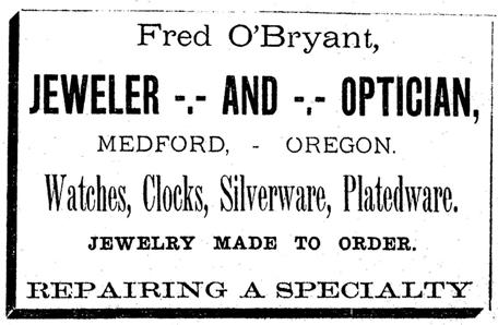 Don't fail to try your luck at Jake Wolff's cane rack. E. Cutter & Co. open their new art gallery this week. O'Bryant, the jeweler, "takes the cake," and no mistake. The Mail is getting ready to issue a holiday edition next week. W. L. Webster is employed at the Times office in Jacksonville for the present. Trains passing from the south carried considerable snow for several days last week. "Shorty" Hamilton returned on Wednesday of last week from a run through northern Oregon. Don't fail to see those handsome things on display in Orra Angle's show window. He always leads. It is rumored that a change will take place in the management of the Grand Central Hotel here soon. "Ain't it grand!" is the exclamation of all who see O'Bryant's assortment of watches, jewelry, etc. S. L. Bennett, the milkman, continues to make his regular rounds and furnishes an excellent article of milk. If you want a genuine article in the jewelry line O'Bryant can furnish it as cheaply as any other dealer south of Portland. There will be a large assemblage of school teachers here next Thursday, the institute commencing on the day after Christmas. The new street lamps at Adkins & Webb's corner and in front of the express office aid materially in lighting the town these dark nights. Fred. O'Bryant has the nicest stock of jewelry, watches, etc., in the county. If you want something real nice in his line, call on him. Gents will find something really handsome in their line at Orra Angel's. He has a fine, complete stock of goods and sells quite reasonably. It is predicted that brick buildings will replace the wooden structures in the burnt district next spring, which will make our town more solid than ever. It is rumored that the State Insurance Co. intends to contest its liability to pay the policy it wrote on W. G. Cooper's property that was destroyed recently by fire. Don't forget the fact that C. C. Smith (1888) has many nice things for the holidays. He has a complete and first-class stock of goods and never fails to please. Three years ago Dr. Adkins bought his house, which was burned, and lot on which it stood for $400. He was offered $600 for the naked lot last week, which he refused. Jake Wolff has rented a building in this place and is furnishing much fun for the boys with his cane rack. He has a nice stock of holiday goods, which he gives away as prizes every evening. The municipal election is drawing near. It is not probable that a political ticket will be made. Mayor Purdin and the present council have done so well that it is likely they will all be handsomely reelected, with perhaps one or two exceptions. The ladies of the M.E. Church met with splendid success at the fair held at Howard's hall last week, realizing the sum of $54 from their enterprise. Everybody enjoyed the treat, and there is a very general desire for the ladies to repeat the entertainment at an early day. W. G. Cooper last week made application to the town council for leave to erect a temporary wooden building on the site of his burned business house, until such time as he can build a brick structure. Mr. Cooper is a live, energetic citizen, who cannot be kept down by adversity. The people of Medford and vicinity, who want to see and select from the largest and finest stock of holiday goods ever brought to southern Oregon, should call at the S.F. Variety Store in Jacksonville and feast their eyes on the elegant articles displayed there. No trouble to show goods. The following programme has been arranged by the Medford Gun Club for their shooting on Christmas Day: No. 1--Miss-and-out purse; No. 2--Turkey shoot, three birds; No. 3--Six-birds purse; No. 4--Three birds, turkey shoot; No. 5--Ten-birds purse; No. 6--Three birds, turkey shoot; No. 7--Three-singles and two-pair purse; No. 8--Three birds, turkey shoot; No. 9--Ten-singles purse. There will also be rifle shooting for a beef, which promises to be most interesting. The Wheeler and Wilson, No. 9,