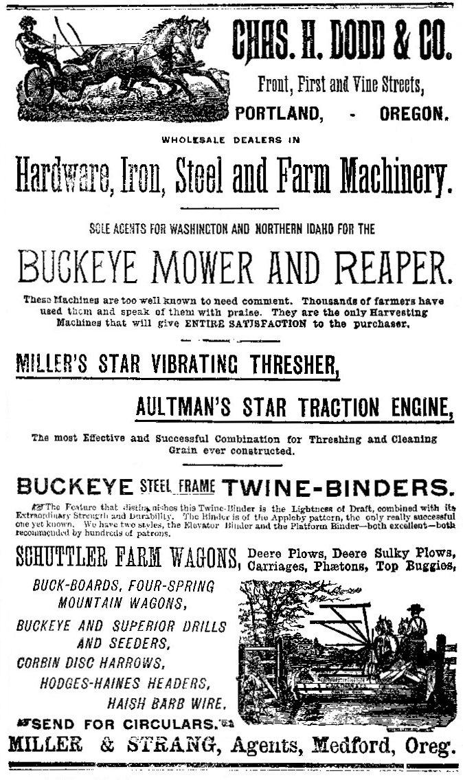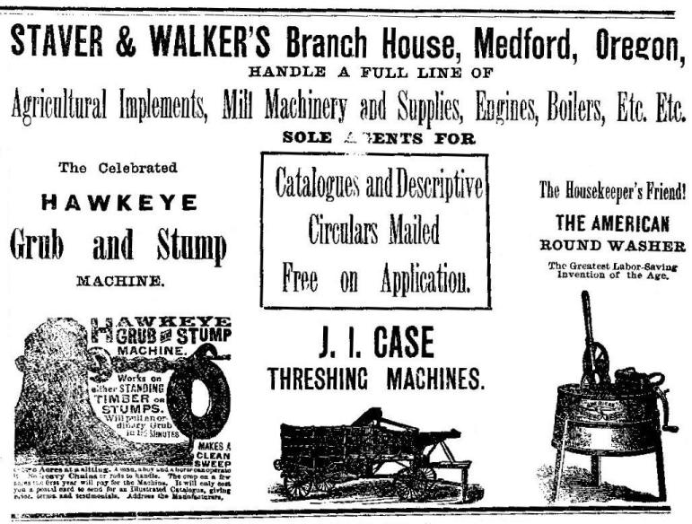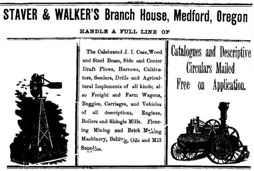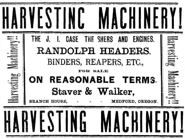 Medford, Or., Nov. 16, 1889 STAVER & WALKER, Medford, Or.: Gentlemen:--Having used one of your Evans' steel tubular lever harrows, I have no hesitation in saying that I believe it to be the best harrow on the market. JESSE