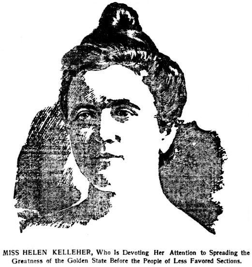 Miss Helen Kelleher, the distinguished young elocutionist, has just completed a tour of the Northwest, during which she delivered her delightful lecture on "Picturesque California" to no less than 23,000 people. Miss Kelleher began her tour on October 1 and lectured to forty-four audiences in forty of the principal cities and towns, returning to her home in this city the 4th inst. Her tour was under the direction of fifty prominent citizens of all parts of California, who have the welfare of the state at heart and adopted this novel plan of placing its advantages before our northern neighbors.