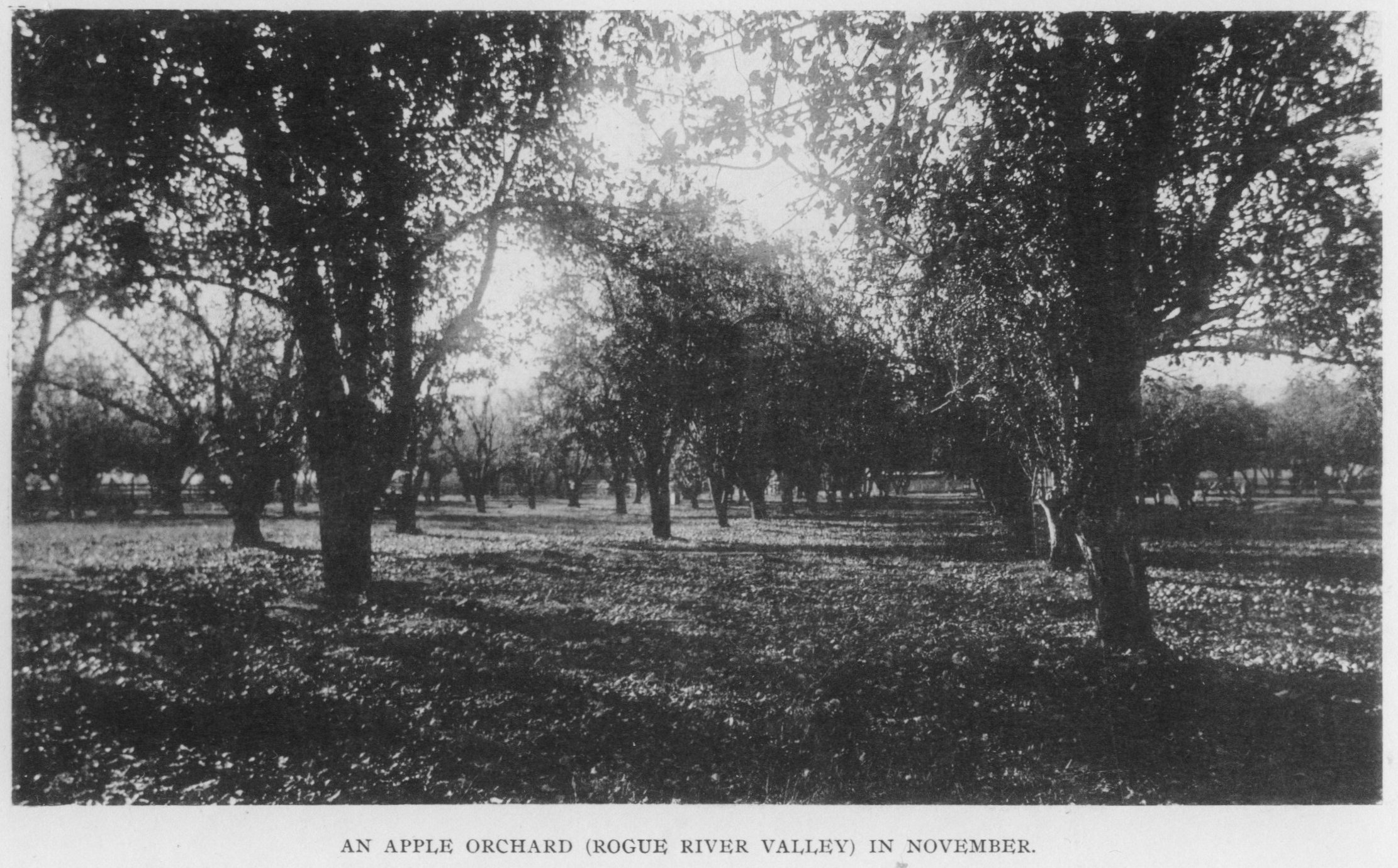 " 'Mid Nature's tangled drapery" shows a scene close to the Orchard Home. It evidences how marvelously fertile is this land, even when untouched by the plow. To those who delight in the wonders and beauties with which Nature has endowed this border line of the Occident, the foothills and mountains and trackless forest, which enclose this jewel of a valley as a setting, are a storehouse of grand and magic scenes and wonders. The lofty firs and pines, with their fantastic garb of yellow Spanish moss; the thicket fastnesses of the red manzanita and the yellow madrone; the deep ravines, into whose shadows the sunlight never peers; the mighty peaks, crowned with volcanic basins and mantled with garbs of perpetual white,--all shrouded in a lasting silence, broken only by an occasional woodman's axe, the snapping of twigs, the music of the wind in the topmost branches of the pines, the rushing of waters on their way to the sea, and sentient with Indian legends of the occult world,--all repulse the timorous, and convince the boldest that they are in Wonderland. Here is Crater Lake, the deepest body of fresh water in the world. The lead has gone down in its icy, clear depths three thousand feet; and yet its mysteries are unfathomed. Here breaks from a mountain side, from some subterranean lake, a vast volume of rushing water, the source of a mighty river. Here, on the crest, is the spot called Cinnabar, a great, undeveloped mine of quicksilver. No night falls and finds an Indian there; for they aver that there a devil abides, who punishes those who remain by leaving them toothless and bald. Springs of sparkling soda water, and others with strange taste of minerals, some hot and some the temperature almost of ice, break out with a rush from the mountain sides. And as the observer wonders, he yet gazes with entranced eye upon the picture. In autumn, the artist fingers of King Frost have touched the mountain sides with the paints of Nature; and long lines of maples and alders and quaking asp and box-elders are clothed in scarlet and yellow and russet and the tints of the opal; and, as we climb to the serrated crest of the mountains, we look upon the grandest picture of all,--the valley of the Rogue River, dotted with homes. ![]() As satiate with the boundless play Of sunshine in its green array." You can not afford to neglect this opportunity. Around and about this land is growing a necklace of young cities. Ashland, Medford, Jacksonville, Central Point and Gold Hill, all within the county, each almost within cannon-shot of the Orchard Home. Here, midway between San Francisco and Portland, is being built a "booming" young city. Mechanics and laborers, skilled and unskilled, the wage-earners and the homeseekers, may here build their homes, and find labor for their willing hands, and a peaceful prosperity for their families. ![]() - - - - -