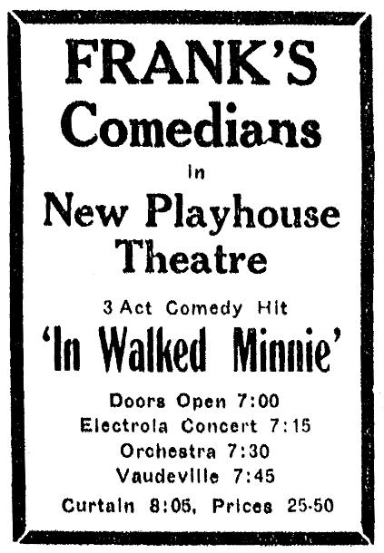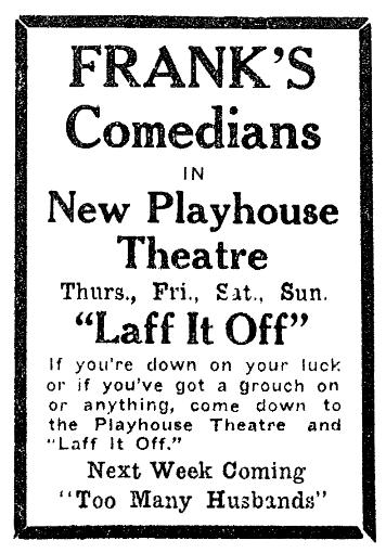 The Playhouse Theater will be open every Thursday, Friday, Saturday and Sunday. The company plays the road the balance of the week. Medford Mail Tribune, October 18, 1928, page 10 FRANK COMEDIANS TO PRESENT HITS