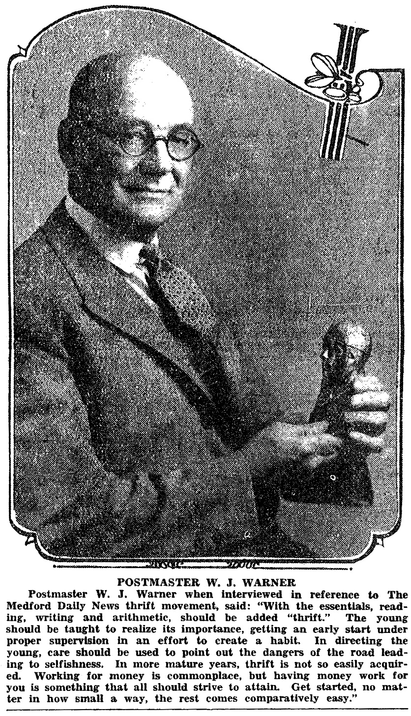 George F. Merriman of Medford has been appointed postmaster at that place by the President. "Brevities," Ashland Tidings, January 15, 1900, page 3 George F. Merriman appointed January 17, 1900 G. F. Merriman has received his commission as postmaster of Medford and yesterday, March 1st, he took upon himself the duties incident to the position. The Mail don't see a thing in the way of George making a first-class postmaster, and we are of the opinion he will give us good service. There are two essentials quite necessary in successfully conducting a post office. One of them is the accommodation of the public to the greatest extent possible and not infringe upon the rules and regulations as laid down by the department. The other, and principal one, is to always have your office books posted to date and cash in the safe in sufficient amount to check even with the cash book. The public ofttimes expect more of a postmaster than the rules and regulations of the department will permit him to grant. When a postmaster tells you that he cannot comply with some request you have made or favor you have asked, don't get angry and cuss him. It will do no good. He knows the rules and regulations and you don't, and all the blasphemy you can heap upon him will not lessen his chances for serving out his full term as postmaster. There is little chance for controversy between postmasters and the office patrons, and a postmaster who is discreet will not engage himself in argument. On the other hand, patrons are entitled to courteous treatment at all times. Even if the same question is asked an hundred times a day by different parties, each is entitled to a civil answer. "City Happenings," Medford Mail, March 2, 1900, page 7 Miss Letha Hardin is acceptably filling a position as clerk in the post office. G. F. Merriman, Medford's new postmaster, assumed the duties of his office on March 1st. George will make an accommodating and efficient official. "Medford Squibs," Democratic Times, Jacksonville, March 5, 1900, page 3 Miss Iva Purdin has taken a position as clerk in the Medford post office, a position she held for several months during her father's incumbency of that office. She is very capable help and Postmaster Merriman is to be congratulated upon having secured her services. Miss Mae Merriman is becoming quite proficient in the office work, and between the three--Postmaster Merriman, Miss Mae and Miss Iva--the office is being well and faithfully looked after. Miss Letha Hardin and Lin Purdin, former employees, have severed their connections with the office. "City Happenings," Medford Mail, April 13, 1900, page 7 Miss Iva Purdin is acting as one of Postmaster Merriman's assistants in the Medford post office. "Medford Squibs," Democratic Times, Jacksonville, April 16, 1900, page 2 R. H. Halley is having a good bit of improvement made about the Medford post office. A new floor has been put down in the lobby, four-foot wainscoting has been put on, the ceilings and walls have been kalsomined, and the front, both inside and out, is being painted--a pure white. The changes which are made and being made add materially to the appearance of the place--in fact, make it one of the neatest and coziest places in the city. "Additional Local Items," Medford Mail, April 20, 1900, page 6 The salaries of the postmasters of Ashland and Medford have been raised $100 a year each. They get $1700 and $1500 per annum respectively now. "Local Notes," Democratic Times, Jacksonville, June 21, 1900, page 3 Medford has been most fortunate in the matter of securing good postmasters. Now there was Judge Purdin--good postmaster at every spot in the road--and following right after him in the office was G. F. Merriman--just as good a man, and one who is filling the requirements squarely to the letter. He is accommodating and courteous to everybody. There are no favorites--all are treated alike, but treated with every consideration possible, and obey the postal laws. The morning mails are distributed and the office is open by seven o'clock--which is a big accommodation to many, particularly working people. The girl clerks in the office, Misses Mae Merriman and Letha Hardin, are obliging always, and attentive to patrons. Up one side and down the other there can be found little ground for registering a complaint against the Medford post office. "City Happenings," Medford Mail, July 13, 1900, page 7 The patrons of the Medford post office are much amused at the importance assumed by one of our local newspapers, which seeks to leave the impression that our worthy postmaster is endeavoring to curtail its influence and usefulness through the authority invested in him by virtue of his position. Mr. Merriman spares no pains to accommodate everybody, but insists on transacting his business in a legal manner, even if it interfere with the ideas or pocket of some prejudiced individual. "Medford Squibs," Democratic Times, Jacksonville, September 10, 1900, page 2 The receipts of the post offices of the three leading towns of the valley have been growing steadily, as will be noticed by the following statistics: Ashland--for the fiscal year ending June 30, 1896, $3859; 1899. $4984; 1900, $5595. Grants Pass, 1896, $4221; 1899, $4959; 1900, $5331. Medford, 1896, $3214; 1899, $3497; 1900, $3907. "Local Notes," Democratic Times, Jacksonville, October 29, 1900, page 3 Postmaster Merriman has fitted up the post office with a gas plant, which furnishes first-class light and plenty of it. "Medford Squibs," Democratic Times, Jacksonville, November 26, 1900, page 3 Postmaster Merriman and his assistants, Misses Mae Merriman and Letha Hardin, had anything but a summer picnic the latter part of last week and the first of this, wrestling with huge mail sacks of Christmas presents. One morning five of those monster sacks came in filled almost to overflowing with boxes and bundles of Christmas good cheer, while the outgoing sacks were equally as numerous and as well filled. 