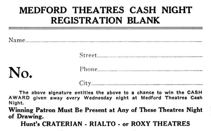 Medford Mail Tribune, December 18, 1933, page 5We, the owners, are WALTER LEVERETTE. GENE CHILDERS. GEO. A. HUNT THEATERS, Inc. The independent theaters are STUDIO. RIALTO. ROXY. CRATERIAN. FILM ADMISSION PRICES BOOSTED