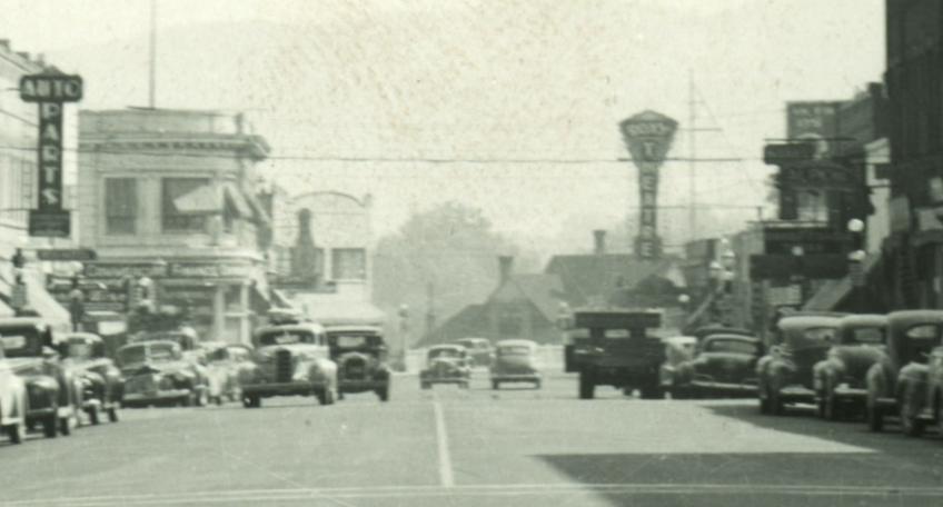I worked for the theater every day, no days off except for one week vacation a year. I can't remember ever taking a day off for being sick. One just didn't do that those days. ![]() Wainscott's, July 1942 ![]() Medford Mail Tribune, August 4, 1935 ![]() The 25-foot neon Roxy sign, at right, July 1942. Looking down East Main toward Bear Creek. If I wanted to go anywhere on a Sunday I had to go very early in the day and be ready for work by 1:00. I remember going to Crater Lake and Dead Indian Springs for a fun outing. I remember one time one of the Swift boys had been out skunk hunting. Evidently he had caught one, and it was on his clothes. He came to the theater, and even though he sat in the back row the smell was terrible, and he had to leave. One time a customer fell over a pair of crutches. This customer sued the theater, saying she was badly injured in her fall. I think she faked it a lot. Babe was ushering at the theater at that time for a short while. All in all, my theater days were happy ones. I'm glad I spent those years there. Today the theater has been torn down, and it is now a vacant lot. Many don't remember the Roxy. See