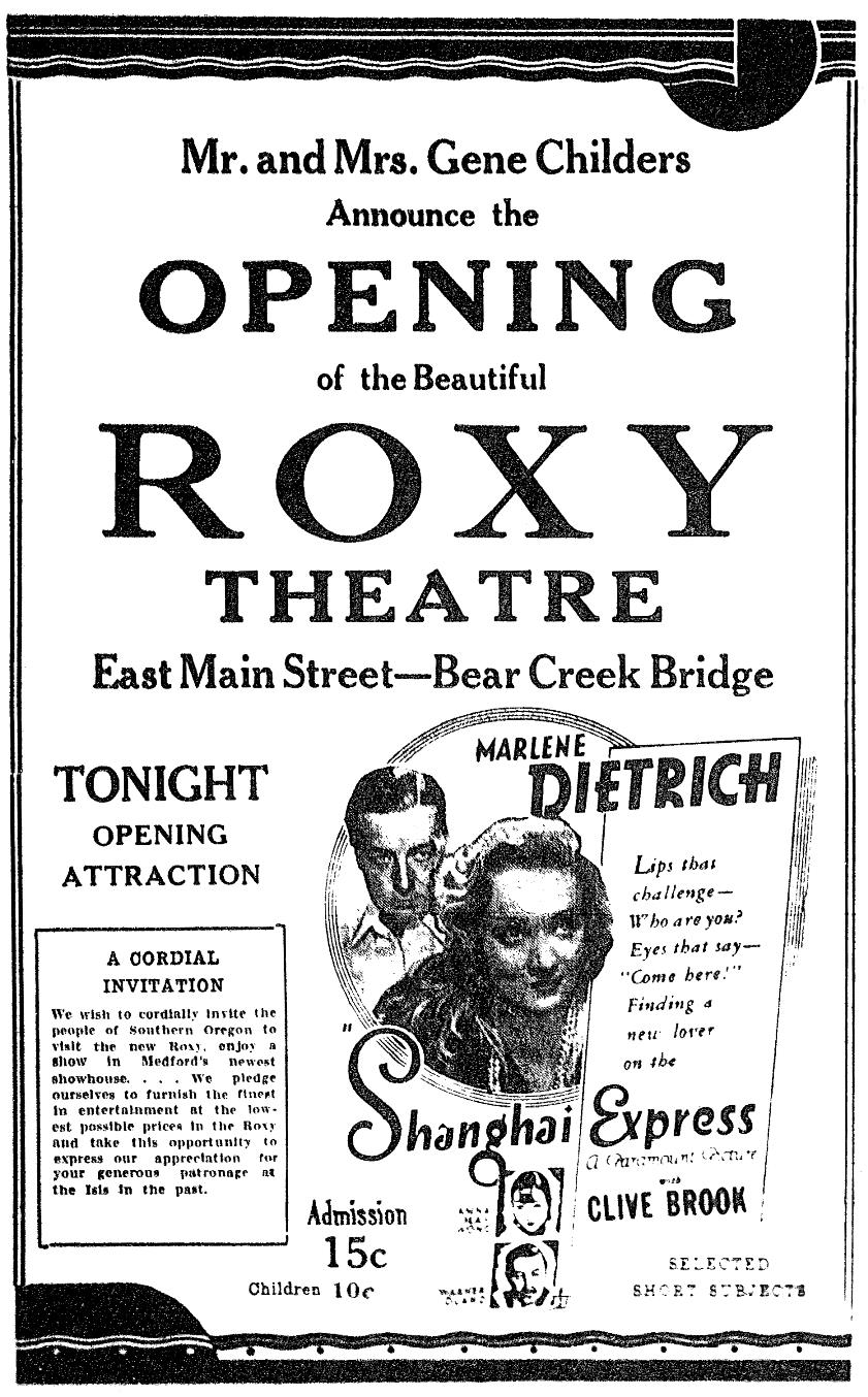 For the first and second showing of "Shanghai Express," feature picture, starring Marlene Dietrich, all seats in the theater were taken and guests turned away because of lack of space. The crowds were received by Mr. and Mrs. Gene Childers, owners and operators of the theater, who were the recipients of hearty congratulations from many sections of the state and an abundance of flowers, which decorated the stage. Among the donors were Jimmy Valentine, Mr. and Mrs. Herb Strang of this city, Julius P. Wolfe of Ashland, Strathouse Neon Sign Company, Ben Shearer Company, Mrs. S. Childers, Mrs. Kate Collins and Mr. and Mrs. Clem Childers of Medford. Comfortable seats, attractive decorations, efficient and pleasing lighting fixtures and splendid screen and sound equipment greeted the guests following entrance through the decorative foyer of the theater. An advantageous view of the screen is offered from each chair in the house, which seats 450. In connection with the showing of "Shanghai Express" the public was entertained with several short features, and a vote of praise was voiced for Mr. and Mrs. Childers on every side in appreciation of the first night's offering. Medford Mail Tribune, June 26, 1932, page 1