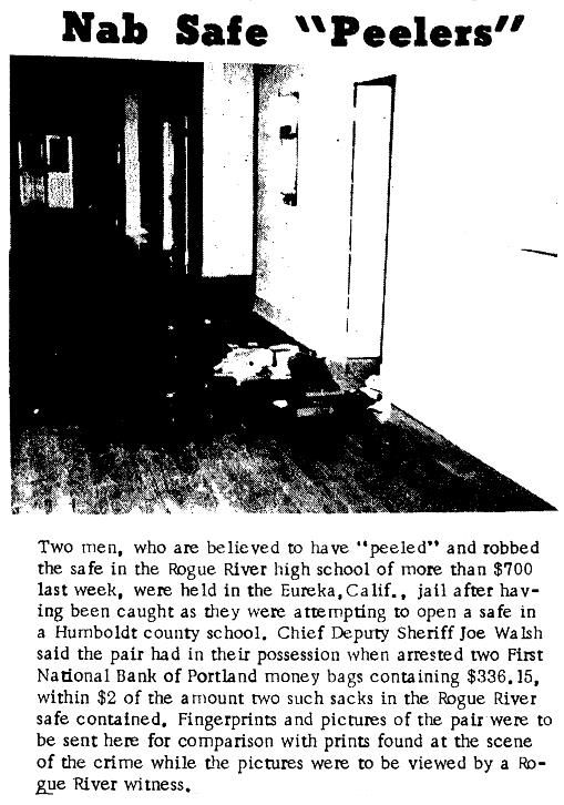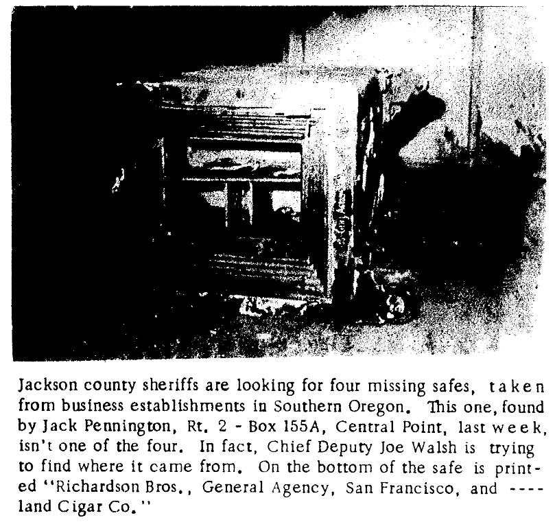 Just below the Smith home, Allen saw something across the safe that looked like a safe. It was, and proved to be the safe stolen from the Greyhound bus depot in Grants Pass April 3. Many important papers were found intact, plus a few pennies missed by the thief. Medford Mai Tribune, April 13, 1956, page 3 ![]() Rogue