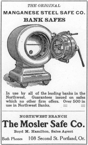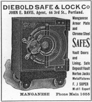 There is some talk that the county will soon invest in a big safe. There are other things much more necessary than this--repairs on the bridges and roads which are in a bad condition, for instance. "Local Notes," Democratic Times, Jacksonville, July 7, 1898, page 3 A large safety vault has been provided for the [Medford] bank's treasure and valuable papers. This has cold air ventilation and is positively fireproof. Inside this is a Diebold safe--a double timer, of the best of steel, and burglar proof. "A New Banking House," Medford Mail, June 23, 1899, page 6 Gold Hill P.O. & Store Burglarized and Safe Blown Open.