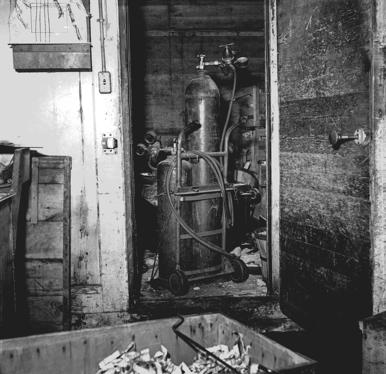 City police, and Bill Gates, Groceteria corporation president, said the theft was made possible by another earlier burglary. The unknown thieves stole a large acetylene cutting torch from the A. Z. Dean Motor Company across the street, and used it to "crack" the Groceteria safe. Use Hand Truck In reconstructing the crime, police and Gates said the thieves apparently took the safe from the store office to a heavily insulated cooling room on a hand truck. The same truck was used to carry the cutting torch equipment from the Dean establishment to the Groceteria. [A close examination of the photos reveals the hand truck is the one normally used to transport the tanks around the garage; the safe was likely rolled to the cooler on its casters.] ![]() The safe's normal location in the store office. Click on the images for a larger view. Not 'Safe Men' The burglars apparently were not "safe men," Gates said, because they attempted to cut the safe's door off at the hinges, and were unable to break through. Then they cut through the outer metal wall of the safe and chiseled through three inches of concrete to the inner wall, cutting that with the torch. The insulated walls of the room kept the noise of the operation from reaching the street, police believe. ![]() The scene of the crime. The safe is visible lying on its side just beyond the tanks, its casters to the right. ![]() The hole in the concrete side of the safe. The cylinder on the left is the handle of a hatchet; a bushel basket is visible on the right. He added that he could "only estimate" the amount taken, and an audit was being made this morning to determine the exact amount of loss. The safe and its contents were covered by insurance, he said. "Tubby" Dean, proprietor of the firm from which the torch was taken, added insult to injury today. He sent Gates a bill for 30 cents to pay for the acetylene gas used by the safecrackers. Medford Mail Tribune, November 6, 1951, page 1 ![]() A. Z. "Tubby" Dean, left, receives his 30-cent check from Bill Gates. The sign on the safe reads "They expected T-bone steaks but found only cheap inflation money." This photo ran in the Groceteria's ad in the Mail Tribune on November 9, 1951. Safe Blown Open But 2 Suspects Nabbed