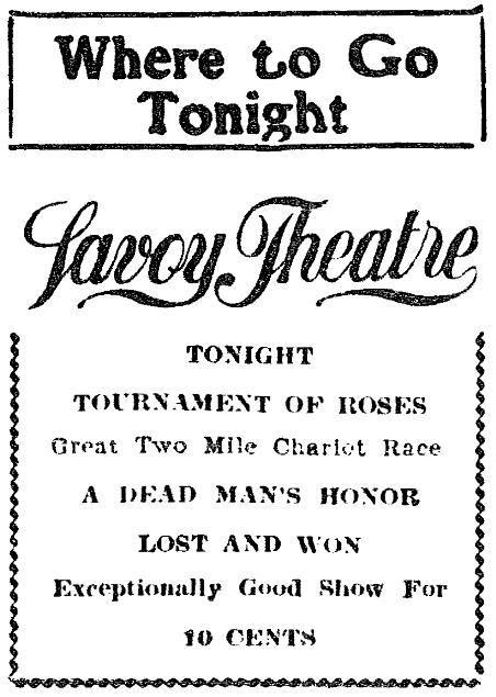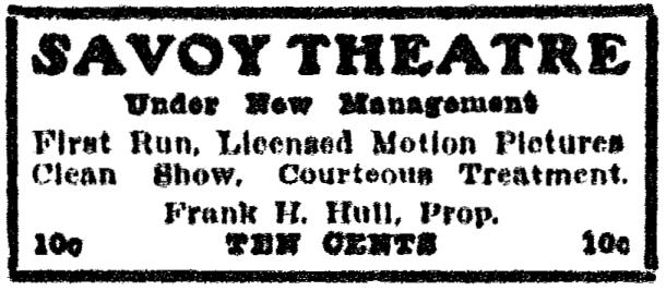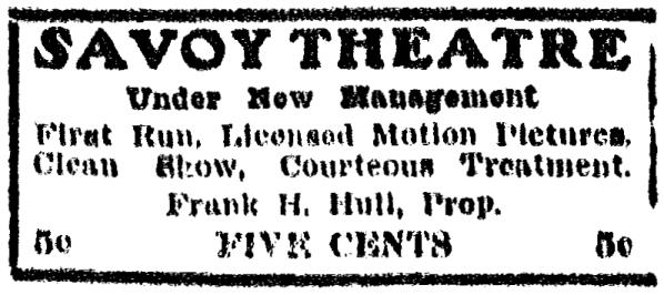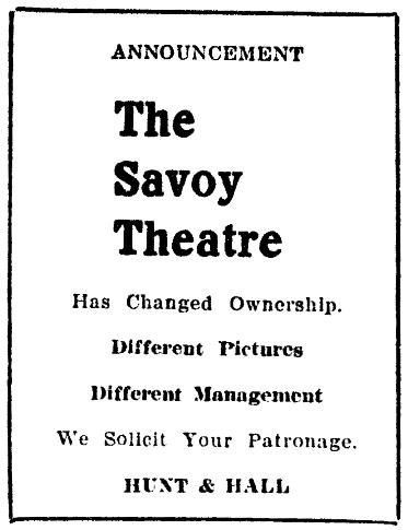 Medford Mail Tribune, October 11, 1911, page 8 The following ads tell the tale of the demise of the Savoy. Note the shifting ownership and declining admission prices: