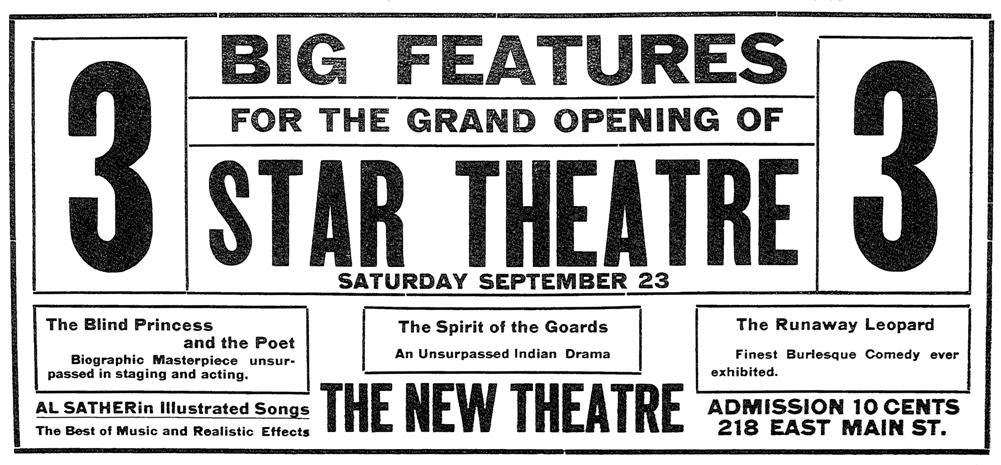 of Portland, took charge of the Star Theatre as manager Friday.Mr. Sather is a thorough moving picture man, opened the Star, was manager for the first two years and was very popular with the people. He has a splendid voice, and his solos were a big feature of the theater. He will be heard again tonight and every night hereafter. K. L. Bernard, who has been manager of the theater for about six months, has raised the standard of their pictures very materially, and being pleasing and accommodating to everyone has made the Star a very popular playhouse. He has two positions offered him in California and will probably leave Medford next week. Mr. Sather says the Star will continue to give the people the best pictures to be had. Medford Sun, June 12, 1915, page 4 Owing to the change of management of the Star Theater, the children's Saturday matinees endorsed by the women's clubs and Parent-Teachers Association will be discontinued for the present, until arrangements can be made with the new management.. "Local and Personal," Medford Mail Tribune, June 19, 1915, page 2 NEW