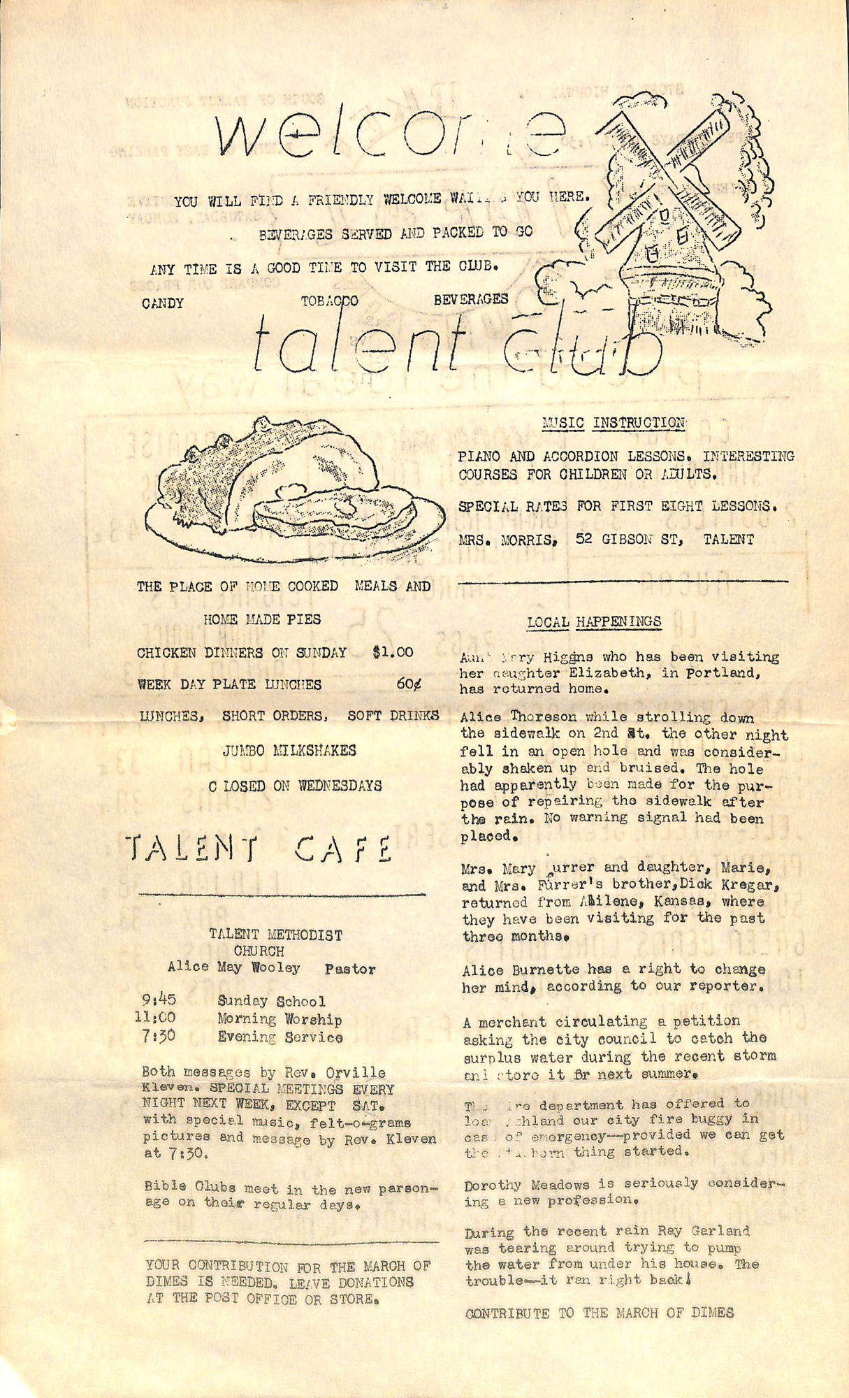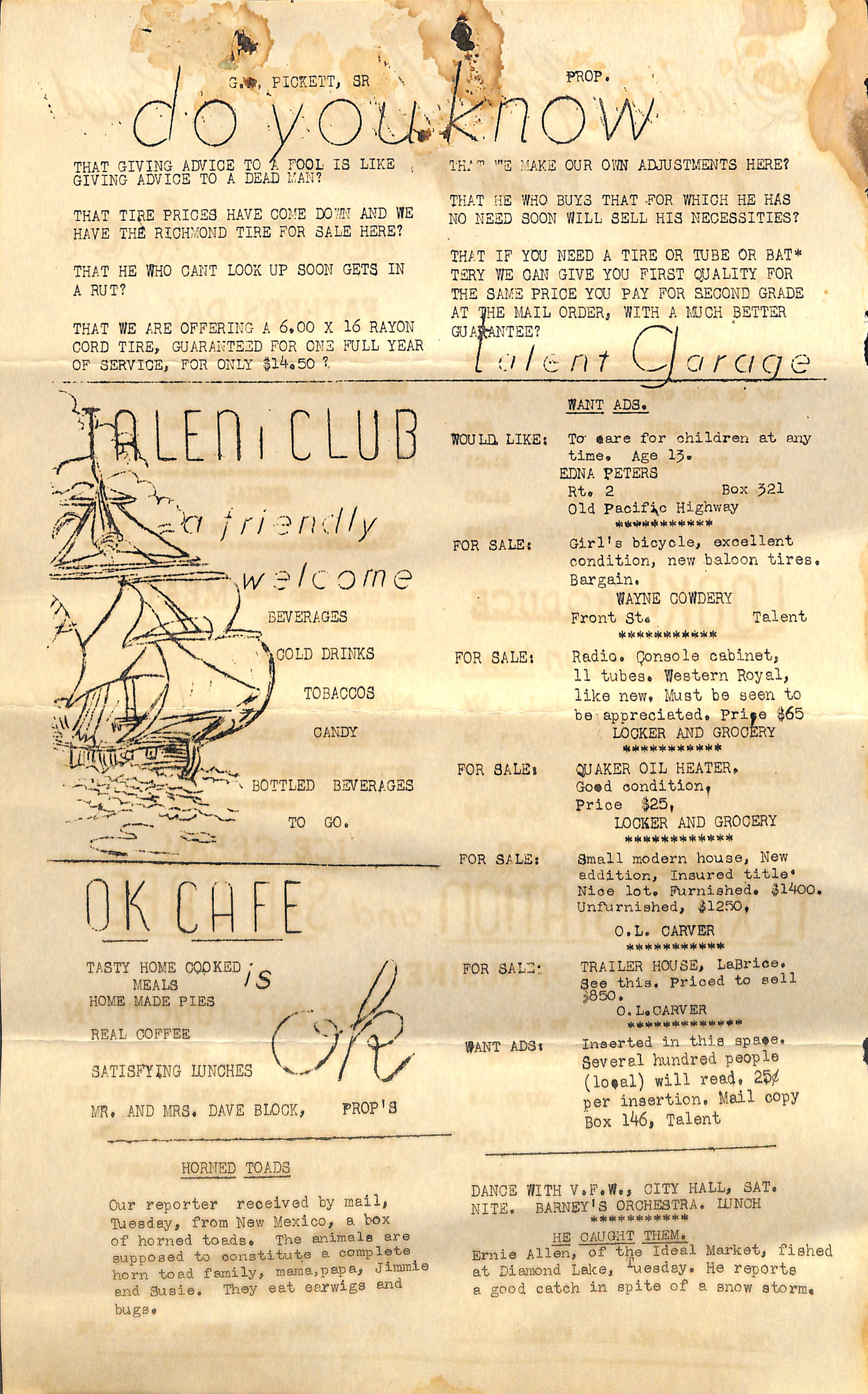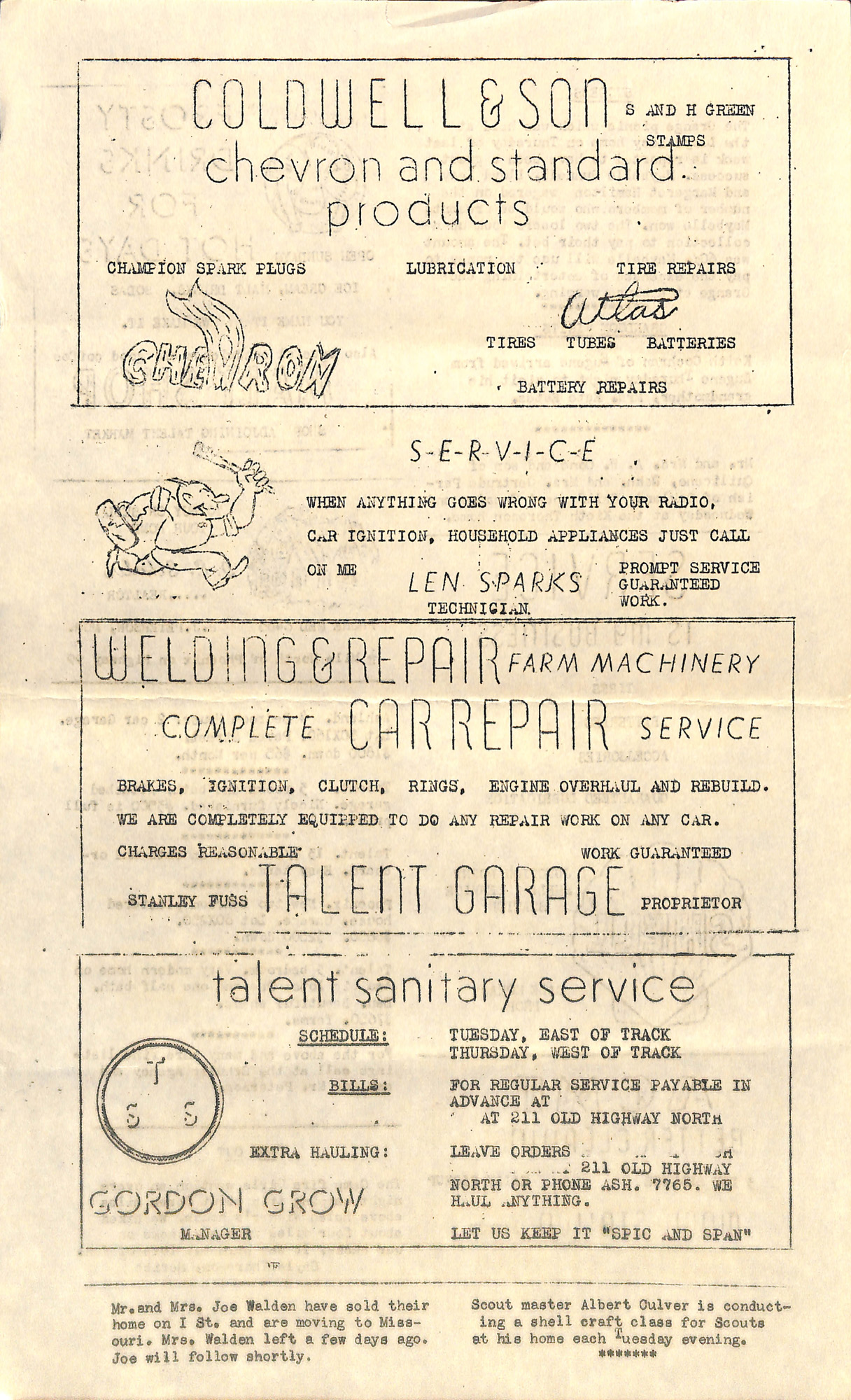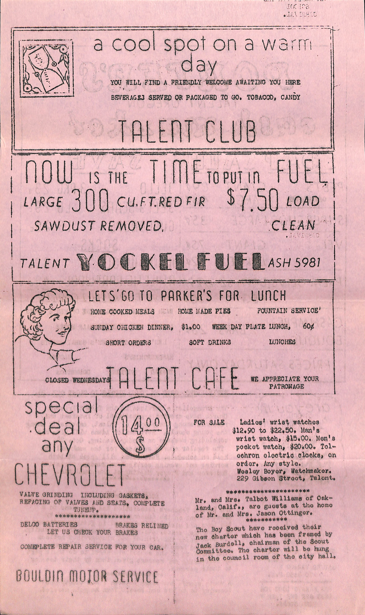 Transcribed in 2024 by Mary Tsui. Issues not transcribed below are not known to have survived; please notify me if any are discovered. No issues were published during World War II, 1942-45. Links to images of all the surviving issues can be found here. SENIOR PLAY--The seniors of Talent will present a three act-comedy, "The Lucky Collegiates" on May 4, at 8 o'clock at the Talent School Auditorium. The cast includes Clarence Smith, Genevieve Walty, Nina Pepper, Kenneth Kamberg, Dean Ashcraft, Donald McCulloch, Doris Work, Ed Leaming, Roberta Frink, Irene Alcock, Dorothy Zemke, Laverne Zemke, and John Kelty. The school orchestra will furnish music. Tickets on sale [at] Tryon's Store Friday. General admission ten and fifteen cents. Reserved seats 25¢. Talent News Flashes April 26, 1934, now lost. Reprinted in the April 3, 1959 News Flashes We wonder how many people living in Talent realize what would happen if we really had a fire. Just what would we do with the fire fighting apparatus that is available at the present time. One good fire could wipe out this town. This, folks, is food for thought. Why can't we, the same as other towns of this size, organize a volunteer fire department, get more adequate equipment and be more prepared in case of fire? [NOTE: The fire fighting equipment at this time (1934) as old timers will recall, consisted of a two-wheeled cart with a hand pump and a reel of two-inch hose which was hauled to the fires by manual strength or if hooked on behind a car usually lost most of the equipment before it arrived at its destination. It was stored under the city hall and the fire alarm was a wild ringing of the City Hall bell. We can be proud of the progress made in the past 25 years] Talent News Flashes April 26, 1934, now lost. Reprinted in the April 3, 1959 News Flashes ---------------------------------------------------