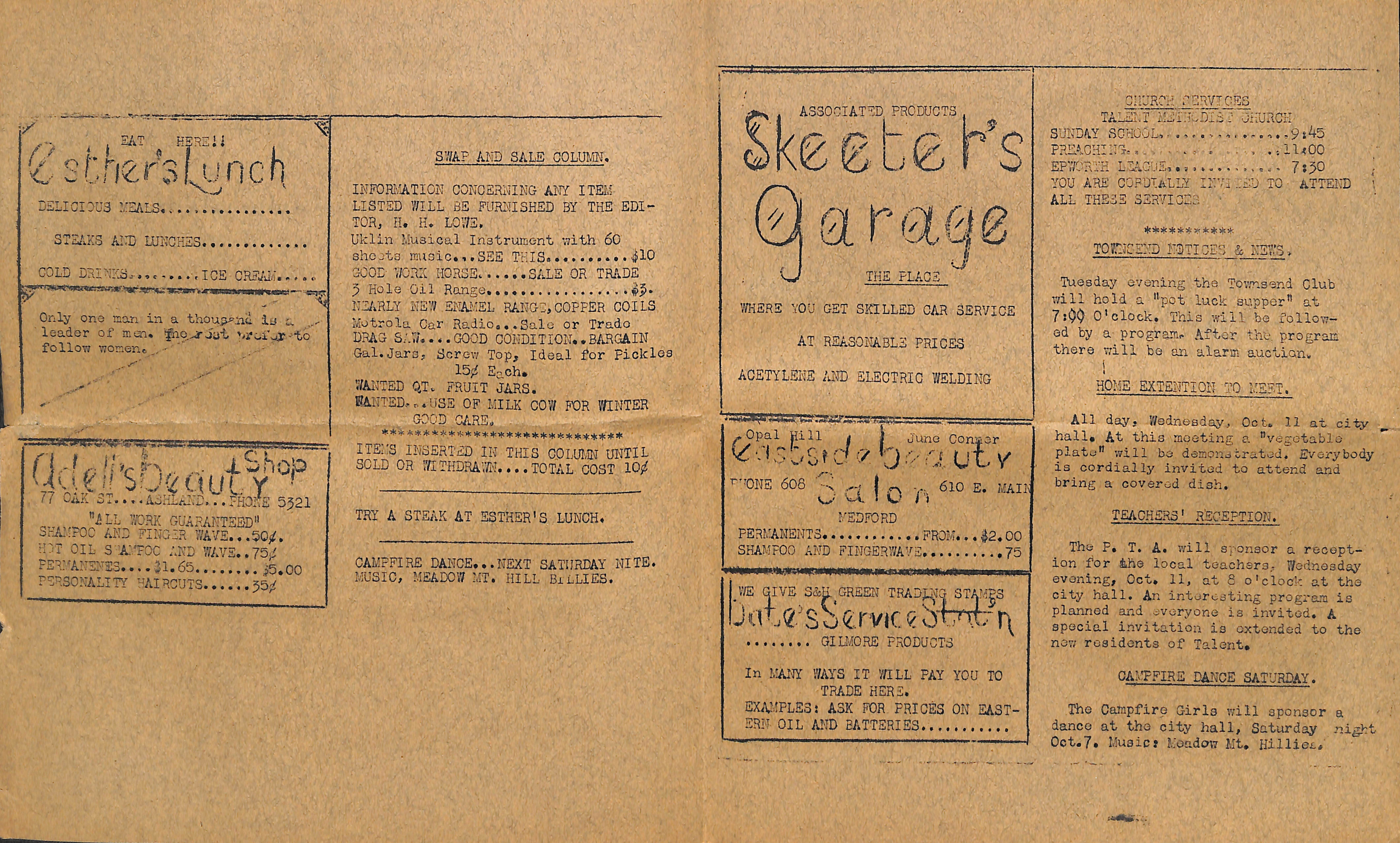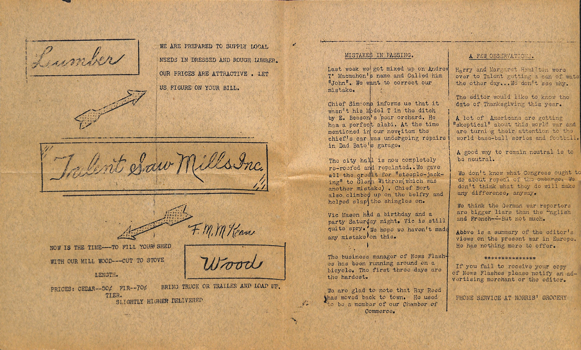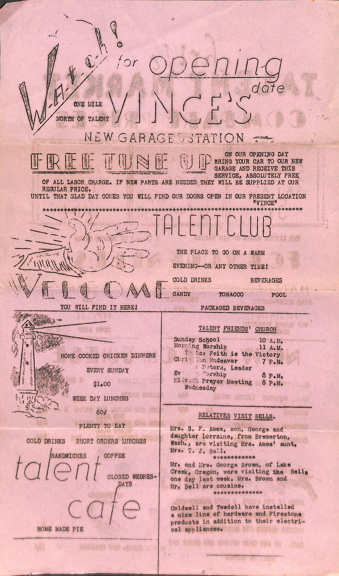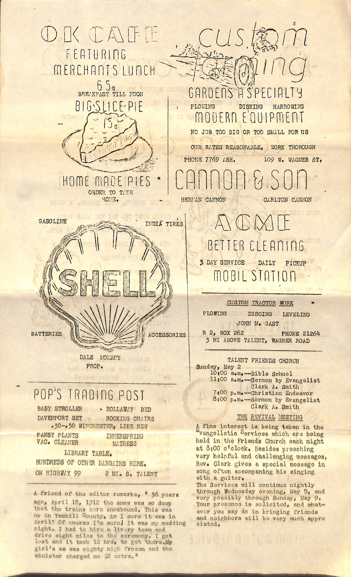 Transcribed in 2024 by Mary Tsui. Issues not transcribed below are not known to have survived; please notify me if any are discovered. No issues were published during World War II, 1942-45. Links to images of all the surviving issues can be found here. SENIOR PLAY--The seniors of Talent will present a three act-comedy, "The Lucky Collegiates" on May 4, at 8 o'clock at the Talent School Auditorium. The cast includes Clarence Smith, Genevieve Walty, Nina Pepper, Kenneth Kamberg, Dean Ashcraft, Donald McCulloch, Doris Work, Ed Leaming, Roberta Frink, Irene Alcock, Dorothy Zemke, Laverne Zemke, and John Kelty. The school orchestra will furnish music. Tickets on sale [at] Tryon's Store Friday. General admission ten and fifteen cents. Reserved seats 25¢. Talent News Flashes April 26, 1934, now lost. Reprinted in the April 3, 1959 News Flashes We wonder how many people living in Talent realize what would happen if we really had a fire. Just what would we do with the fire fighting apparatus that is available at the present time. One good fire could wipe out this town. This, folks, is food for thought. Why can't we, the same as other towns of this size, organize a volunteer fire department, get more adequate equipment and be more prepared in case of fire? [NOTE: The fire fighting equipment at this time (1934) as old timers will recall, consisted of a two-wheeled cart with a hand pump and a reel of two-inch hose which was hauled to the fires by manual strength or if hooked on behind a car usually lost most of the equipment before it arrived at its destination. It was stored under the city hall and the fire alarm was a wild ringing of the City Hall bell. We can be proud of the progress made in the past 25 years] Talent News Flashes April 26, 1934, now lost. Reprinted in the April 3, 1959 News Flashes ---------------------------------------------------