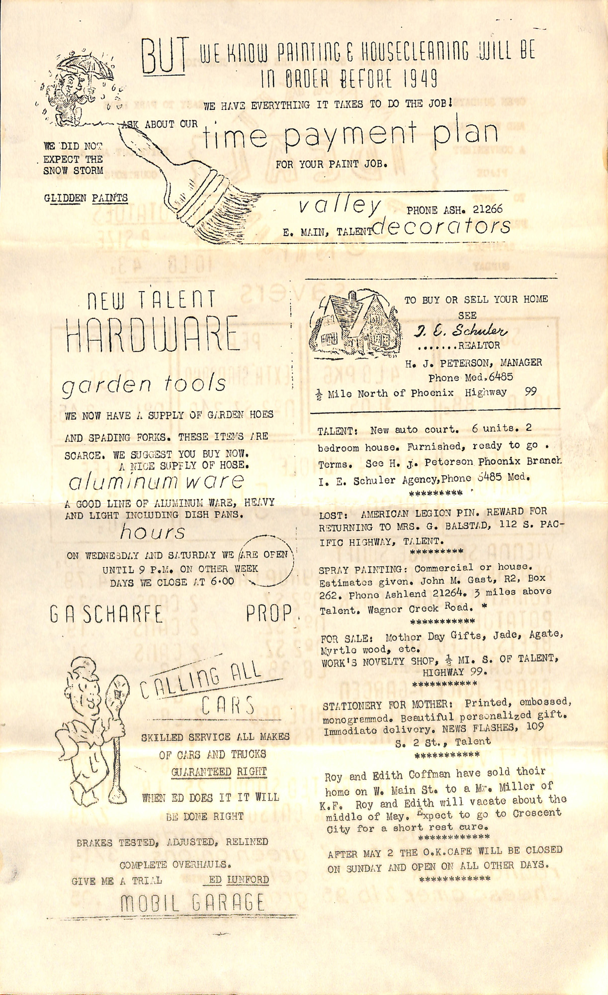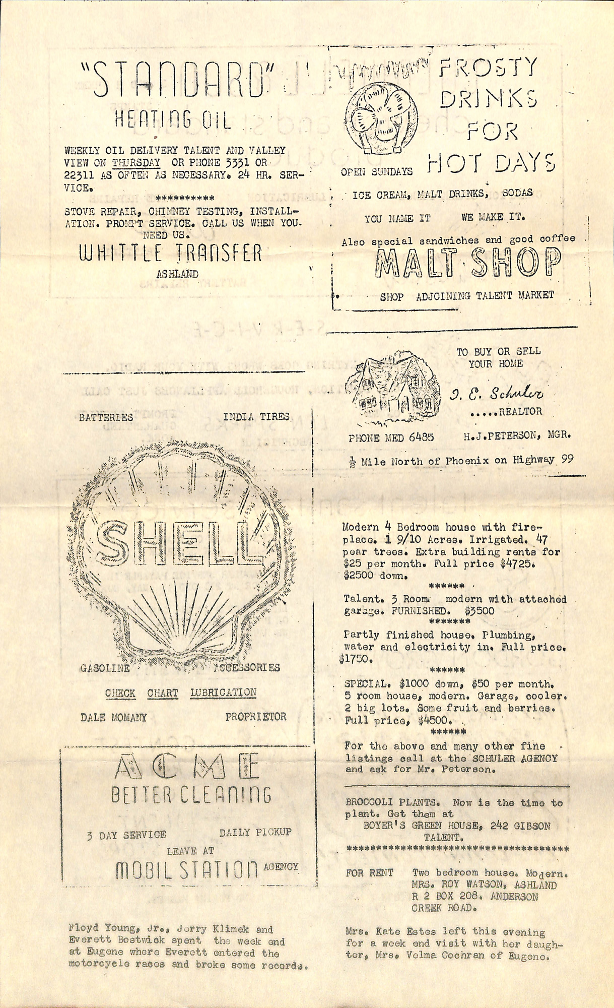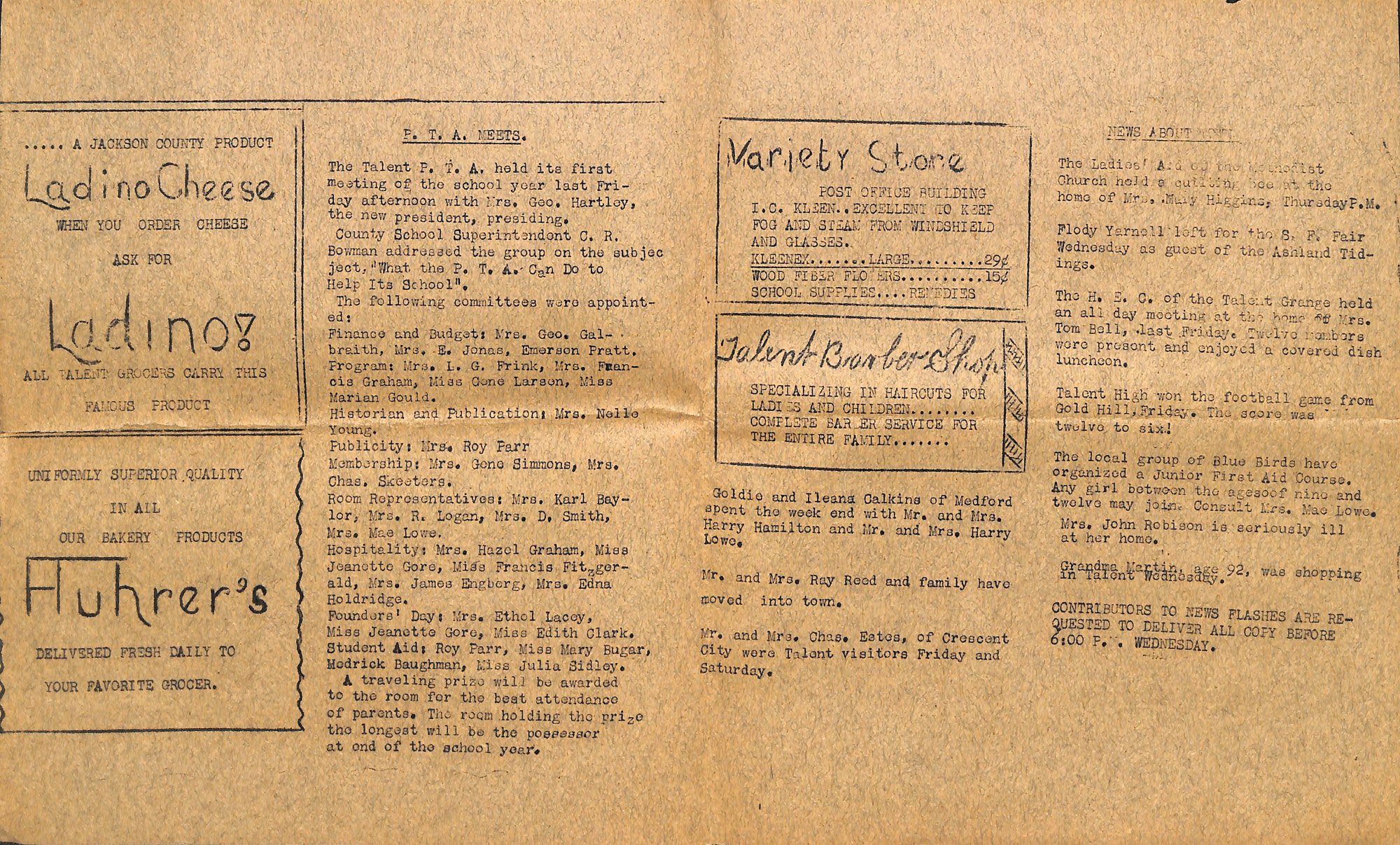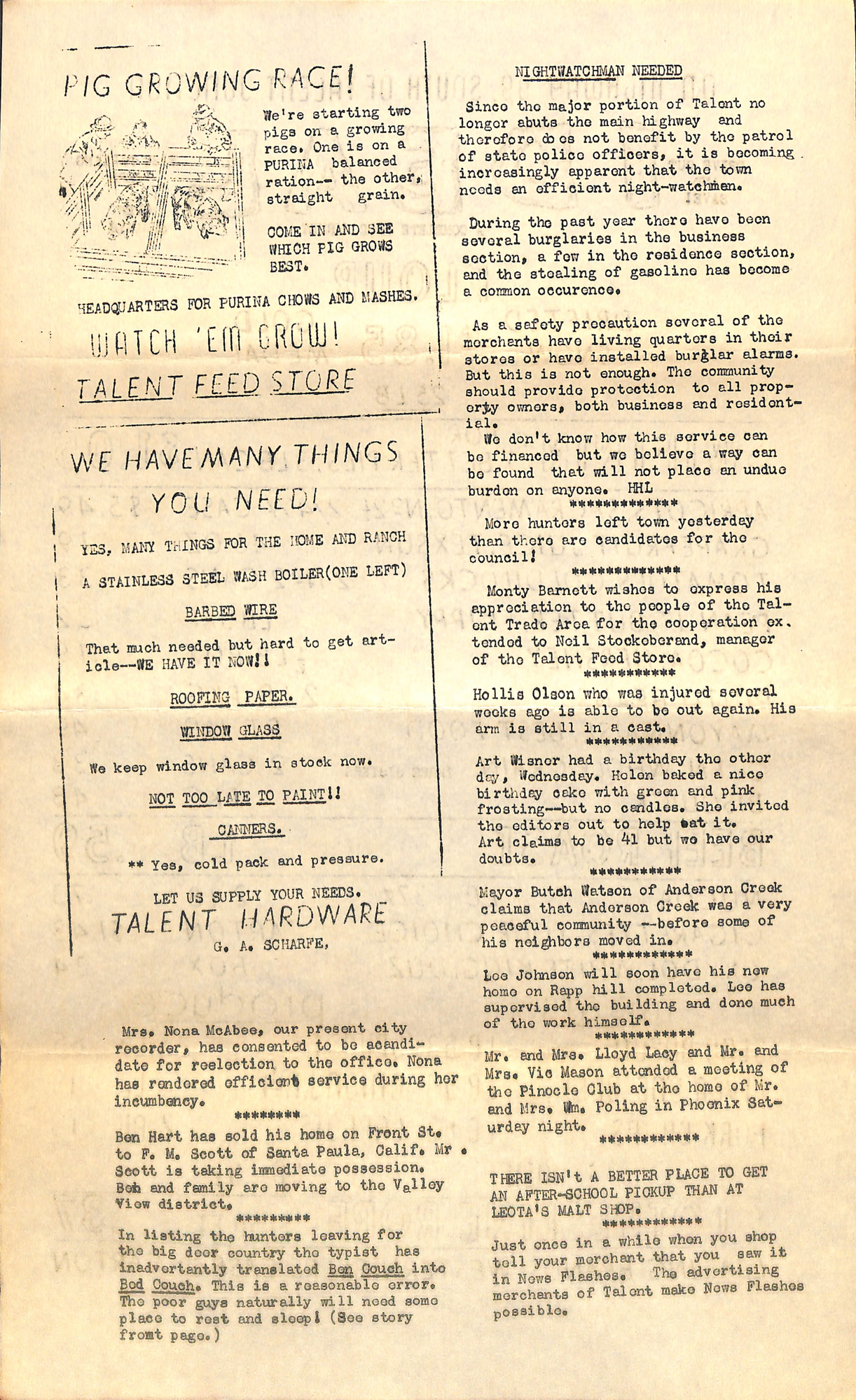 TALENT OREGON News Flashes EVERYBODY READS NEWS FLASHES VOL. X NO. 40 FRIDAY, OCTOBER 1, 1948 P.T.A. EXECUTIVE COMMITTEE TO MEET. The officers and heads of committees of the P.T.A. will meet in executive session at the school building Monday evening at 8 o'clock. ANNUAL GARDEN EXHIBIT The Annual Flower Show of the Talent Garden Club will be held at the Talent city hall, Oct. 6 from 2 P.M. to 7 P.M. All residents of Talent and surrounding territory are invited to exhibit flower and vegetables. Entries are non-competitive. Entries should be brought to the hall in the morning to permit arrangement. A silver tea will be served and extra flowers and shrubs will be offered for sale. The public is cordially invited to attend this exhibit. Don't forget the date. Wednesday, October 6. NEW HIGH SCHOOL OFFICERS The following student body and class officers were elected at a meeting held Friday, Sept. 24. They will serve during the 1948-49 school year. Student Body President: Bud King. Vice President, Chas. Zickefoose; Secretary, Joyce Mumford; Business Managers, Margaret Egan and Frances Sullivan; Editor High School Annual, Francis Sullivan; Editor School Paper, Virginia Peters and John York. Senior Class Officers: Pres., John York; Vice-Pres., Donald Millage; Sect., Betty Henry. Junior Officers: Pres., Joyce Mumford; Vice-Pres., Geo. Baylor; Sect., Virginia Peters. Sophomore Officers: Pres., Joyce Paul; Vice-Pres., Jerry Montgomery; Sect., Lois Zickefoose. Freshman Officers: Pres., Willis Zumwalt; Vice-Pres., Kenny Reynolds; Sect., Joanne Jonnis. TO CLOSE MONDAY AND TUESDAY In order to hunt in the Klamath and Lake country Otto and Wave King will close King's Café on Monday and Tuesday. OTHER NIMRODS Other would-be deer slayers who have gone into the wilds are Lucky Gilbreath, Tiney Combest, Ernie White, Chet Ricks, Victor Mason, Lester Mason, Roy Coghill, Rube Brandin, Harvey Peterson. Also Ira Culver and his Valley Decorator crew consisting of Ted Culver, Lester Young, Bed Couch [Ben Coush] and Richard Evans. Also Ernie Allen of the Ideal Market and Harry Eskridge of Harry's Place. It is the consensus of opinion that a few of these gentlemen are good shots, some subject to buck fever and the rest can't hit the broad side of a barn. ABOUT OUR POPULACE. Born to Mr. and Mrs. W. Buchanan, Sept. 28, Medford Community Hospital, a son. Wt. 8 lb. Mr. and Mrs. Andrew Evans and dog, Tippy, of Pasadena, Calif. were recent visitors at the Ira Culver home. While here they journeyed to Crater Lake during a snow storm. Mr. Evans is an employee of the Douglas Aircraft Co. The Evans (with Tippy) expect to return to Talent next summer and there is a probability that they will make their permanent home in this valley. On Sept. 25 Lee and Mary Johnson were guests of the Lee Hamilton family. The occasion was the birthday of Mary. Mr. and Mrs. Dan Favor and son Mike, of Myrtle Point, were guests of Mr. and Mrs. Vic Mason on Monday evening. Mr. and Mrs. John Sample journeyed to Grants Pass last Saturday evening to attend the Southern Oregon Trucker League banquet. John is vice-president of the league. Mrs. Belle Stevens who suffered a stroke some time ago was taken to the Community Hospital of Medford on Wednesday. John Childers who was recently nominated for the office of mayor has withdrawn his name as has Mrs. Momany, nominee for the office of recorder. PORTER'S CASH GROCERY Under the name of Porter's Cash Grocery Mr. and Mrs. Porter are inserting their first News Flash advertisement in this issue. They invite the public to visit their store and get acquainted. SOME BRIEFS Gertrude Ottinger, Winnie Mason and Bernice Breese attended the Extension Unit Officer Training School at Rogue River on Wednesday. Mrs. Opal Welch, formerly president of the Extension Unit has resigned. Mrs. Bernice Breese has been elected to fill the vacancy and Mrs. Winnie Mason has been made vice-president. A new fire hydrant was installed on Wagner Avenue on Tuesday night. There was much gurgling and popping of water tanks. Page 2, full-page ad for: TALENT MARKET Page 3, full-page ad for: IDEAL MARKET Page 4, ads for: COL. MIKE DENOMA, AUCTIONEER TALENT FEED TALENT HARDWARE FOR SALE--Limited quantity of laurel wood. For cook stove, also some for heater. Low price for this excellent wood on ground, or will deliver. Also some body fir, heater. $4.00 per tier. GEORGE A. HOLD, ANDERSON CREEK ROAD. FOR SALE--80 cedar posts, 7 feet. 45¢ each. Call at McCurtain Garage. R. C. WOOD, OLD HIGHWAY. WANT ADS Your Ad--Inserted in this column will be ready by several hundred families in the Talent trade area. Cost, 25¢ per insertion. MAIL COPY TO DRAWER H, TALENT, or LEAVE AT 109 S. SECOND. WANTED--Saws to file. Skilled work. G. WITTE, 223 OLD HIGHWAY SOUTH FOR RENT--3 room apartment. 3 rooms and kitchenette. Modern and clean. Furnished. R.D. WATSON, OX 462, TALENT, ANDERSON CREEK ROAD. NOTICE--Baron Byrd is no longer connected with the Ashland Auction Yard. COL. MIKE DENOMA, R 1, BOX 110, TALENT. SAW FILING--Expert saw filing. Your saws filed to suit. ALFRED CULVER, VALLEY DECORATORS STORE, TALENT. NOTICE--YOUR WATKINS DEALER. BUNTON'S VARIETY STORE. R. L. BUNTON, PHOENIX, OREGON. PHONE 6612 OR 7811, evenings. FOR SALE--Nice dry Hubbard and Banana squash. 4¢ per pound. BERT BELL, PHONE 4484 OLD HIGHWAY S., ACROSS ROAD FROM COLUMBIA ORCHARD. Page 5, ads for: WHITTLE TRANSFER LEOTA'S MALT SHOP SHELL STATION HARVEY PETERSON REAL ESTATE LUNSFORD MOBIL GARAGE ACME BETTER CLEANING FARMERS INSURANCE GROUP If there are children in your family under 20 years of age and 4 or older they should be enumerated in the school census, whether living at home or not. This includes those in the armed service and married daughters living at home. BRING--Bring the kiddies to see the "Ghost" in the window after dark at the Variety Shop now till Hallowe'en. Open evenings for your convenience. TALENT VARIETY SHOP, 204 E. MAIN TALENT. FOR SALE--Apartment size, white enamel elec