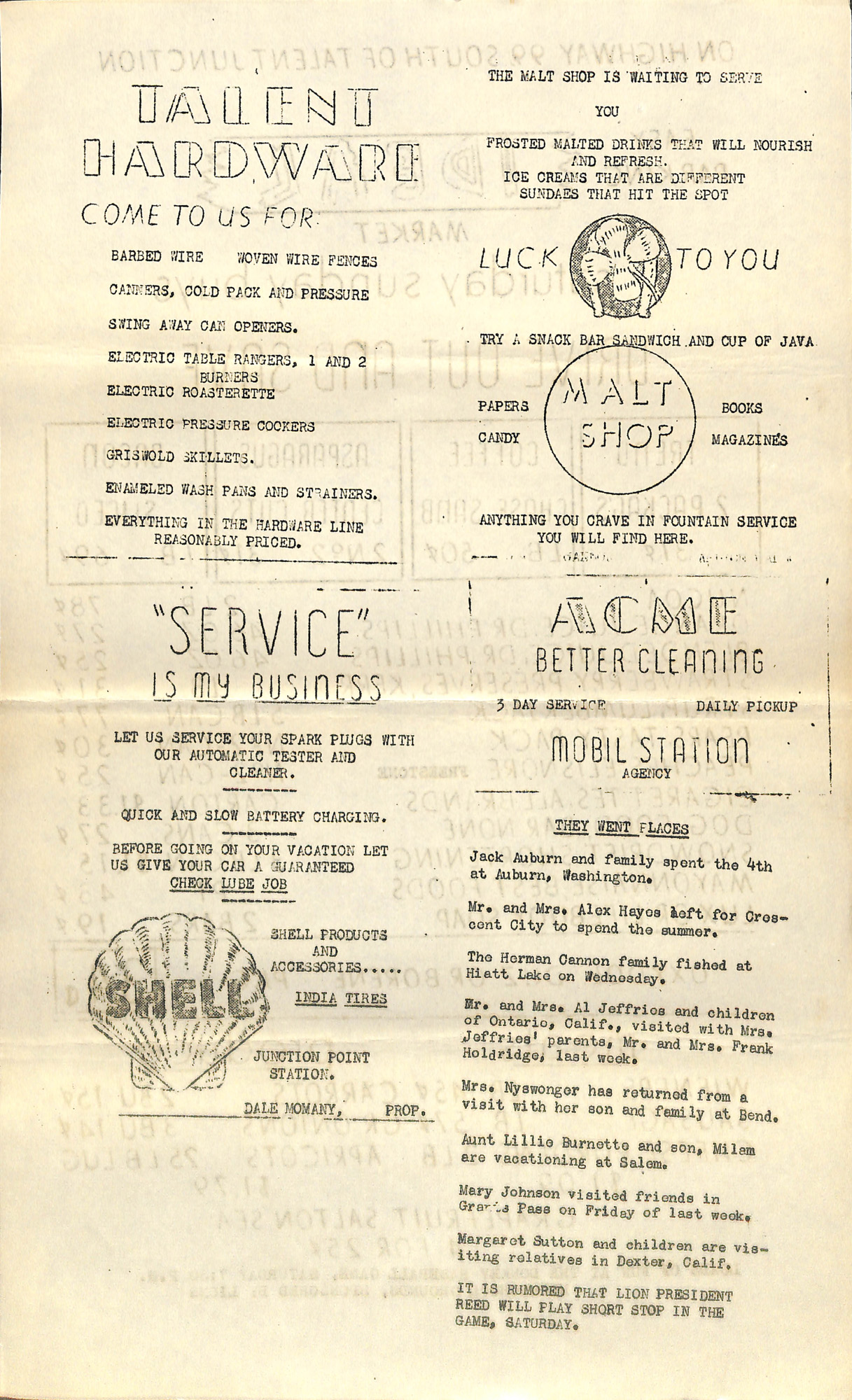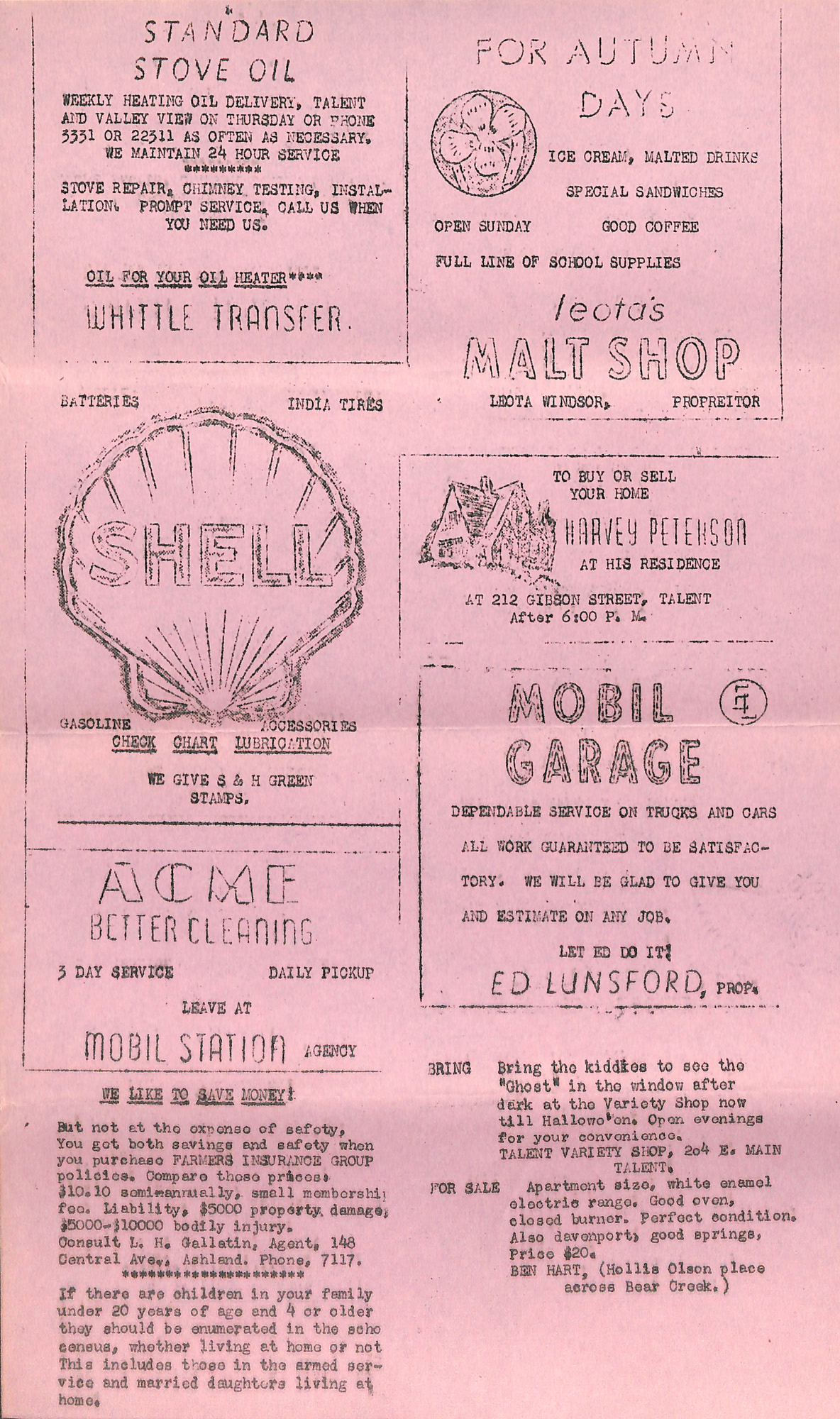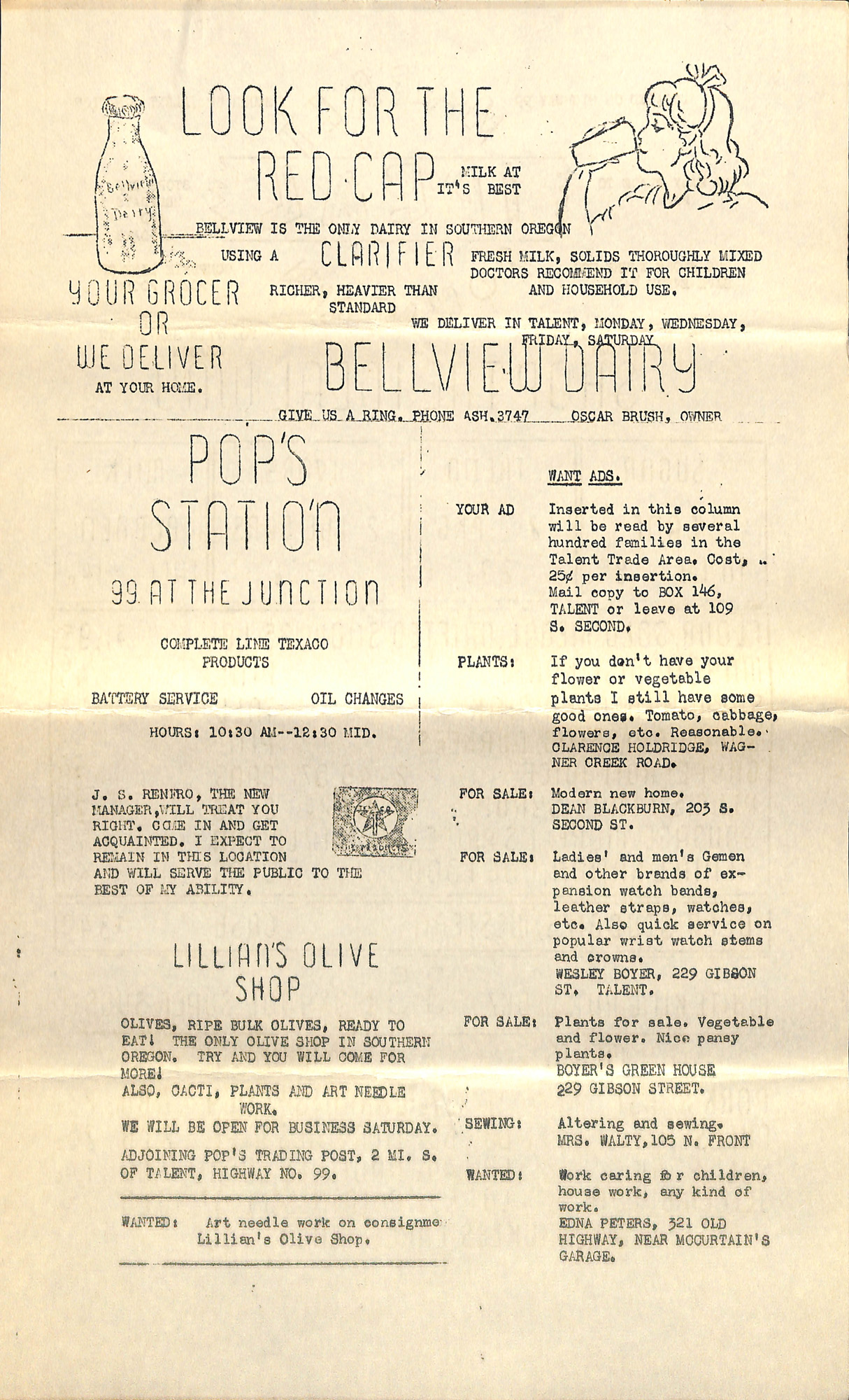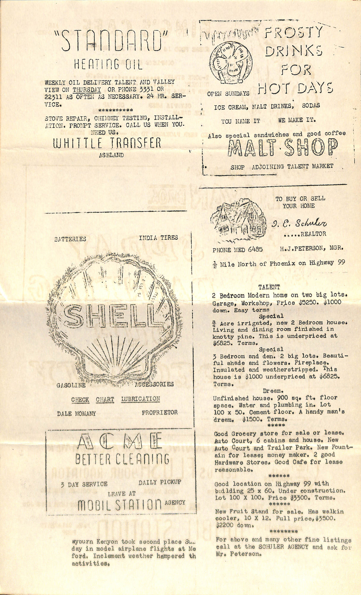 TALENT OREGON News Flashes EVERYBODY READS NEWS FLASHES VOL. X NO. 40 FRIDAY, OCTOBER 1, 1948 P.T.A. EXECUTIVE COMMITTEE TO MEET. The officers and heads of committees of the P.T.A. will meet in executive session at the school building Monday evening at 8 o'clock. ANNUAL GARDEN EXHIBIT The Annual Flower Show of the Talent Garden Club will be held at the Talent city hall, Oct. 6 from 2 P.M. to 7 P.M. All residents of Talent and surrounding territory are invited to exhibit flower and vegetables. Entries are non-competitive. Entries should be brought to the hall in the morning to permit arrangement. A silver tea will be served and extra flowers and shrubs will be offered for sale. The public is cordially invited to attend this exhibit. Don't forget the date. Wednesday, October 6. NEW HIGH SCHOOL OFFICERS The following student body and class officers were elected at a meeting held Friday, Sept. 24. They will serve during the 1948-49 school year. Student Body President: Bud King. Vice President, Chas. Zickefoose; Secretary, Joyce Mumford; Business Managers, Margaret Egan and Frances Sullivan; Editor High School Annual, Francis Sullivan; Editor School Paper, Virginia Peters and John York. Senior Class Officers: Pres., John York; Vice-Pres., Donald Millage; Sect., Betty Henry. Junior Officers: Pres., Joyce Mumford; Vice-Pres., Geo. Baylor; Sect., Virginia Peters. Sophomore Officers: Pres., Joyce Paul; Vice-Pres., Jerry Montgomery; Sect., Lois Zickefoose. Freshman Officers: Pres., Willis Zumwalt; Vice-Pres., Kenny Reynolds; Sect., Joanne Jonnis. TO CLOSE MONDAY AND TUESDAY In order to hunt in the Klamath and Lake country Otto and Wave King will close King's Café on Monday and Tuesday. OTHER NIMRODS Other would-be deer slayers who have gone into the wilds are Lucky Gilbreath, Tiney Combest, Ernie White, Chet Ricks, Victor Mason, Lester Mason, Roy Coghill, Rube Brandin, Harvey Peterson. Also Ira Culver and his Valley Decorator crew consisting of Ted Culver, Lester Young, Bed Couch [Ben Coush] and Richard Evans. Also Ernie Allen of the Ideal Market and Harry Eskridge of Harry's Place. It is the consensus of opinion that a few of these gentlemen are good shots, some subject to buck fever and the rest can't hit the broad side of a barn. ABOUT OUR POPULACE. Born to Mr. and Mrs. W. Buchanan, Sept. 28, Medford Community Hospital, a son. Wt. 8 lb. Mr. and Mrs. Andrew Evans and dog, Tippy, of Pasadena, Calif. were recent visitors at the Ira Culver home. While here they journeyed to Crater Lake during a snow storm. Mr. Evans is an employee of the Douglas Aircraft Co. The Evans (with Tippy) expect to return to Talent next summer and there is a probability that they will make their permanent home in this valley. On Sept. 25 Lee and Mary Johnson were guests of the Lee Hamilton family. The occasion was the birthday of Mary. Mr. and Mrs. Dan Favor and son Mike, of Myrtle Point, were guests of Mr. and Mrs. Vic Mason on Monday evening. Mr. and Mrs. John Sample journeyed to Grants Pass last Saturday evening to attend the Southern Oregon Trucker League banquet. John is vice-president of the league. Mrs. Belle Stevens who suffered a stroke some time ago was taken to the Community Hospital of Medford on Wednesday. John Childers who was recently nominated for the office of mayor has withdrawn his name as has Mrs. Momany, nominee for the office of recorder. PORTER'S CASH GROCERY Under the name of Porter's Cash Grocery Mr. and Mrs. Porter are inserting their first News Flash advertisement in this issue. They invite the public to visit their store and get acquainted. SOME BRIEFS Gertrude Ottinger, Winnie Mason and Bernice Breese attended the Extension Unit Officer Training School at Rogue River on Wednesday. Mrs. Opal Welch, formerly president of the Extension Unit has resigned. Mrs. Bernice Breese has been elected to fill the vacancy and Mrs. Winnie Mason has been made vice-president. A new fire hydrant was installed on Wagner Avenue on Tuesday night. There was much gurgling and popping of water tanks. Page 2, full-page ad for: TALENT MARKET Page 3, full-page ad for: IDEAL MARKET Page 4, ads for: COL. MIKE DENOMA, AUCTIONEER TALENT FEED TALENT HARDWARE FOR SALE--Limited quantity of laurel wood. For cook stove, also some for heater. Low price for this excellent wood on ground, or will deliver. Also some body fir, heater. $4.00 per tier. GEORGE A. HOLD, ANDERSON CREEK ROAD. FOR SALE--80 cedar posts, 7 feet. 45¢ each. Call at McCurtain Garage. R. C. WOOD, OLD HIGHWAY. WANT ADS Your Ad--Inserted in this column will be ready by several hundred families in the Talent trade area. Cost, 25¢ per insertion. MAIL COPY TO DRAWER H, TALENT, or LEAVE AT 109 S. SECOND. WANTED--Saws to file. Skilled work. G. WITTE, 223 OLD HIGHWAY SOUTH FOR RENT--3 room apartment. 3 rooms and kitchenette. Modern and clean. Furnished. R.D. WATSON, OX 462, TALENT, ANDERSON CREEK ROAD. NOTICE--Baron Byrd is no longer connected with the Ashland Auction Yard. COL. MIKE DENOMA, R 1, BOX 110, TALENT. SAW FILING--Expert saw filing. Your saws filed to suit. ALFRED CULVER, VALLEY DECORATORS STORE, TALENT. NOTICE--YOUR WATKINS DEALER. BUNTON'S VARIETY STORE. R. L. BUNTON, PHOENIX, OREGON. PHONE 6612 OR 7811, evenings. FOR SALE--Nice dry Hubbard and Banana squash. 4¢ per pound. BERT BELL, PHONE 4484 OLD HIGHWAY S., ACROSS ROAD FROM COLUMBIA ORCHARD. Page 5, ads for: WHITTLE TRANSFER LEOTA'S MALT SHOP SHELL STATION HARVEY PETERSON REAL ESTATE LUNSFORD MOBIL GARAGE ACME BETTER CLEANING FARMERS INSURANCE GROUP If there are children in your family under 20 years of age and 4 or older they should be enumerated in the school census, whether living at home or not. This includes those in the armed service and married daughters living at home. BRING--Bring the kiddies to see the "Ghost" in the window after dark at the Variety Shop now till Hallowe'en. Open evenings for your convenience. TALENT VARIETY SHOP, 204 E. MAIN TALENT. FOR SALE--Apartment size, white enamel elec