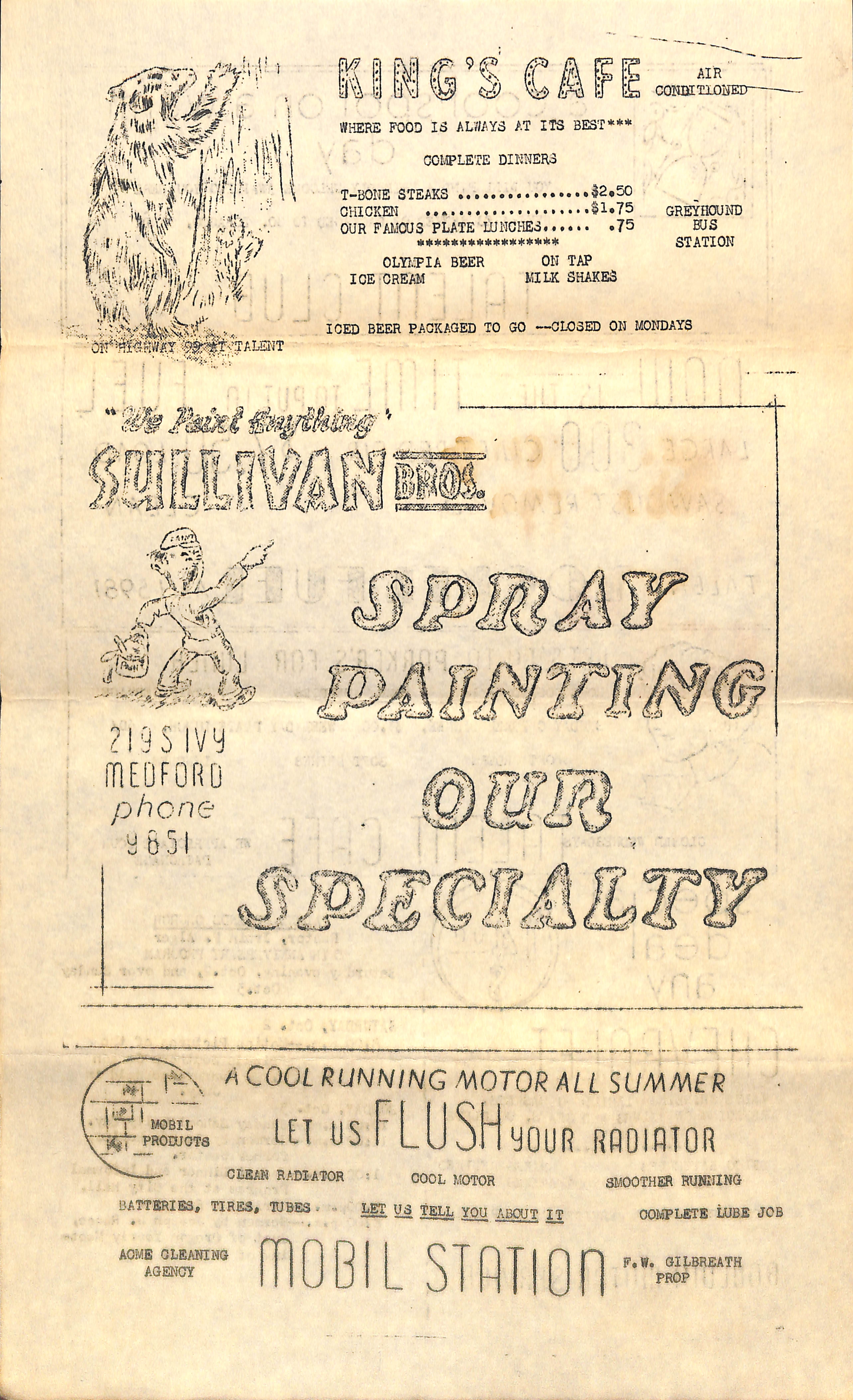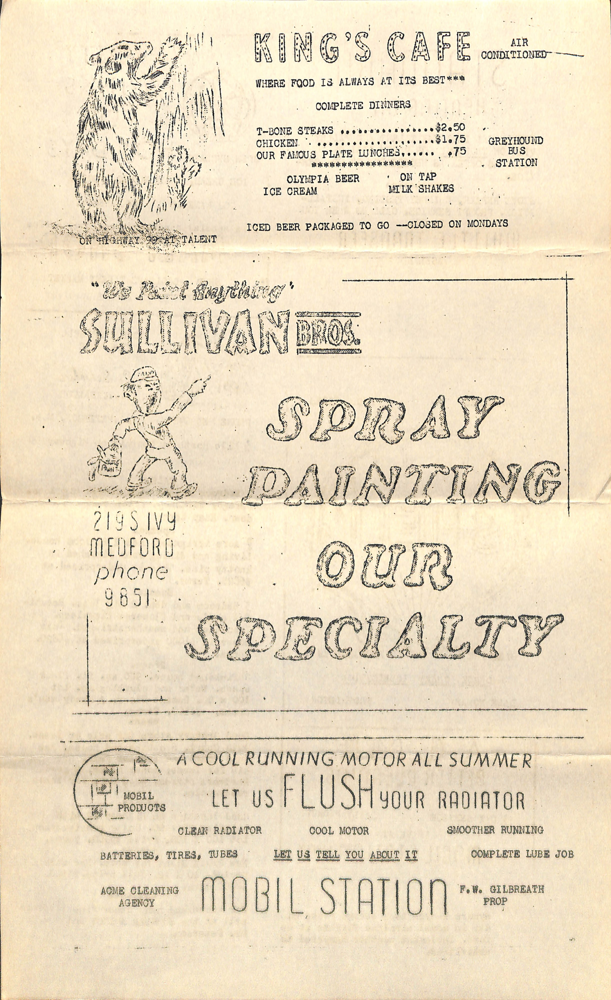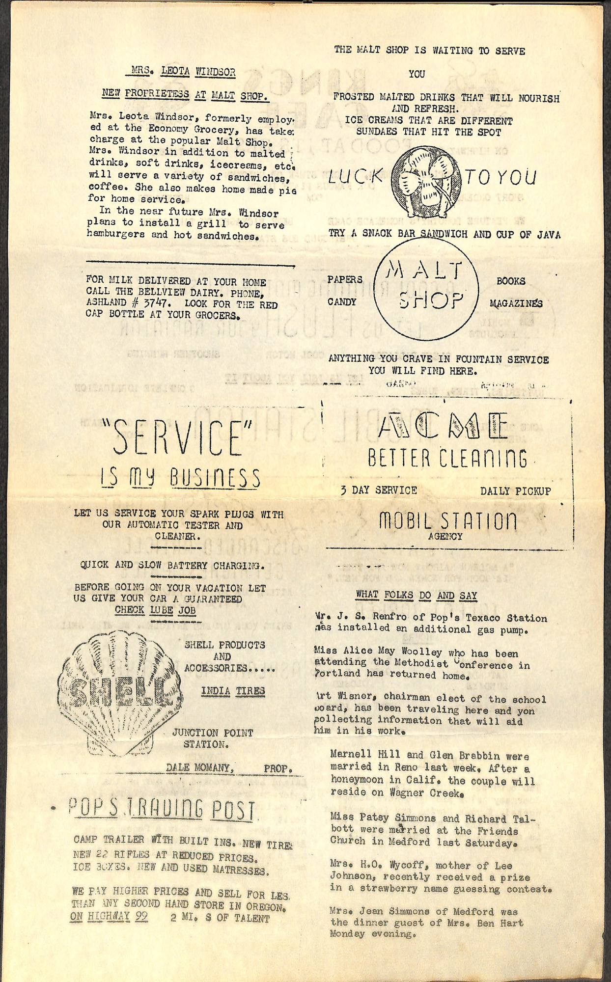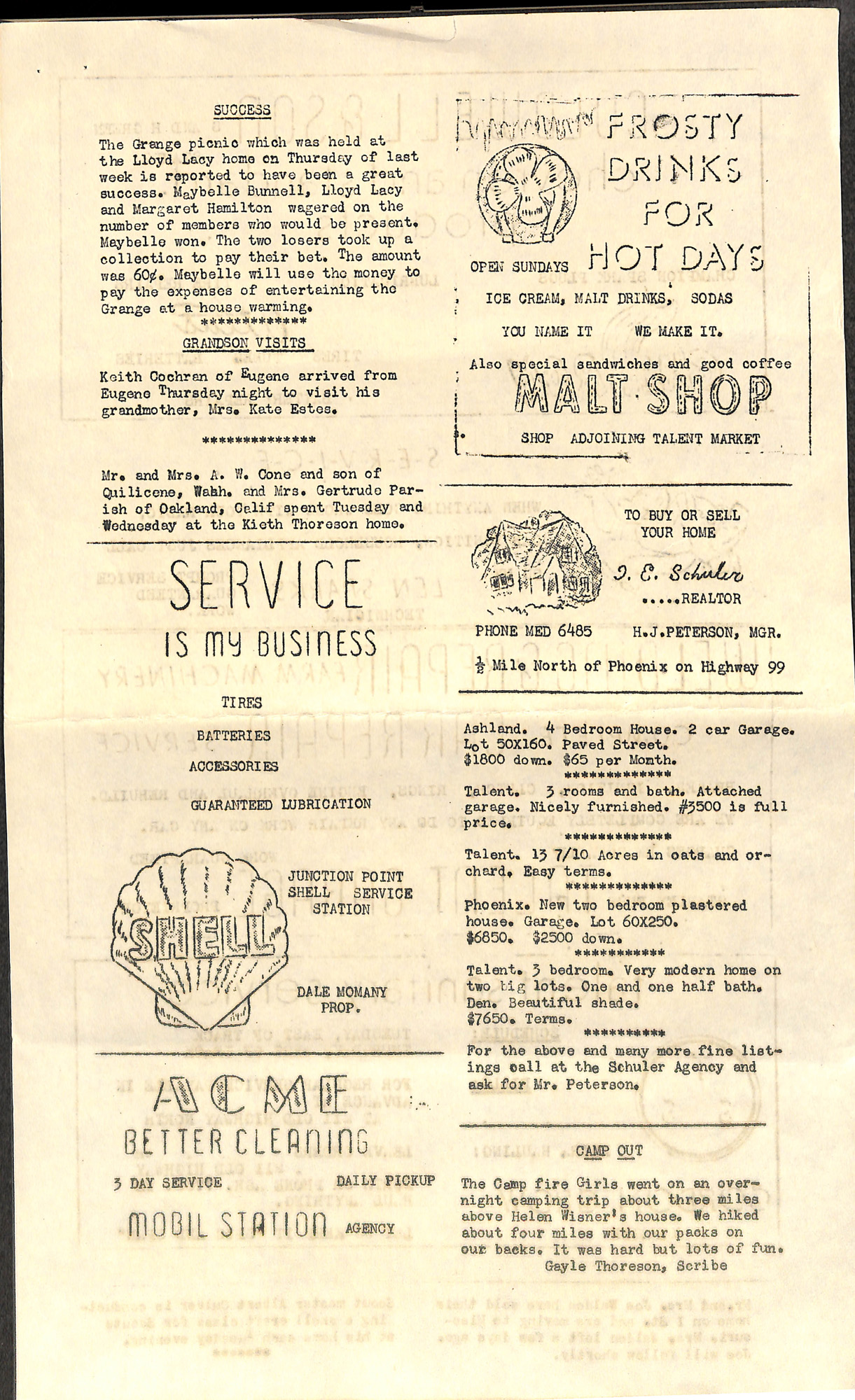 TALENT OREGON News Flashes EVERYBODY READS NEWS FLASHES VOL. X NO. 40 FRIDAY, OCTOBER 1, 1948 P.T.A. EXECUTIVE COMMITTEE TO MEET. The officers and heads of committees of the P.T.A. will meet in executive session at the school building Monday evening at 8 o'clock. ANNUAL GARDEN EXHIBIT The Annual Flower Show of the Talent Garden Club will be held at the Talent city hall, Oct. 6 from 2 P.M. to 7 P.M. All residents of Talent and surrounding territory are invited to exhibit flower and vegetables. Entries are non-competitive. Entries should be brought to the hall in the morning to permit arrangement. A silver tea will be served and extra flowers and shrubs will be offered for sale. The public is cordially invited to attend this exhibit. Don't forget the date. Wednesday, October 6. NEW HIGH SCHOOL OFFICERS The following student body and class officers were elected at a meeting held Friday, Sept. 24. They will serve during the 1948-49 school year. Student Body President: Bud King. Vice President, Chas. Zickefoose; Secretary, Joyce Mumford; Business Managers, Margaret Egan and Frances Sullivan; Editor High School Annual, Francis Sullivan; Editor School Paper, Virginia Peters and John York. Senior Class Officers: Pres., John York; Vice-Pres., Donald Millage; Sect., Betty Henry. Junior Officers: Pres., Joyce Mumford; Vice-Pres., Geo. Baylor; Sect., Virginia Peters. Sophomore Officers: Pres., Joyce Paul; Vice-Pres., Jerry Montgomery; Sect., Lois Zickefoose. Freshman Officers: Pres., Willis Zumwalt; Vice-Pres., Kenny Reynolds; Sect., Joanne Jonnis. TO CLOSE MONDAY AND TUESDAY In order to hunt in the Klamath and Lake country Otto and Wave King will close King's Café on Monday and Tuesday. OTHER NIMRODS Other would-be deer slayers who have gone into the wilds are Lucky Gilbreath, Tiney Combest, Ernie White, Chet Ricks, Victor Mason, Lester Mason, Roy Coghill, Rube Brandin, Harvey Peterson. Also Ira Culver and his Valley Decorator crew consisting of Ted Culver, Lester Young, Bed Couch [Ben Coush] and Richard Evans. Also Ernie Allen of the Ideal Market and Harry Eskridge of Harry's Place. It is the consensus of opinion that a few of these gentlemen are good shots, some subject to buck fever and the rest can't hit the broad side of a barn. ABOUT OUR POPULACE. Born to Mr. and Mrs. W. Buchanan, Sept. 28, Medford Community Hospital, a son. Wt. 8 lb. Mr. and Mrs. Andrew Evans and dog, Tippy, of Pasadena, Calif. were recent visitors at the Ira Culver home. While here they journeyed to Crater Lake during a snow storm. Mr. Evans is an employee of the Douglas Aircraft Co. The Evans (with Tippy) expect to return to Talent next summer and there is a probability that they will make their permanent home in this valley. On Sept. 25 Lee and Mary Johnson were guests of the Lee Hamilton family. The occasion was the birthday of Mary. Mr. and Mrs. Dan Favor and son Mike, of Myrtle Point, were guests of Mr. and Mrs. Vic Mason on Monday evening. Mr. and Mrs. John Sample journeyed to Grants Pass last Saturday evening to attend the Southern Oregon Trucker League banquet. John is vice-president of the league. Mrs. Belle Stevens who suffered a stroke some time ago was taken to the Community Hospital of Medford on Wednesday. John Childers who was recently nominated for the office of mayor has withdrawn his name as has Mrs. Momany, nominee for the office of recorder. PORTER'S CASH GROCERY Under the name of Porter's Cash Grocery Mr. and Mrs. Porter are inserting their first News Flash advertisement in this issue. They invite the public to visit their store and get acquainted. SOME BRIEFS Gertrude Ottinger, Winnie Mason and Bernice Breese attended the Extension Unit Officer Training School at Rogue River on Wednesday. Mrs. Opal Welch, formerly president of the Extension Unit has resigned. Mrs. Bernice Breese has been elected to fill the vacancy and Mrs. Winnie Mason has been made vice-president. A new fire hydrant was installed on Wagner Avenue on Tuesday night. There was much gurgling and popping of water tanks. Page 2, full-page ad for: TALENT MARKET Page 3, full-page ad for: IDEAL MARKET Page 4, ads for: COL. MIKE DENOMA, AUCTIONEER TALENT FEED TALENT HARDWARE FOR SALE--Limited quantity of laurel wood. For cook stove, also some for heater. Low price for this excellent wood on ground, or will deliver. Also some body fir, heater. $4.00 per tier. GEORGE A. HOLD, ANDERSON CREEK ROAD. FOR SALE--80 cedar posts, 7 feet. 45¢ each. Call at McCurtain Garage. R. C. WOOD, OLD HIGHWAY. WANT ADS Your Ad--Inserted in this column will be ready by several hundred families in the Talent trade area. Cost, 25¢ per insertion. MAIL COPY TO DRAWER H, TALENT, or LEAVE AT 109 S. SECOND. WANTED--Saws to file. Skilled work. G. WITTE, 223 OLD HIGHWAY SOUTH FOR RENT--3 room apartment. 3 rooms and kitchenette. Modern and clean. Furnished. R.D. WATSON, OX 462, TALENT, ANDERSON CREEK ROAD. NOTICE--Baron Byrd is no longer connected with the Ashland Auction Yard. COL. MIKE DENOMA, R 1, BOX 110, TALENT. SAW FILING--Expert saw filing. Your saws filed to suit. ALFRED CULVER, VALLEY DECORATORS STORE, TALENT. NOTICE--YOUR WATKINS DEALER. BUNTON'S VARIETY STORE. R. L. BUNTON, PHOENIX, OREGON. PHONE 6612 OR 7811, evenings. FOR SALE--Nice dry Hubbard and Banana squash. 4¢ per pound. BERT BELL, PHONE 4484 OLD HIGHWAY S., ACROSS ROAD FROM COLUMBIA ORCHARD. Page 5, ads for: WHITTLE TRANSFER LEOTA'S MALT SHOP SHELL STATION HARVEY PETERSON REAL ESTATE LUNSFORD MOBIL GARAGE ACME BETTER CLEANING FARMERS INSURANCE GROUP If there are children in your family under 20 years of age and 4 or older they should be enumerated in the school census, whether living at home or not. This includes those in the armed service and married daughters living at home. BRING--Bring the kiddies to see the "Ghost" in the window after dark at the Variety Shop now till Hallowe'en. Open evenings for your convenience. TALENT VARIETY SHOP, 204 E. MAIN TALENT. FOR SALE--Apartment size, white enamel elec