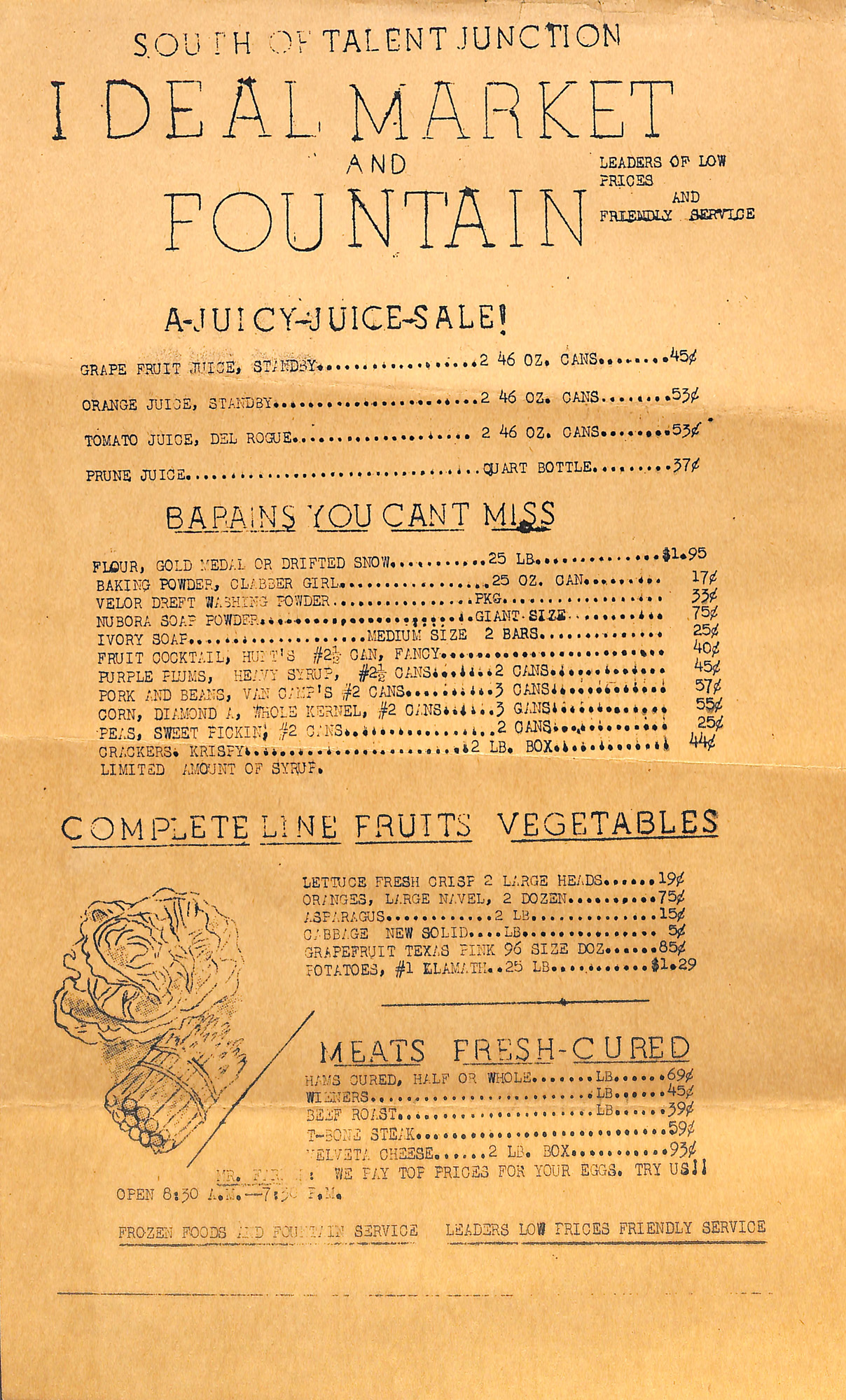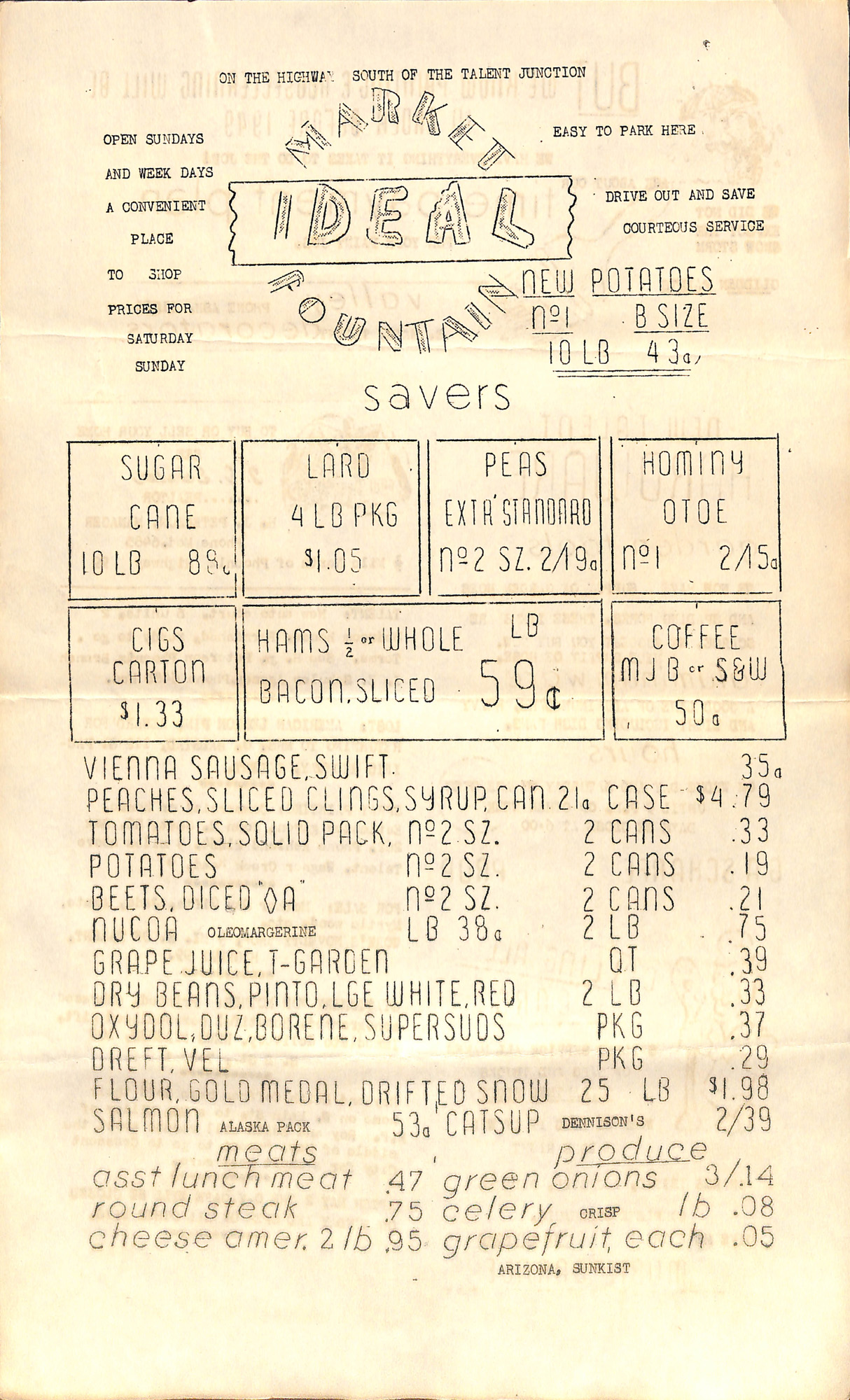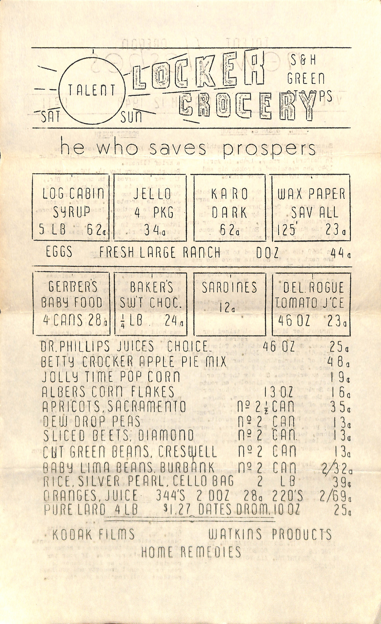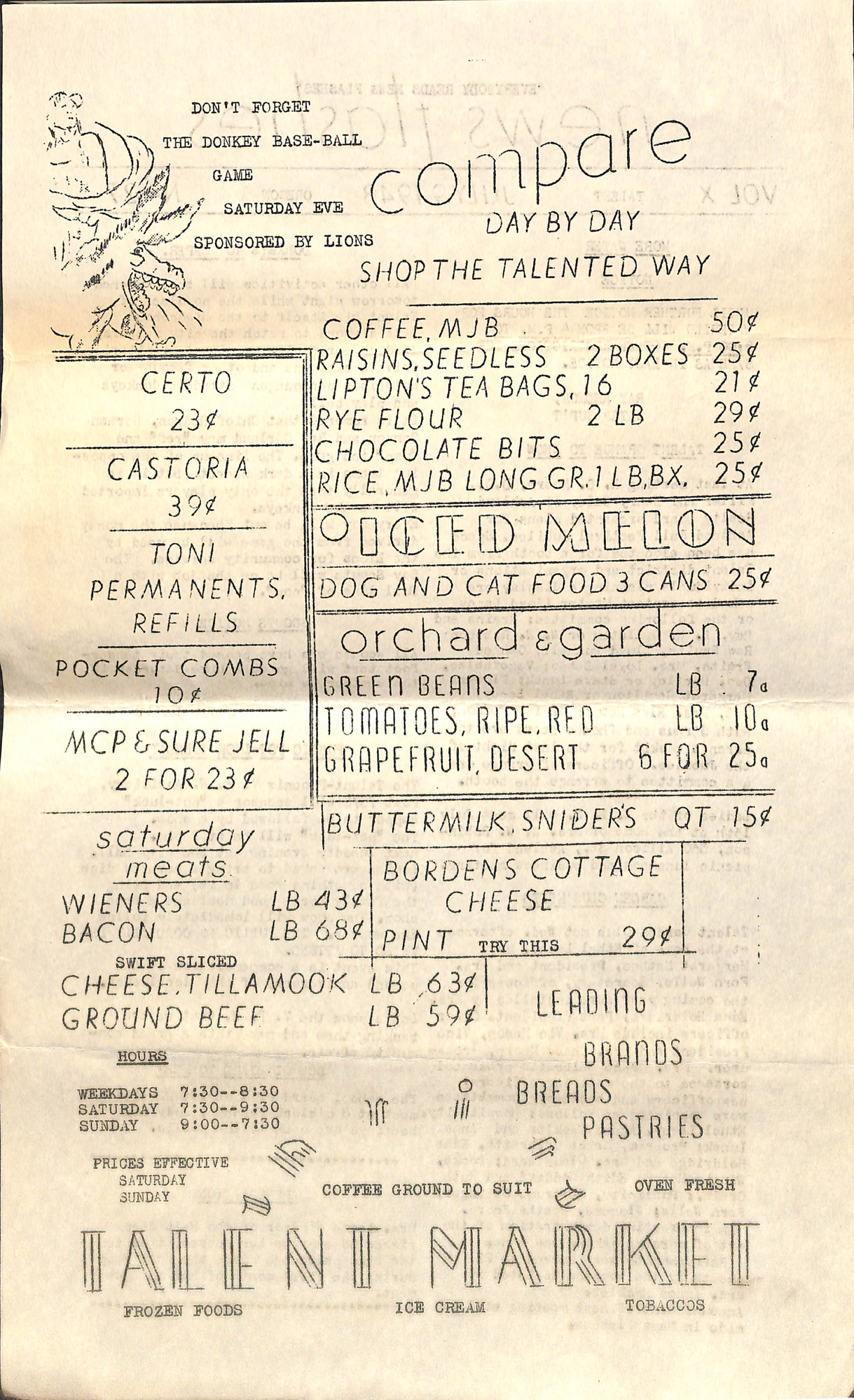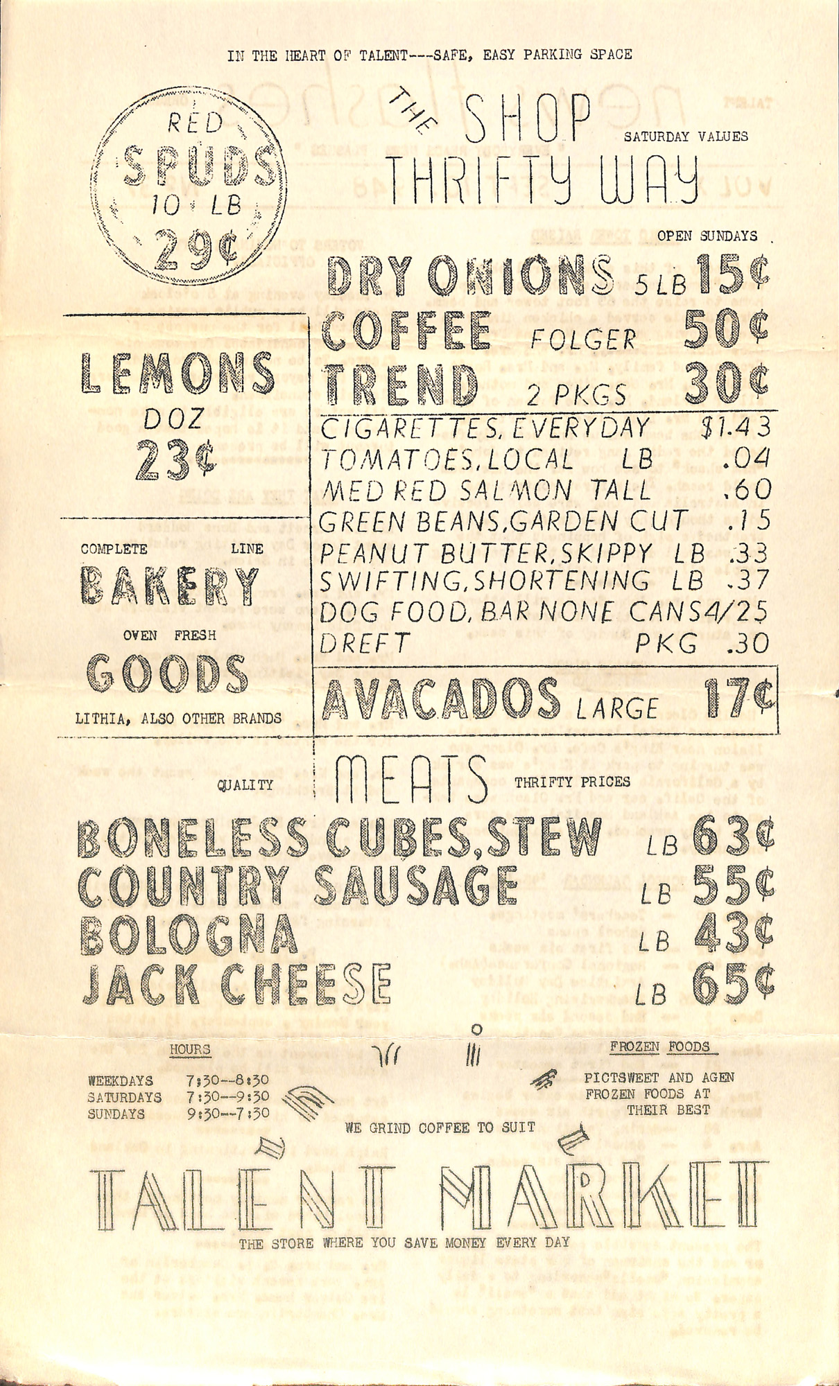 SATURDAY SPECIALS. GROCERY DEPARTMENT JELLO--5¢ pkg. SUGAR 10-lb. bag--50¢ FLOUR, KLAMATH HARD WHEAT 49-lb. bag--$1.69 FLOUR, KLAMATH, GOOD 49-lb. bag--$1.39 VEGETABLE DEPARTMENT SPUDS--50 lbs. #2--39¢ BRINER'S BERRIES 2 boxes--15¢ LEMONS, SUNKIST .doz--28¢ LETTUCE, large heads, 5¢ MEAT MARKET FINE STEAK--15¢ ROASTS--9¢ STEWS--6¢ LAMB CHOPS--15¢ BAKERY DEPARTMENT THAT GOOD HOMEMADE BREAD STILL 3 LOAVES--20¢ Many other treats at popular prices WE CARRY ICE, MEDFORD QUALITY AND PRICES FOR COMPLETE FOOD SERVICE, TRY RAY'S MARKET ----------------------------------------------------------------------------- TRAFFIC & WATER At the recent meeting of the city council, called for the purpose of considering the feasibility of securing more water, a proposition was made by the Talent Transient Camp that the members of the Camp would donate the necessary labor for the construction of a larger and deeper well at the lower city well property. It is planned to dig the well as deep as is necessary to secure an adequate flow of water, after which extensive drifts will be made to secure sufficient reservoir space. At the same meeting of the council it was voted to send for a supply of earwig parasites which are said to be efficacious in destroying the earwigs. It is requested that all owners of bantam chickens keep them penned up as a protection to the parasites…. KID PARTY Mrs. H. Good was hostess at a surprise kitchen shower Tuesday evening, honoring her sister, Miss Ione Bates, who is to be married to Mr. W. Dooms, Friday. The affair was given as a "Kid Party," and all the guests came dressed in an appropriate manner. The kids enjoyed punch and suckers and played kid games until a late hour. Many beautiful gifts were received by the guest of honor. About thirty friends of the guest of honor were present. Talent News Flashes June 23, 1934, now lost. Reprinted in the June 26, 1959 News Flashes -----------------------------------------------------------------------------