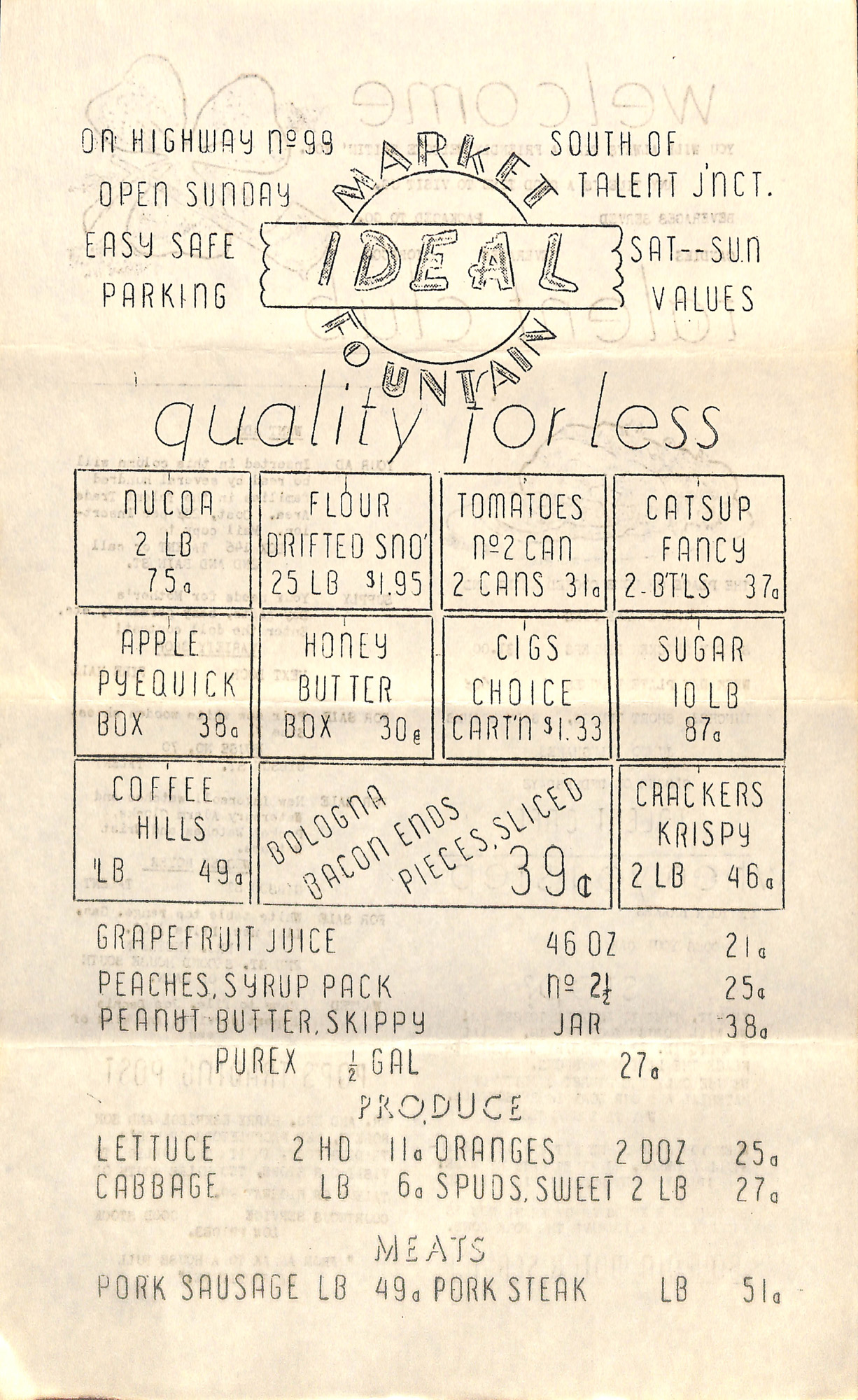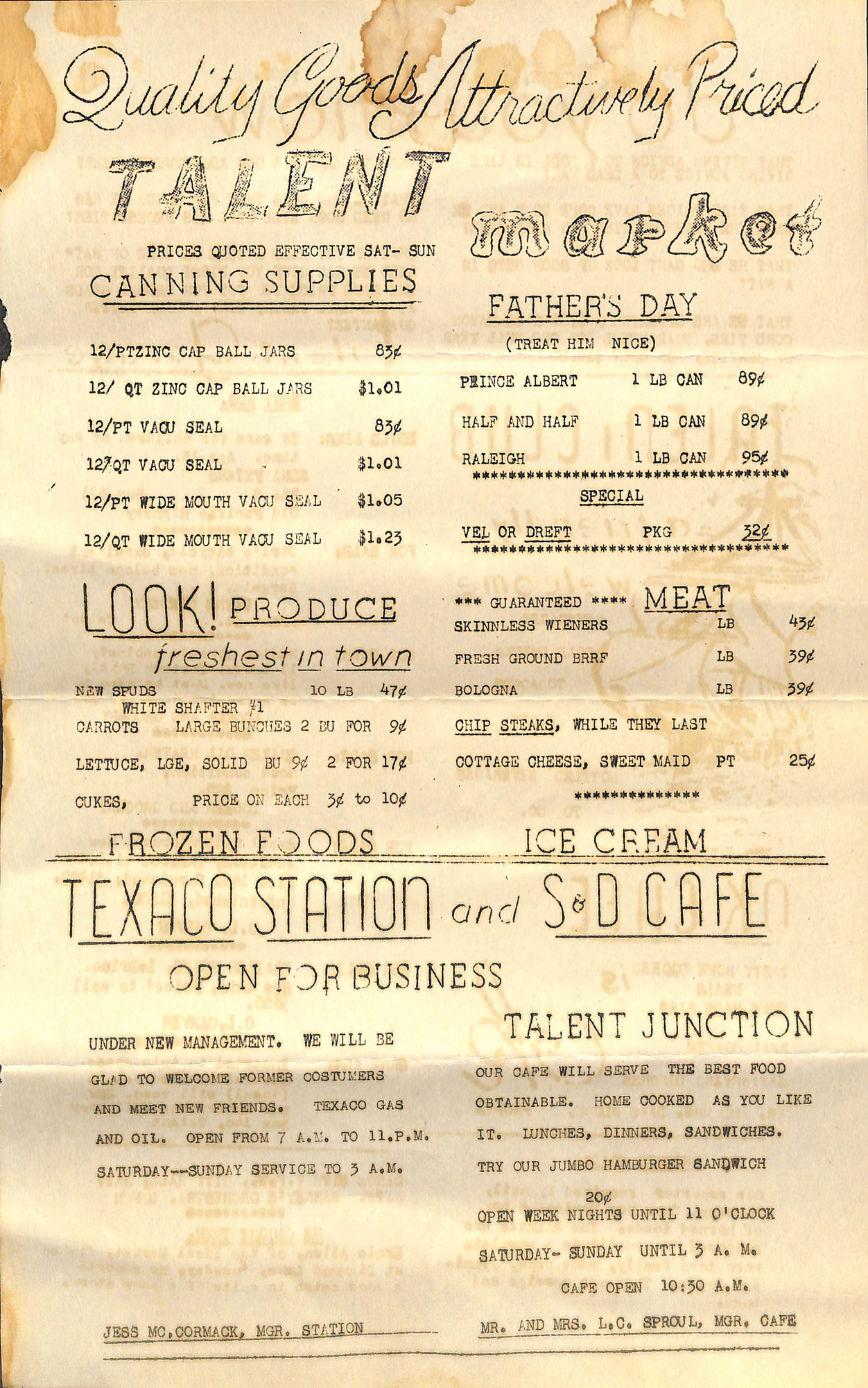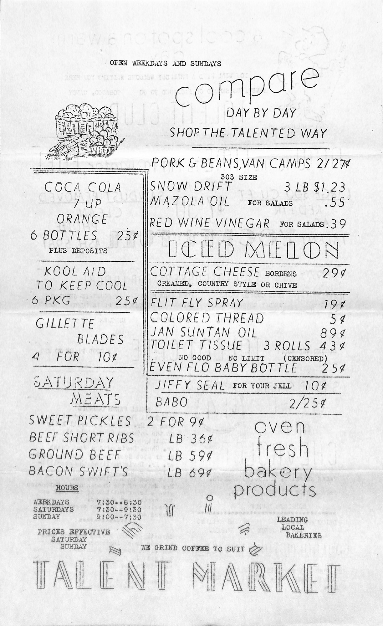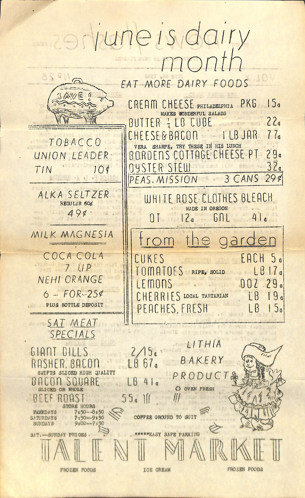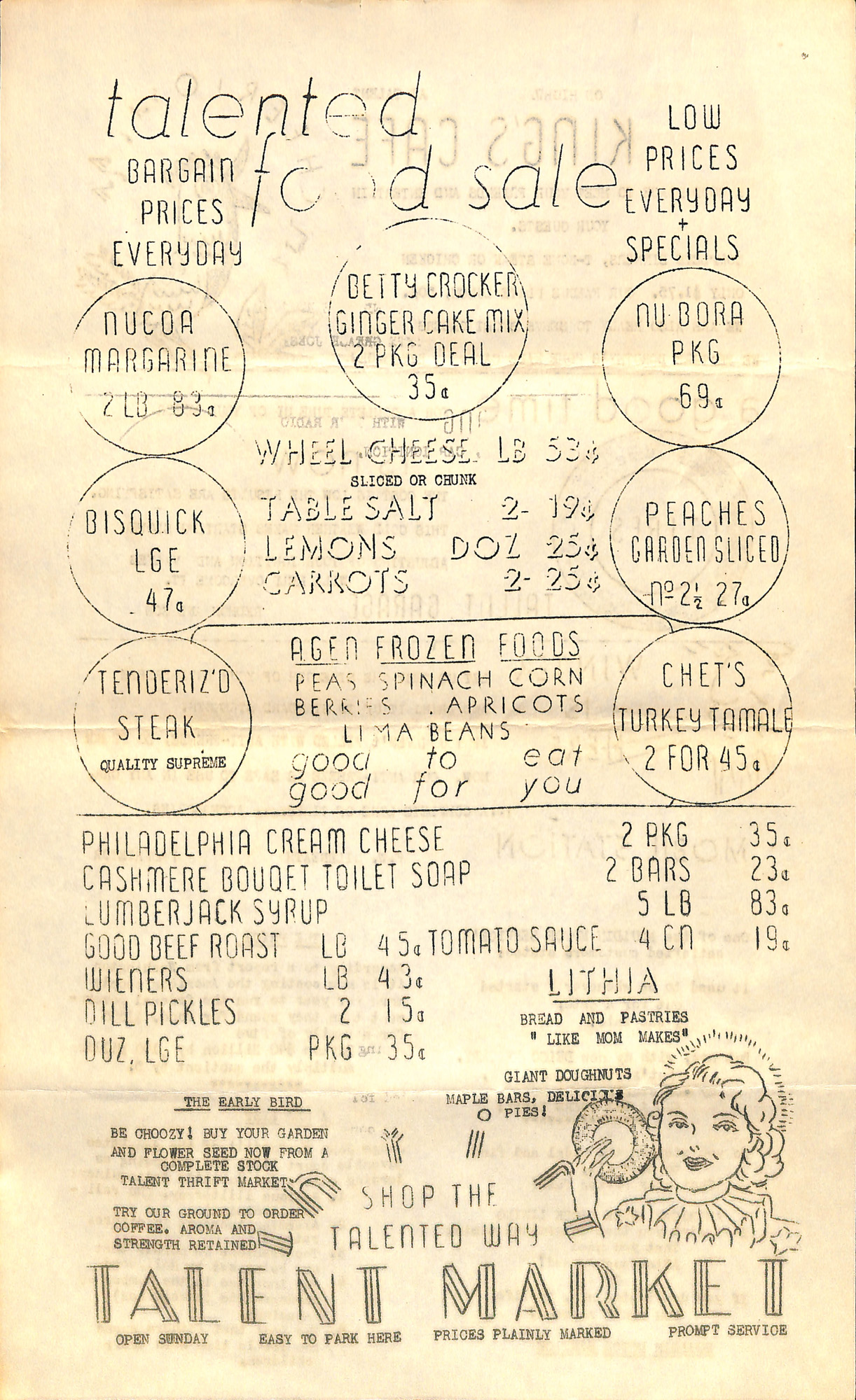 SATURDAY SPECIALS. GROCERY DEPARTMENT JELLO--5¢ pkg. SUGAR 10-lb. bag--50¢ FLOUR, KLAMATH HARD WHEAT 49-lb. bag--$1.69 FLOUR, KLAMATH, GOOD 49-lb. bag--$1.39 VEGETABLE DEPARTMENT SPUDS--50 lbs. #2--39¢ BRINER'S BERRIES 2 boxes--15¢ LEMONS, SUNKIST .doz--28¢ LETTUCE, large heads, 5¢ MEAT MARKET FINE STEAK--15¢ ROASTS--9¢ STEWS--6¢ LAMB CHOPS--15¢ BAKERY DEPARTMENT THAT GOOD HOMEMADE BREAD STILL 3 LOAVES--20¢ Many other treats at popular prices WE CARRY ICE, MEDFORD QUALITY AND PRICES FOR COMPLETE FOOD SERVICE, TRY RAY'S MARKET ----------------------------------------------------------------------------- TRAFFIC & WATER At the recent meeting of the city council, called for the purpose of considering the feasibility of securing more water, a proposition was made by the Talent Transient Camp that the members of the Camp would donate the necessary labor for the construction of a larger and deeper well at the lower city well property. It is planned to dig the well as deep as is necessary to secure an adequate flow of water, after which extensive drifts will be made to secure sufficient reservoir space. At the same meeting of the council it was voted to send for a supply of earwig parasites which are said to be efficacious in destroying the earwigs. It is requested that all owners of bantam chickens keep them penned up as a protection to the parasites…. KID PARTY Mrs. H. Good was hostess at a surprise kitchen shower Tuesday evening, honoring her sister, Miss Ione Bates, who is to be married to Mr. W. Dooms, Friday. The affair was given as a "Kid Party," and all the guests came dressed in an appropriate manner. The kids enjoyed punch and suckers and played kid games until a late hour. Many beautiful gifts were received by the guest of honor. About thirty friends of the guest of honor were present. Talent News Flashes June 23, 1934, now lost. Reprinted in the June 26, 1959 News Flashes -----------------------------------------------------------------------------