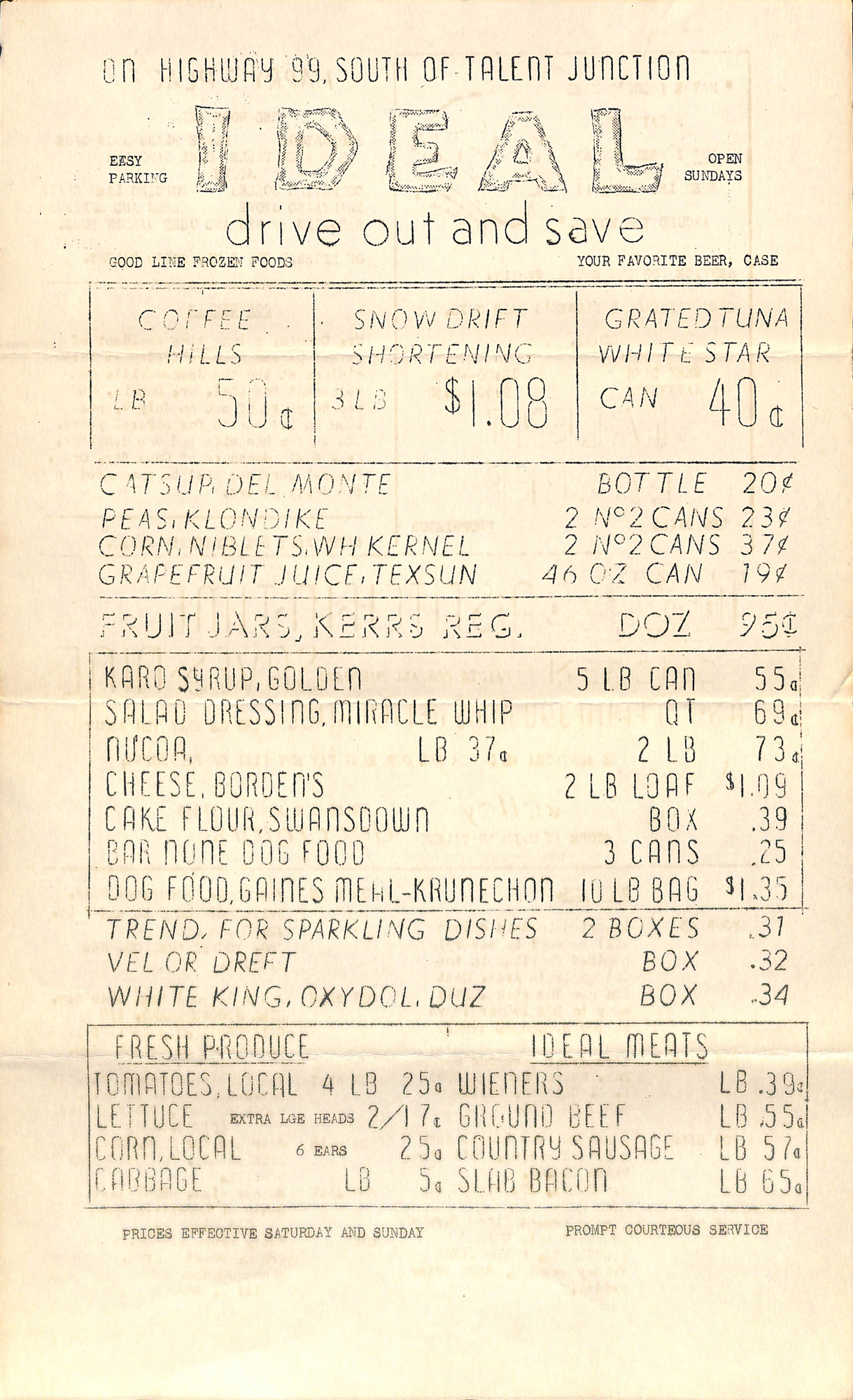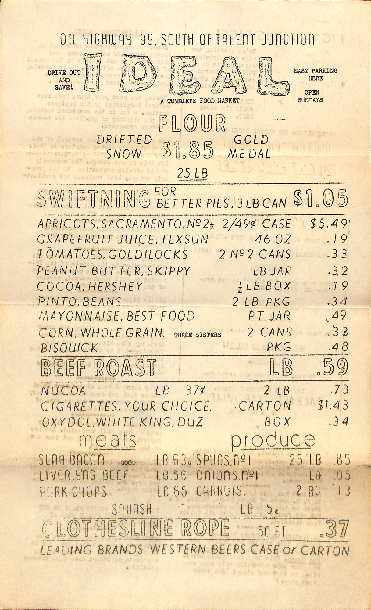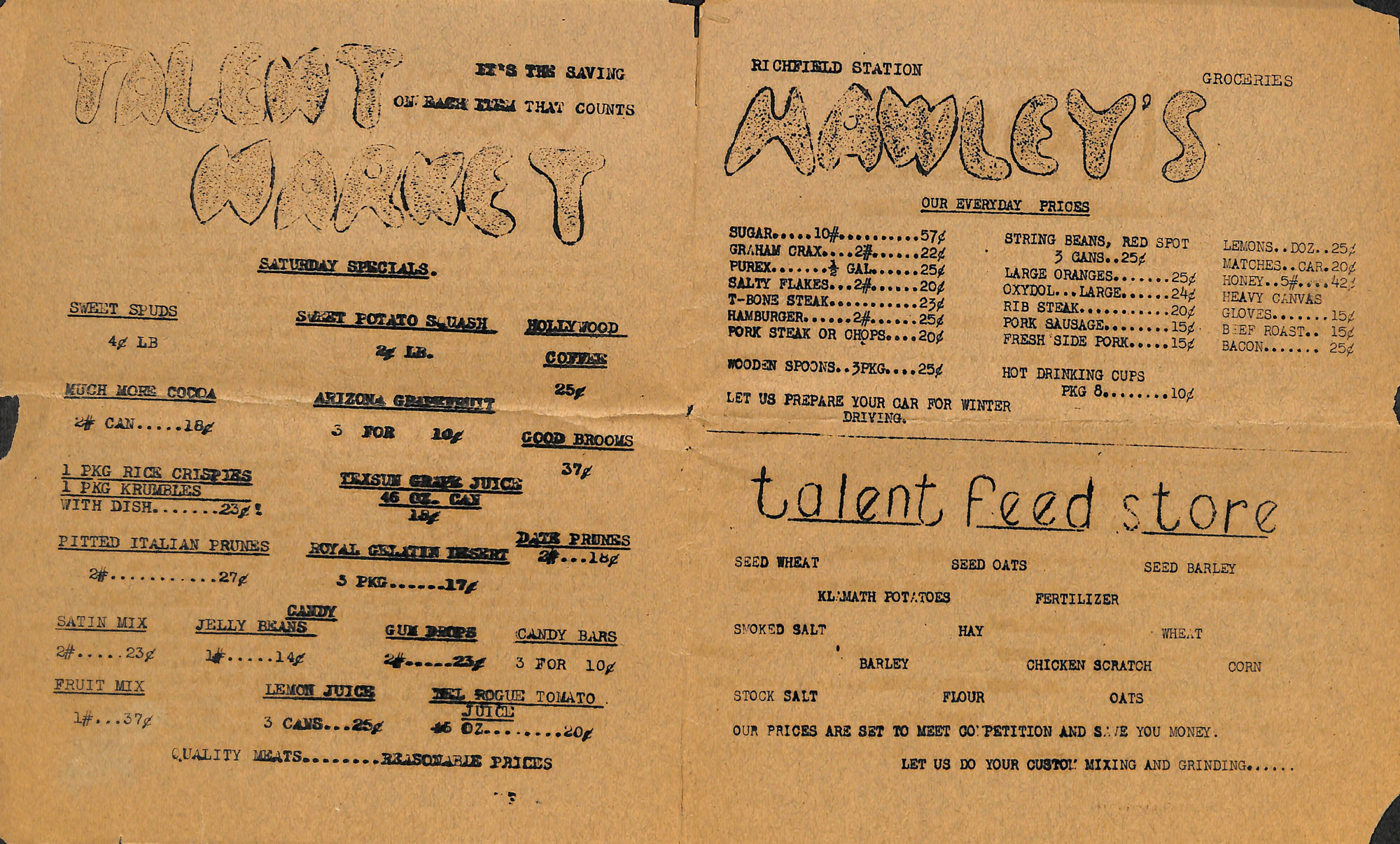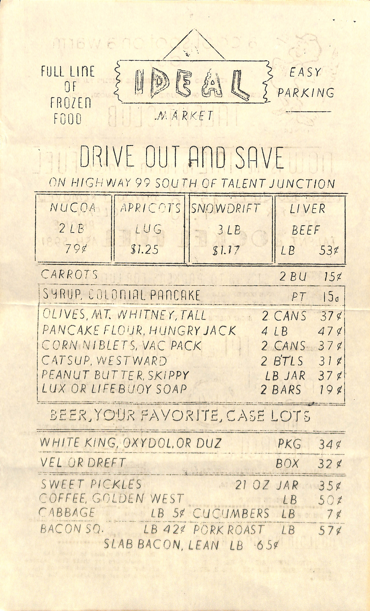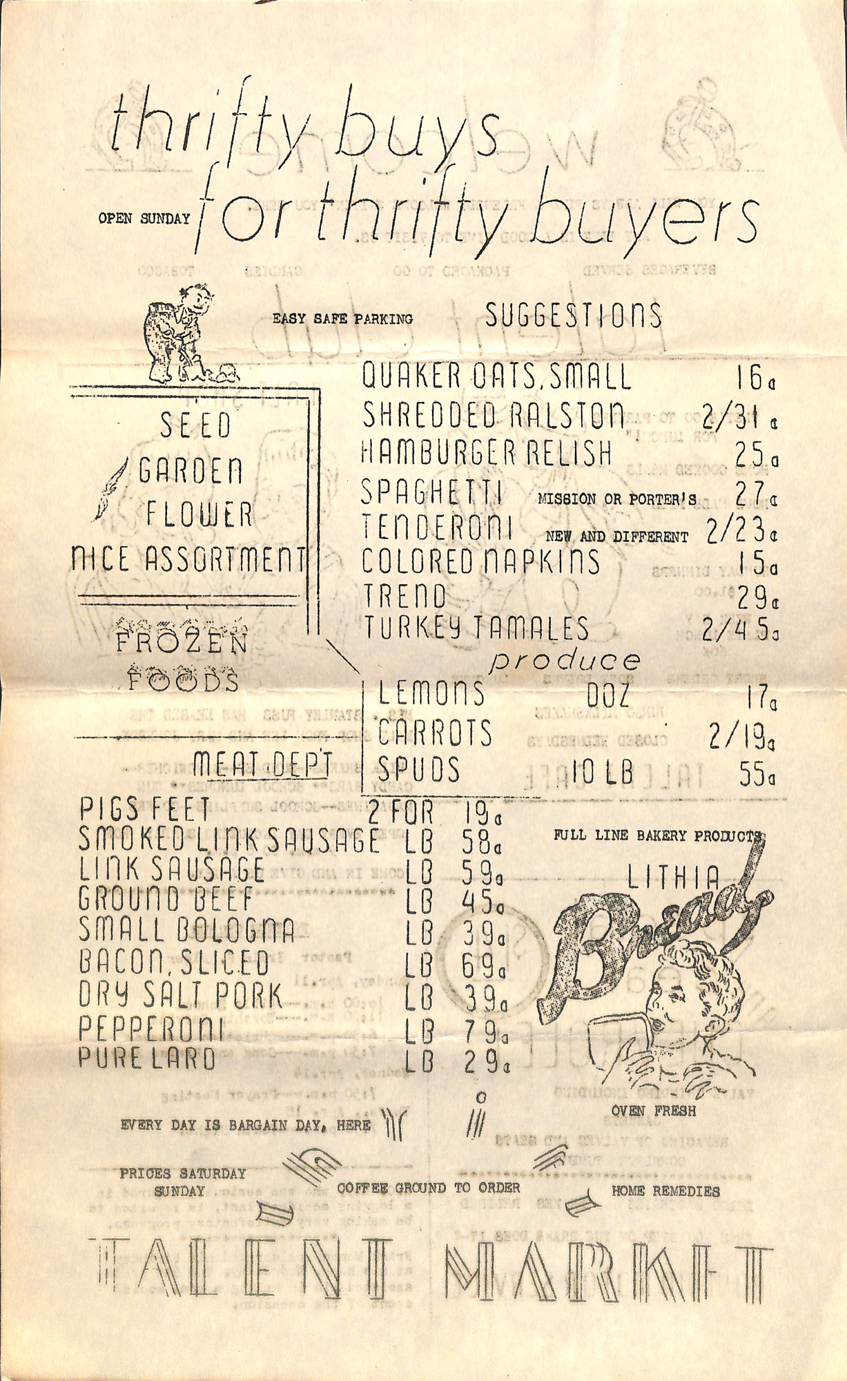 SATURDAY SPECIALS. GROCERY DEPARTMENT JELLO--5¢ pkg. SUGAR 10-lb. bag--50¢ FLOUR, KLAMATH HARD WHEAT 49-lb. bag--$1.69 FLOUR, KLAMATH, GOOD 49-lb. bag--$1.39 VEGETABLE DEPARTMENT SPUDS--50 lbs. #2--39¢ BRINER'S BERRIES 2 boxes--15¢ LEMONS, SUNKIST .doz--28¢ LETTUCE, large heads, 5¢ MEAT MARKET FINE STEAK--15¢ ROASTS--9¢ STEWS--6¢ LAMB CHOPS--15¢ BAKERY DEPARTMENT THAT GOOD HOMEMADE BREAD STILL 3 LOAVES--20¢ Many other treats at popular prices WE CARRY ICE, MEDFORD QUALITY AND PRICES FOR COMPLETE FOOD SERVICE, TRY RAY'S MARKET ----------------------------------------------------------------------------- TRAFFIC & WATER At the recent meeting of the city council, called for the purpose of considering the feasibility of securing more water, a proposition was made by the Talent Transient Camp that the members of the Camp would donate the necessary labor for the construction of a larger and deeper well at the lower city well property. It is planned to dig the well as deep as is necessary to secure an adequate flow of water, after which extensive drifts will be made to secure sufficient reservoir space. At the same meeting of the council it was voted to send for a supply of earwig parasites which are said to be efficacious in destroying the earwigs. It is requested that all owners of bantam chickens keep them penned up as a protection to the parasites…. KID PARTY Mrs. H. Good was hostess at a surprise kitchen shower Tuesday evening, honoring her sister, Miss Ione Bates, who is to be married to Mr. W. Dooms, Friday. The affair was given as a "Kid Party," and all the guests came dressed in an appropriate manner. The kids enjoyed punch and suckers and played kid games until a late hour. Many beautiful gifts were received by the guest of honor. About thirty friends of the guest of honor were present. Talent News Flashes June 23, 1934, now lost. Reprinted in the June 26, 1959 News Flashes -----------------------------------------------------------------------------